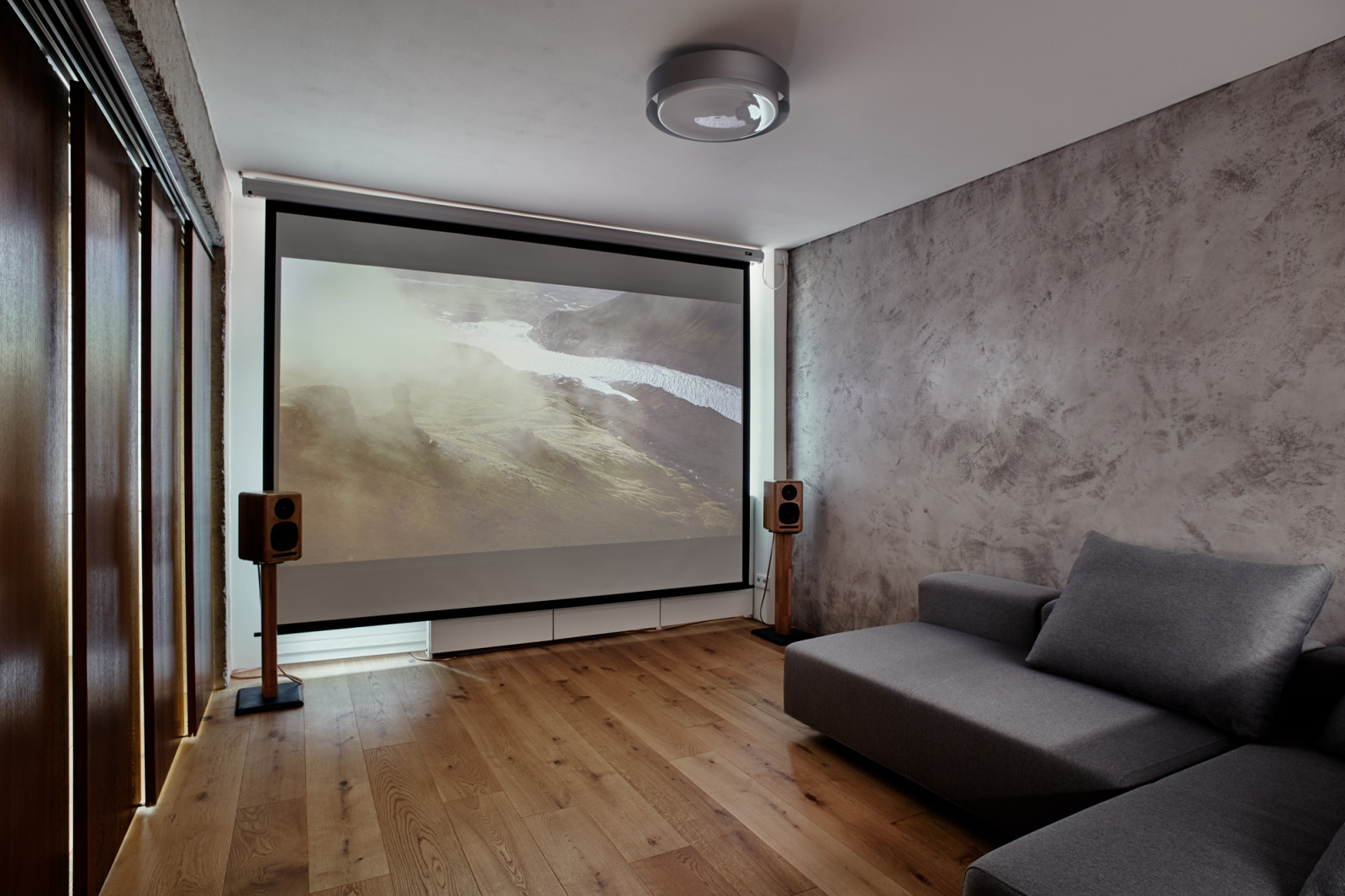 Obývací pokoj je s kuchyní a jídelnou propojen v jeden velkorysý prostor, který se táhne přes celou západní stranu bytu. Reliktem původní dispozice zůstává masivní železobetonová konstrukce, která přirozeně rámuje jednotlivé části jinak otevřeného prostoru. I v tomto případě autorka myslela na požadovanou variabilní dispozici, obývací pokoj je možné od kuchyně oddělit dřevěnou posuvnou stěnou.