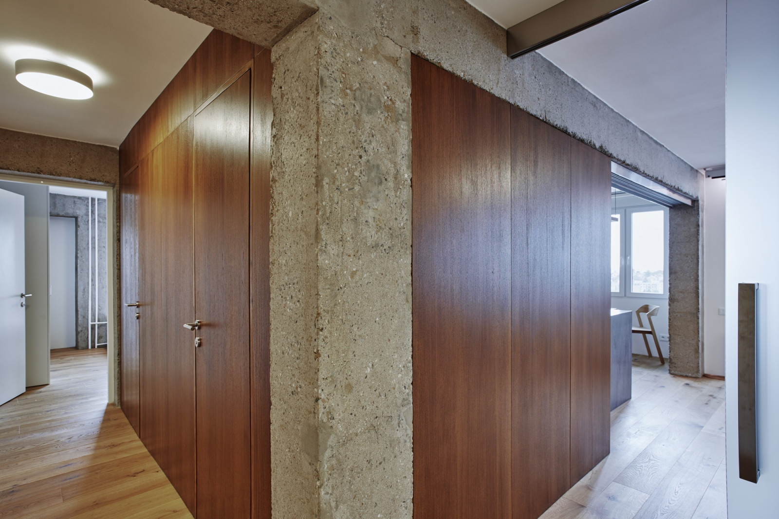 Právě kombinace odhalených hrubých betonových konstrukcí a dřevěných a skleněných prvků je hlavním vizuálním motivem interiéru. „Koncepce materiálového řešení vychází z konstrukčního systému domu. Betonové průvlaky a sloupy jsou přiznány a obroušeny na hrubý beton a opatřeny bezbarvým nátěrem. Obvodové stěny jsou přeštukovány a opatřeny bílou malbou,“ přibližuje architektka.