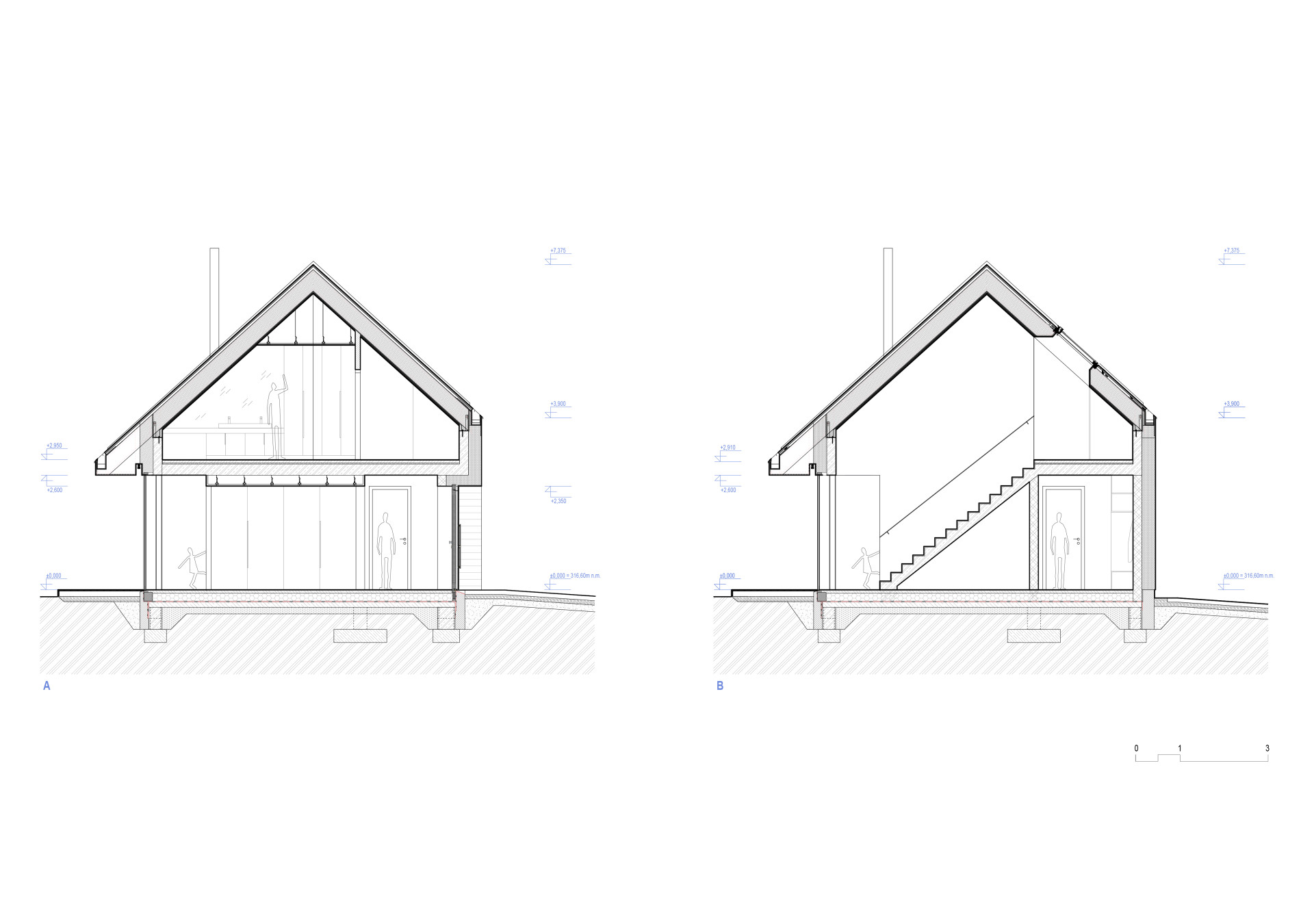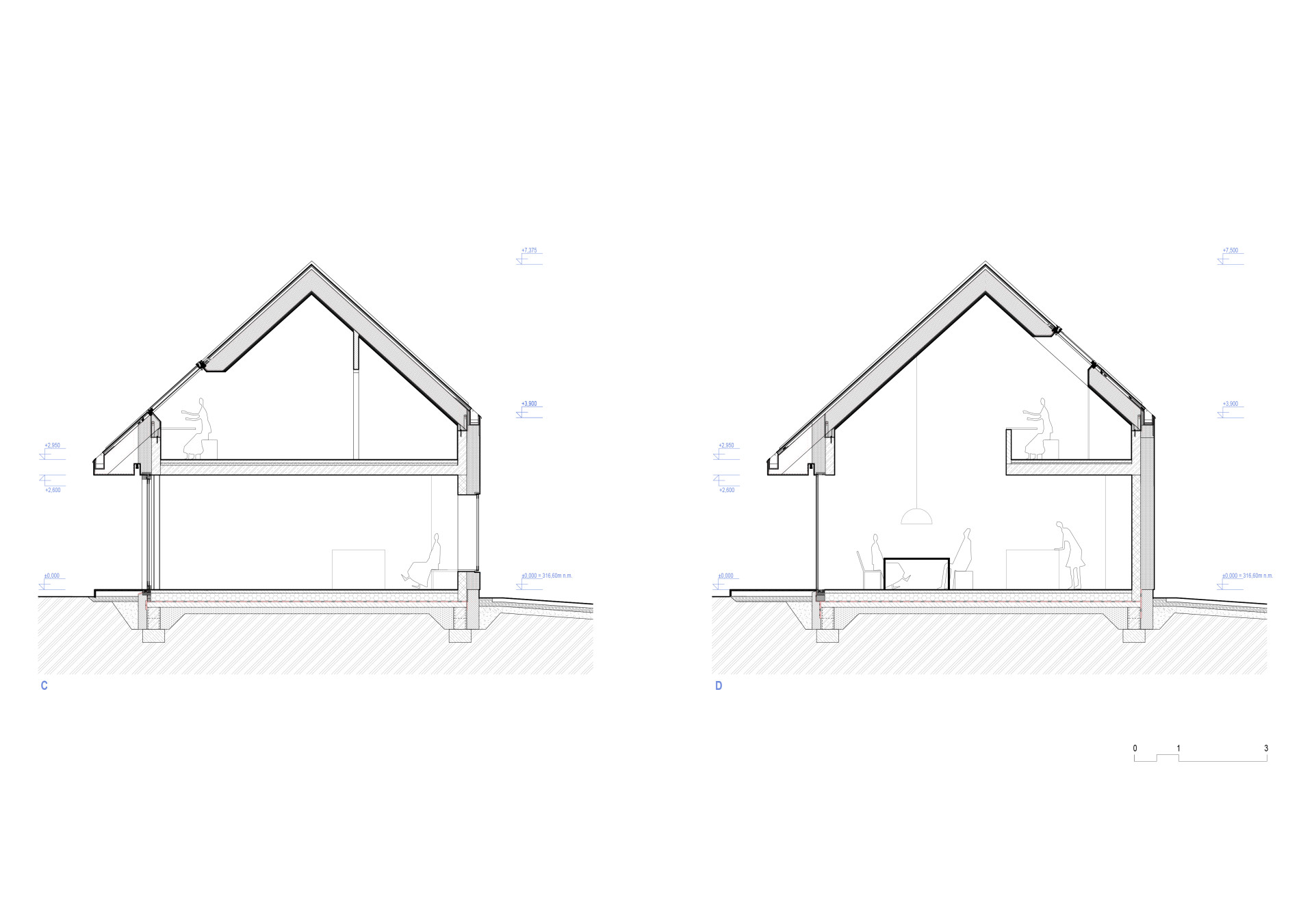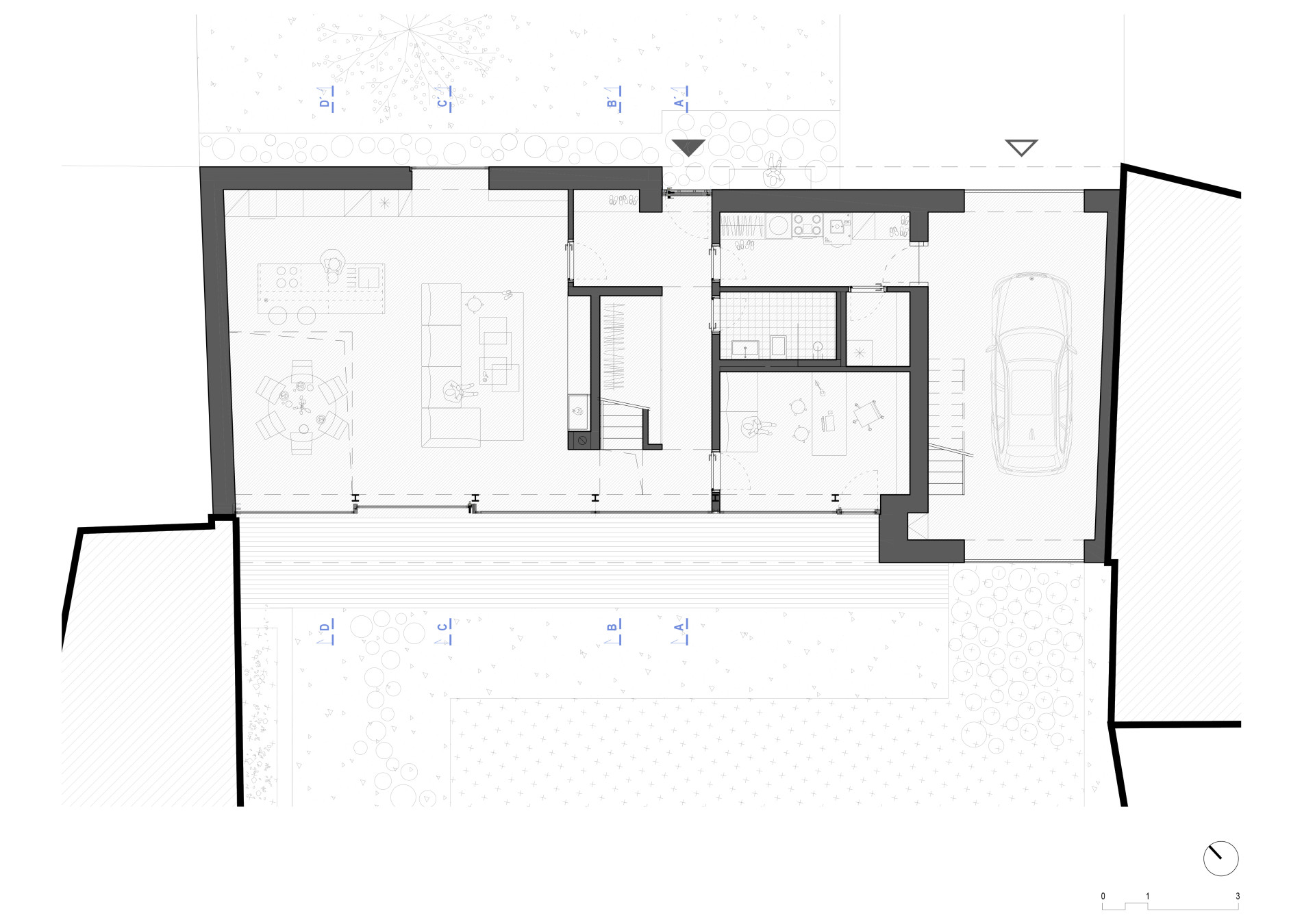 Dům je rozdělený na dva celky – denní a noční zónu. V přízemí funguje společenská část domu s kuchyní, jídelnou, obývací místností. Nachází se zde taky pracovna a technická místnost, skrze kterou se dá projít do garáže.