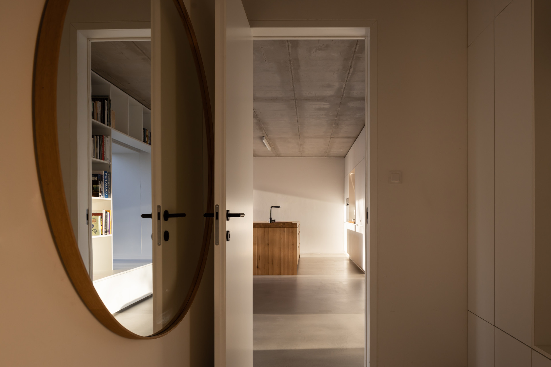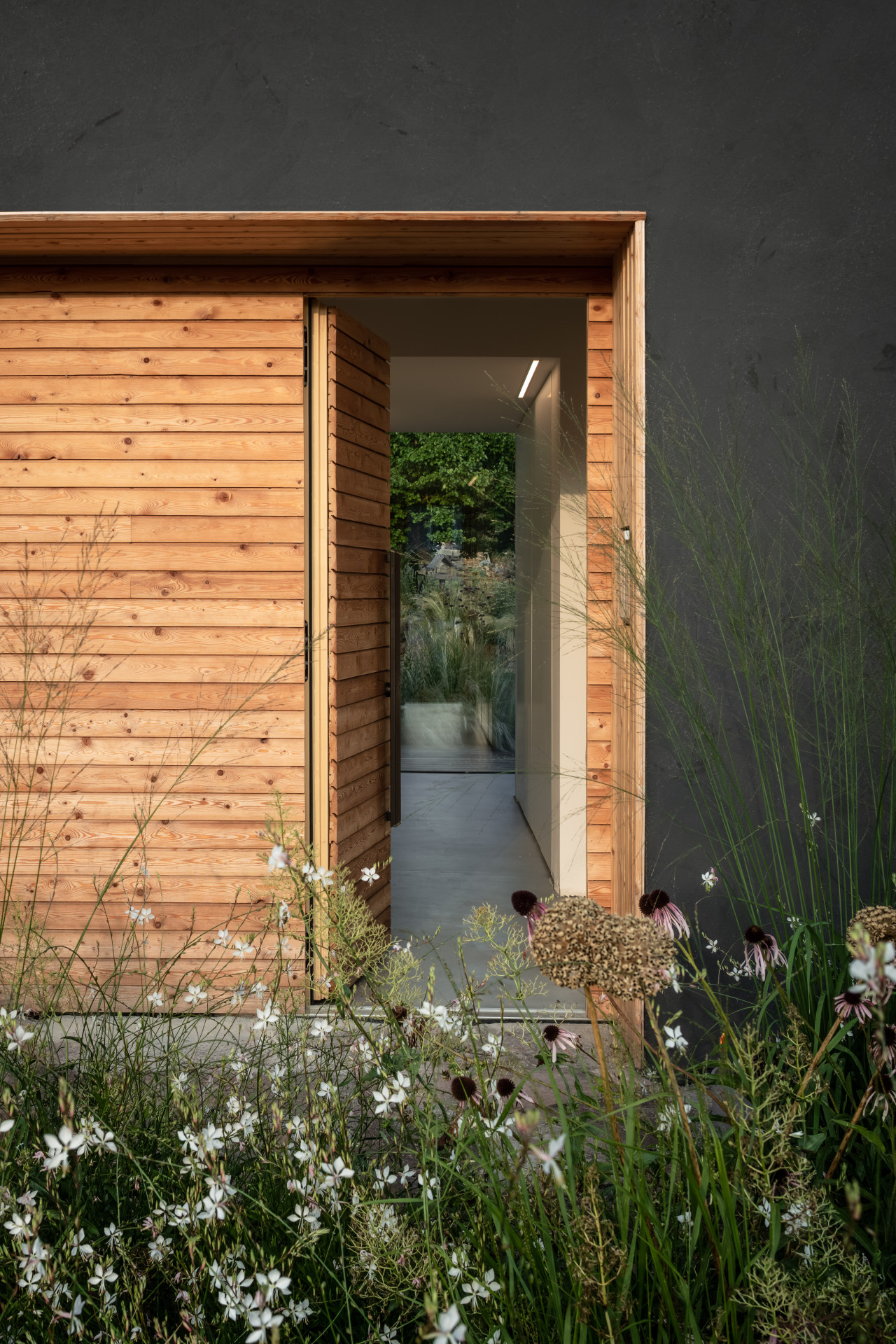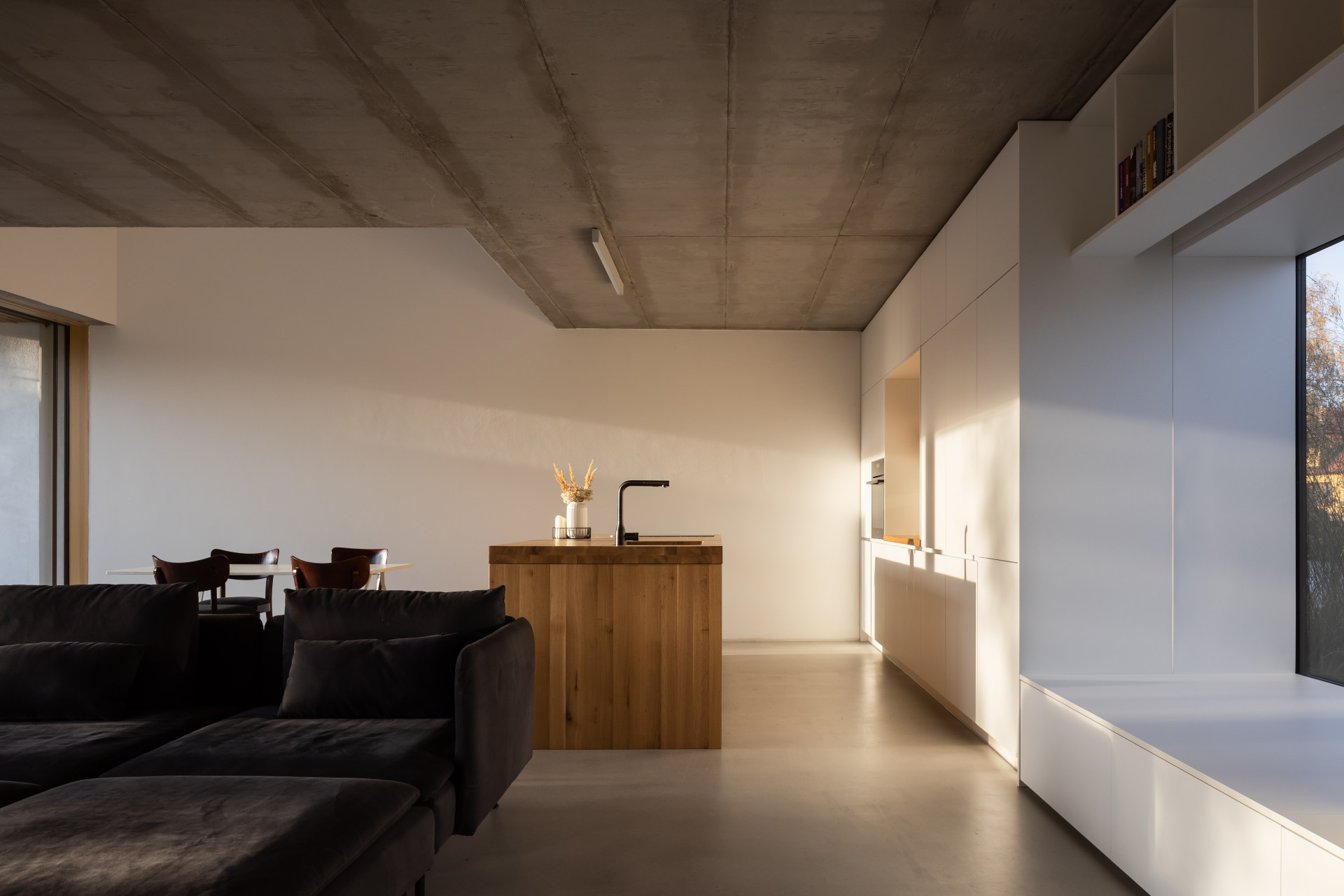 Interiéry jsou vzhledem k tmavé obálce domu pojaty kontrastně. Převážně bílý nábytek doplňují výrazné dubové masivní prvky. Na podlahách jsou cementové stěrky, stropy odhalují pohledový beton a stěny pokrývá bílá výmalba. Všechny pokoje jsou intenzivně prosvětlené. Obývák s kuchyní komunikuje se zahradou velkorysým francouzským oknem. Do podkroví s ložnicemi a dětskými pokoji se sluneční paprsky dostávají skrze střešní okna, ta dodala firma VELUX.