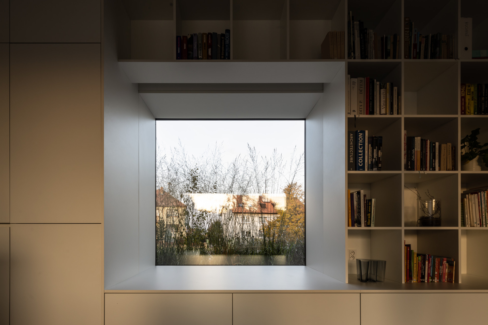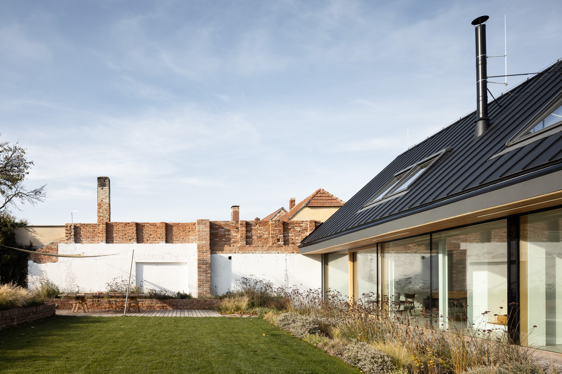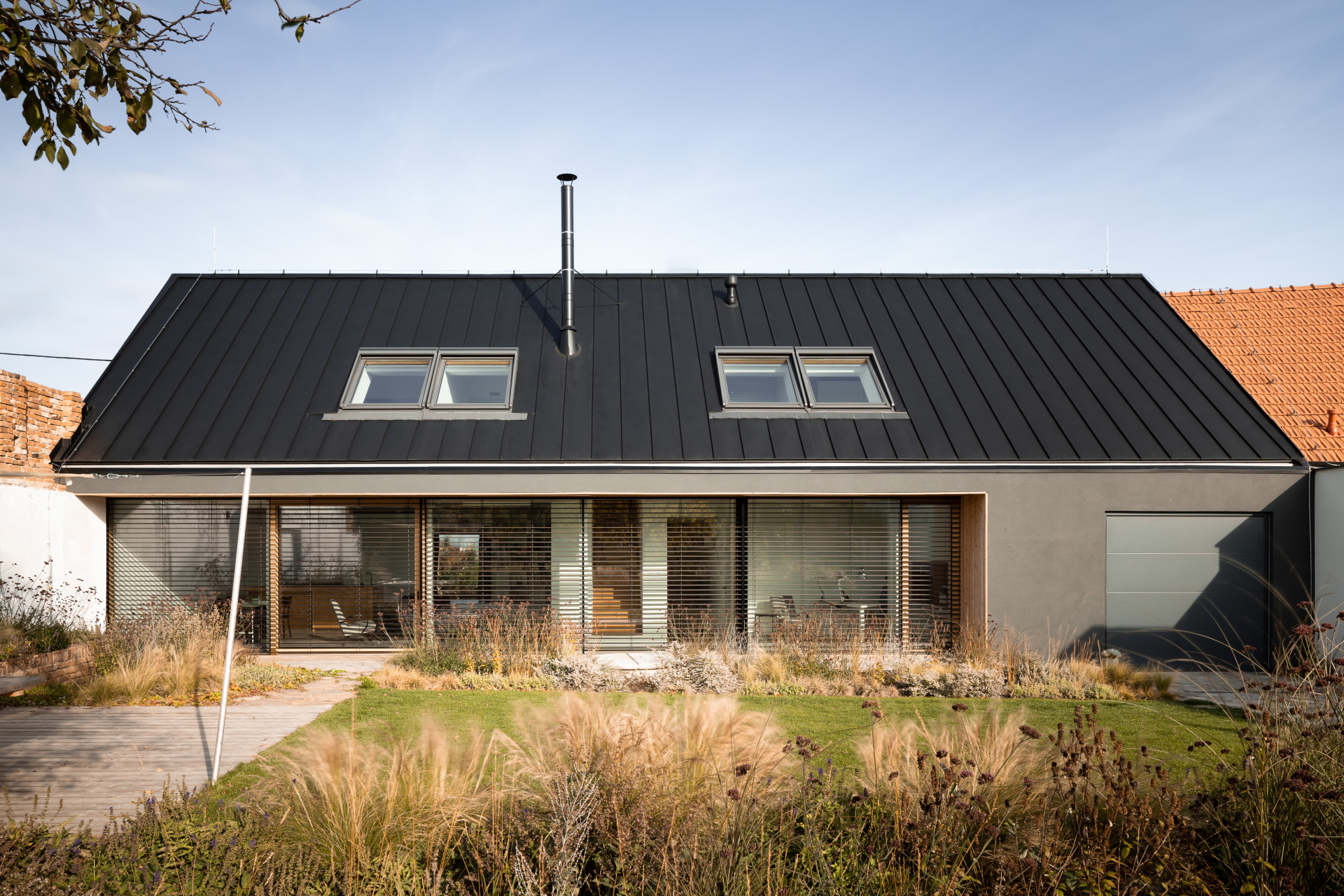 A jak je to s černou barvou a jejím vlivem na teplotní podmínky uvnitř stavby? „Většina částí fasády směřuje na severovýchod a severozápad, tedy místa, kam slunce příliš nesvítí. Na jižní straně je větší část zastoupena skleněnou fasádou, střecha zde má přesah přibližně 1, 2 metru, a navíc máme možnost tuto plochu zastínit externím žaluziovým systémem. Externí zastínění používáme také pro střešní okna na jihozápadní straně směřující do dvora. Střecha i fasáda jsou opatřeny masivním zateplovacím systémem o tloušťce 320 milimetrů. Dům také disponuje systémem pasivního chlazení pomocí tepelného čerpadla. Tento systém samozřejmě přináší pozitiva i negativa, ale pokud se naučíte vše vhodně používat – žaluzie + čerpadlo + řízené větrání – komfort bydlení je nadstandardní. I v oněch parných dnech, které panovaly minulý měsíc, se teplota v domě pohybovala okolo 23−24 °C, a to včetně podkrovní části,“ popisuje své zkušenosti Radek Pasterný na závěr.