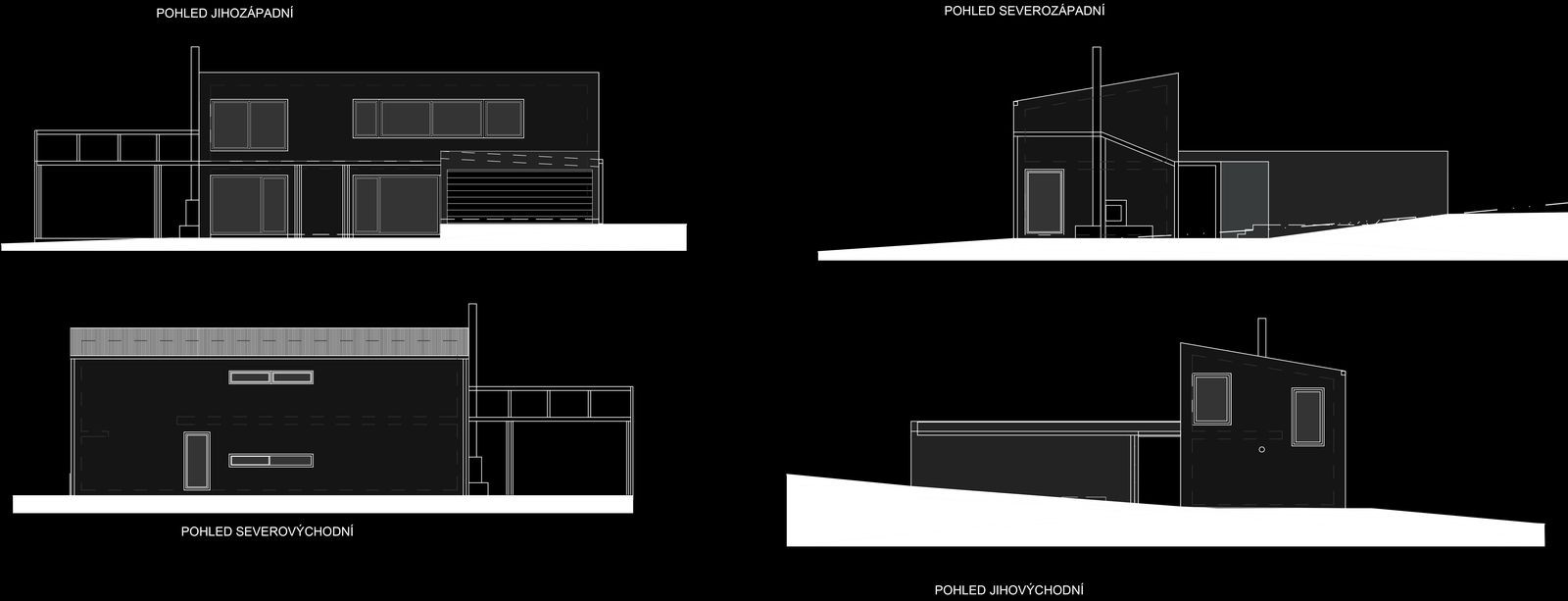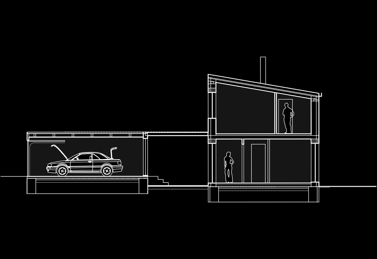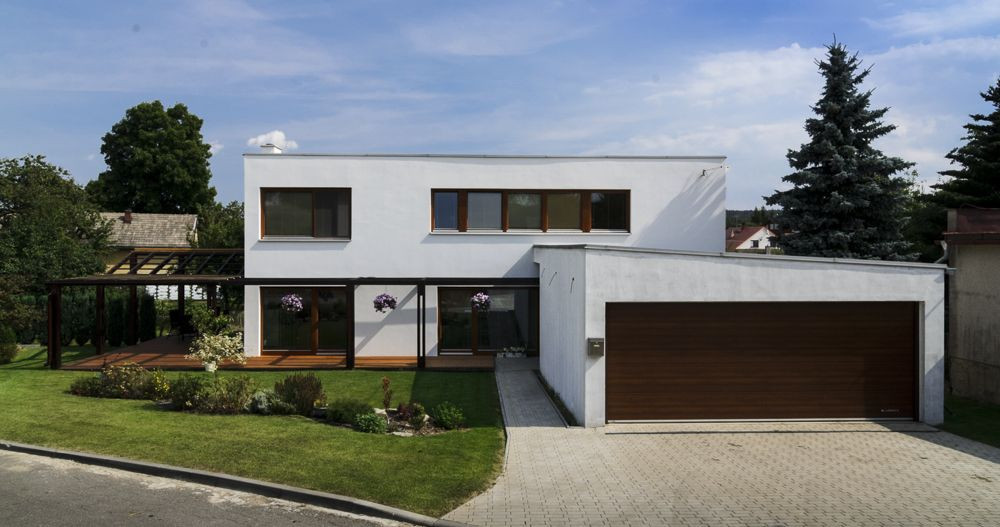 Hlavní objemovou jednotkou je dvoupatrový kvádr, ke kterému je přidružena jednopodlažní garáž. Prostor mezi objekty je využíván jako kryté závětří, ze kterého se snadno dostanete do objektu. V přízemí stavby se nacházejí především komunikace a podstatnou část plochy tvoří i obslužná část domu – toaleta, spíž a technická místnost s plynovým kotlem. Z obytných místností zde najdeme pouze obývací pokoj, kuchyň a jídelnu. Druhé podlaží domu je určeno především pro spánek , nachází se zde ložnice a dva dětské pokoje. Výjimku ovšem tvoří pracovna, která je integrována ve skříni na chodbě.