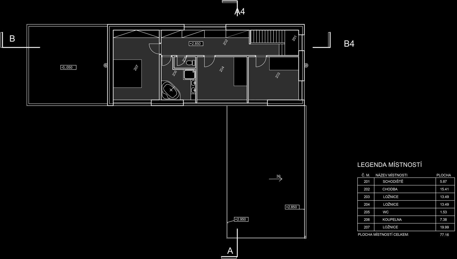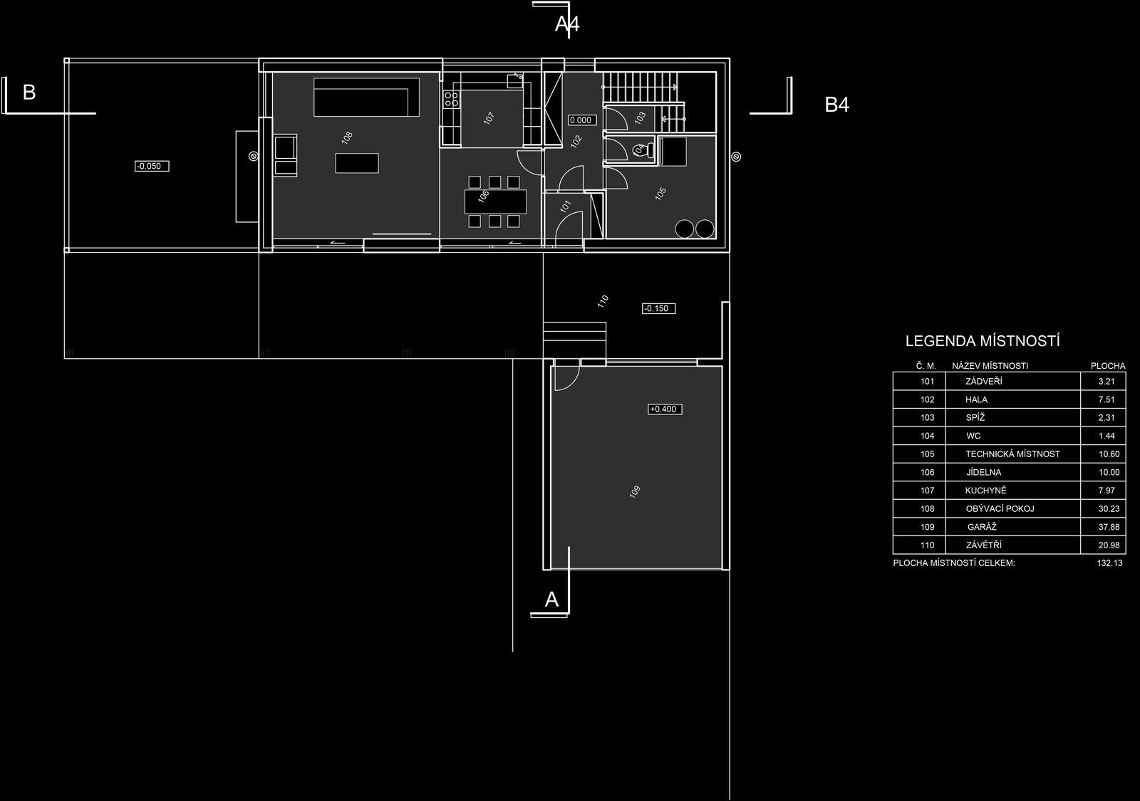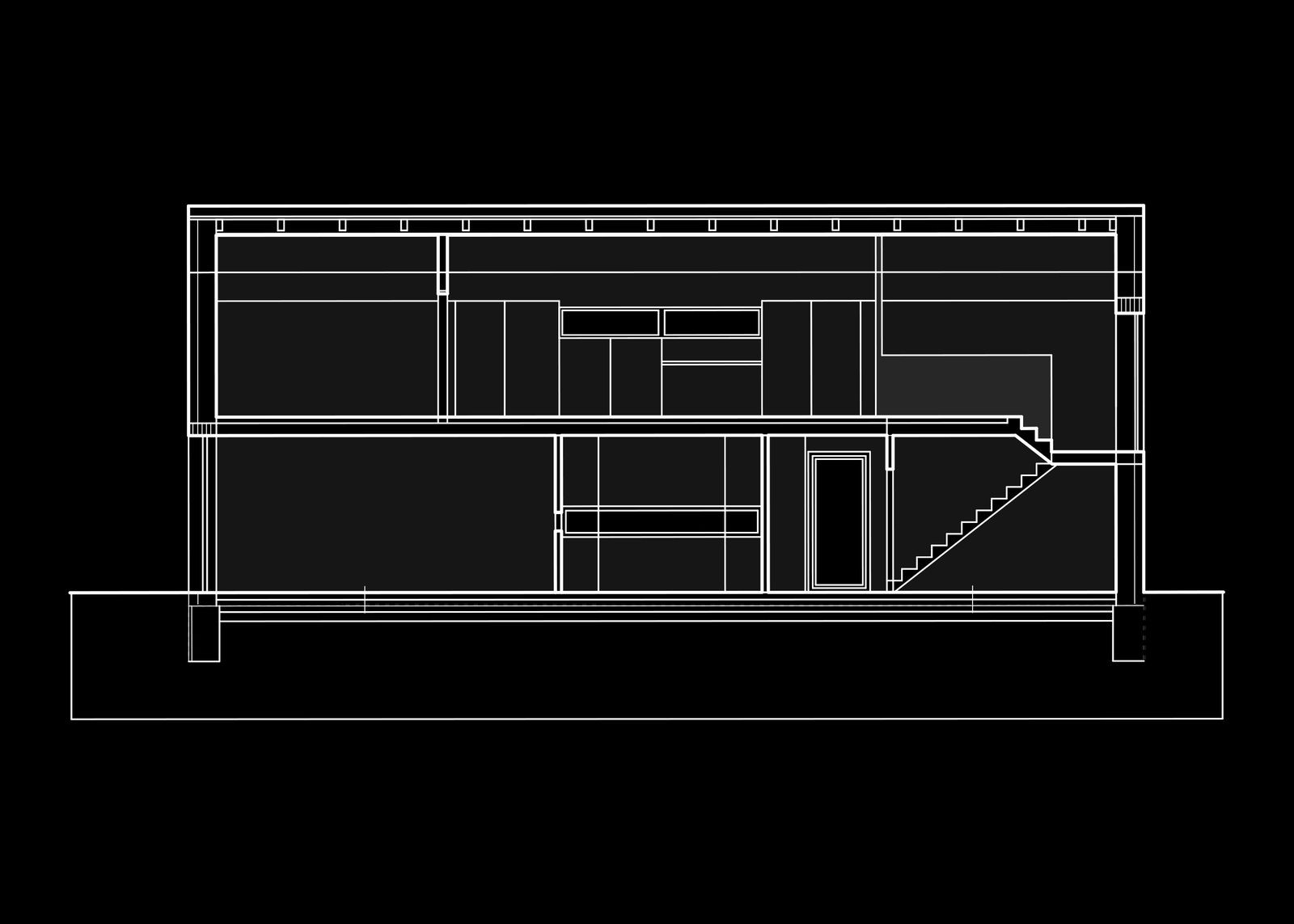 Hlavní objemovou jednotkou je dvoupatrový kvádr, ke kterému je přidružena jednopodlažní garáž. Prostor mezi objekty je využíván jako kryté závětří, ze kterého se snadno dostanete do objektu. V přízemí stavby se nacházejí především komunikace a podstatnou část plochy tvoří i obslužná část domu – toaleta, spíž a technická místnost s plynovým kotlem. Z obytných místností zde najdeme pouze obývací pokoj, kuchyň a jídelnu. Druhé podlaží domu je určeno především pro spánek , nachází se zde ložnice a dva dětské pokoje. Výjimku ovšem tvoří pracovna, která je integrována ve skříni na chodbě.