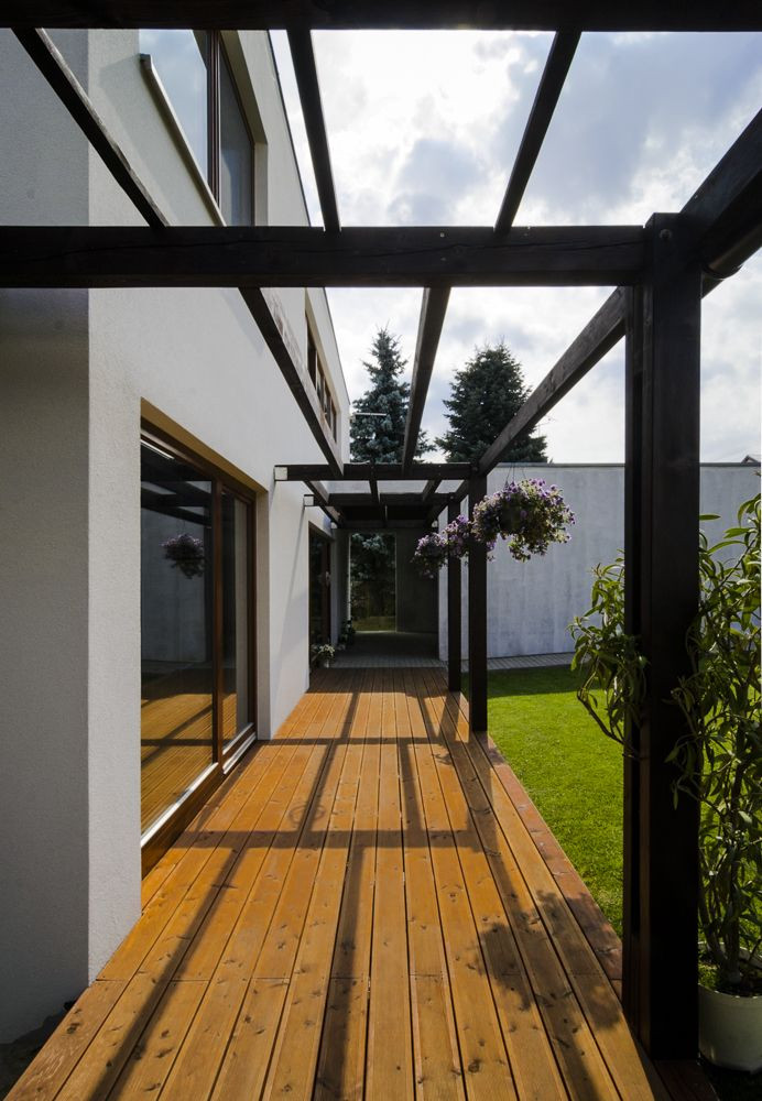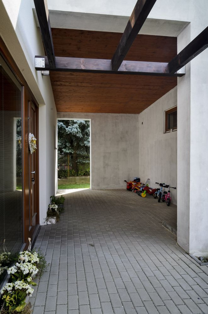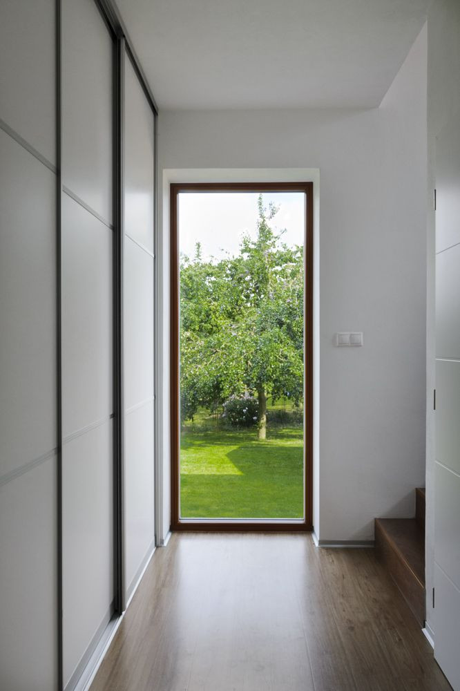 Pro architekty byla také důležitá komunikace interiéru s exteriérem. Při vstupu do vnitřního prostředí domu se vám naskytne výhled skrz celý dům na mladou švestku. Ve druhém patře je z chodby vidět podstatná část vesnice i s kostelem. Na zahradě domu je vytvořena pobytová část s krbem a pergolou.