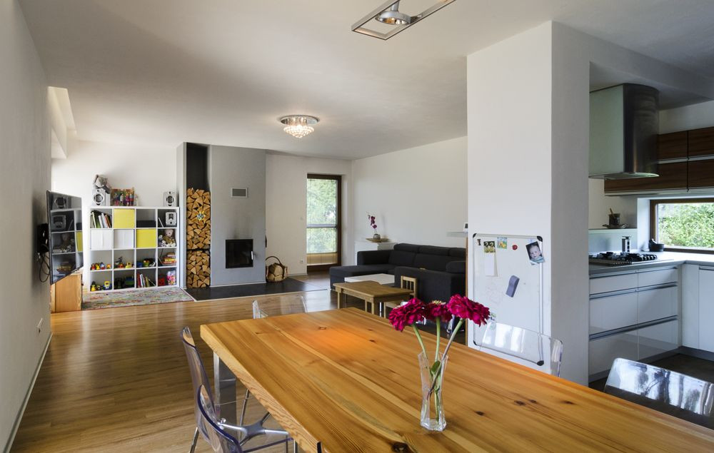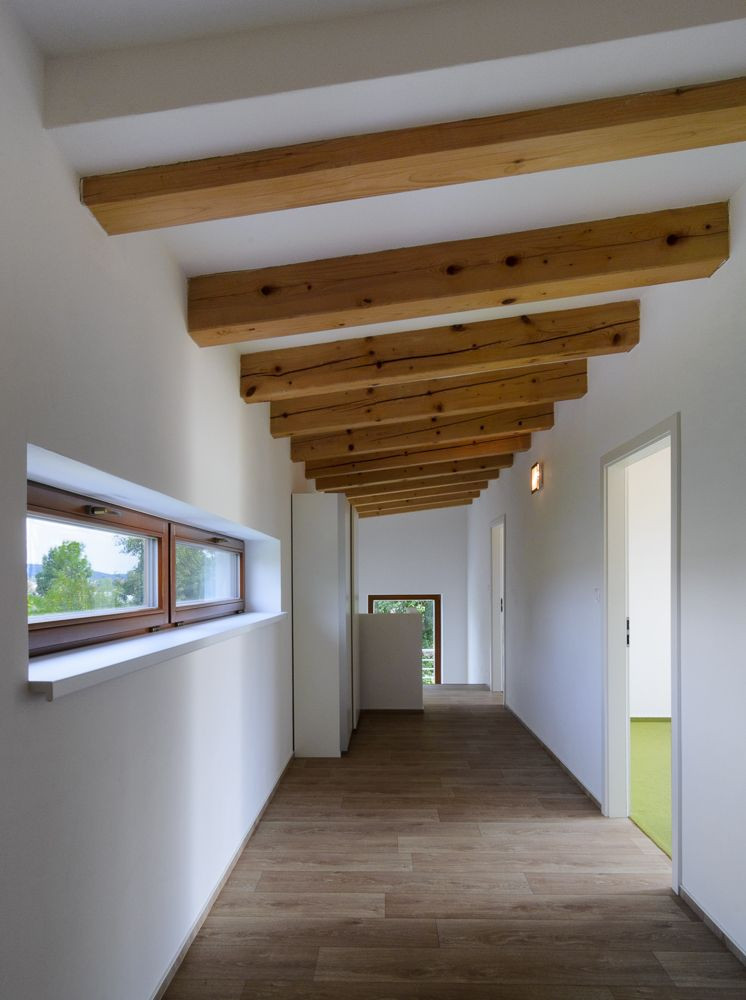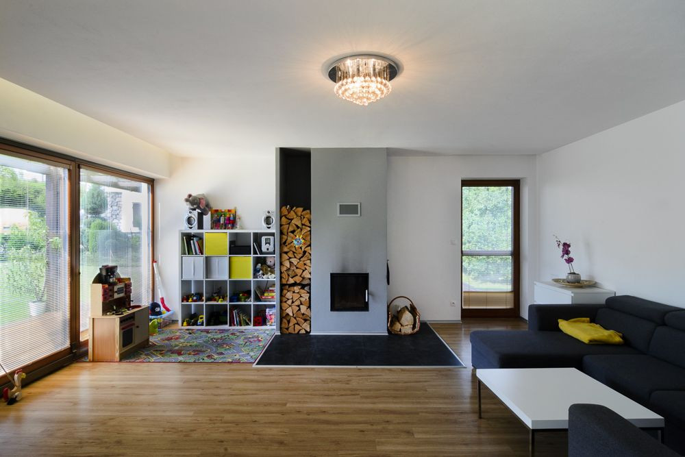 Pultová střecha se stala součástí architektonického řešení, krokve se díky nadkrokevní izolaci staly plnohodnotnou součástí interiéru. Nejsou ovšem jediným dřevěným prvkem, který je na očích, jsou jím také modřínová okna v přírodním odstínu.