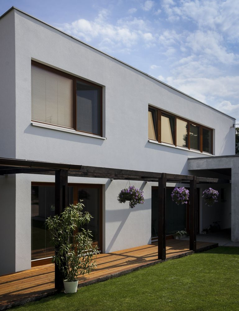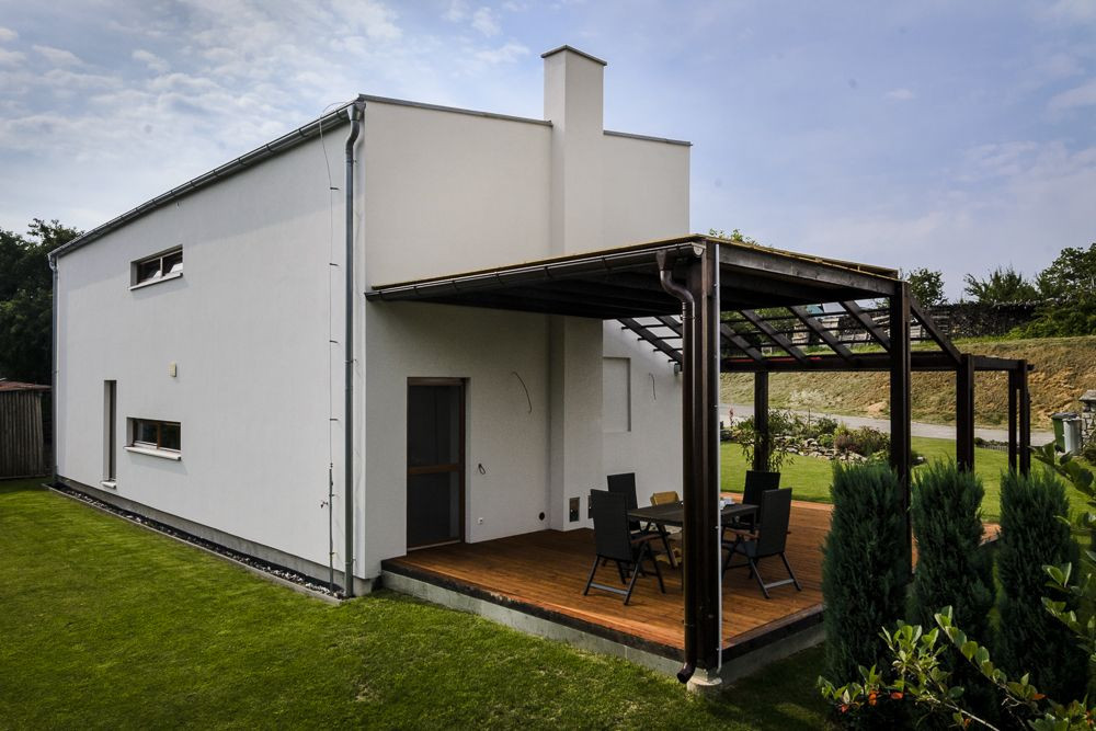 Vytápění domu je zajištěno plynovým kondenzačním kotlem, který rozvádí horkou vodu do podlahového topení. Architekti ale mysleli i na dlouhodobou udržitelnost domu, dešťové vody ze střech jsou zachycovány do retenční nádrže a využívány k zavlažování zahrady.