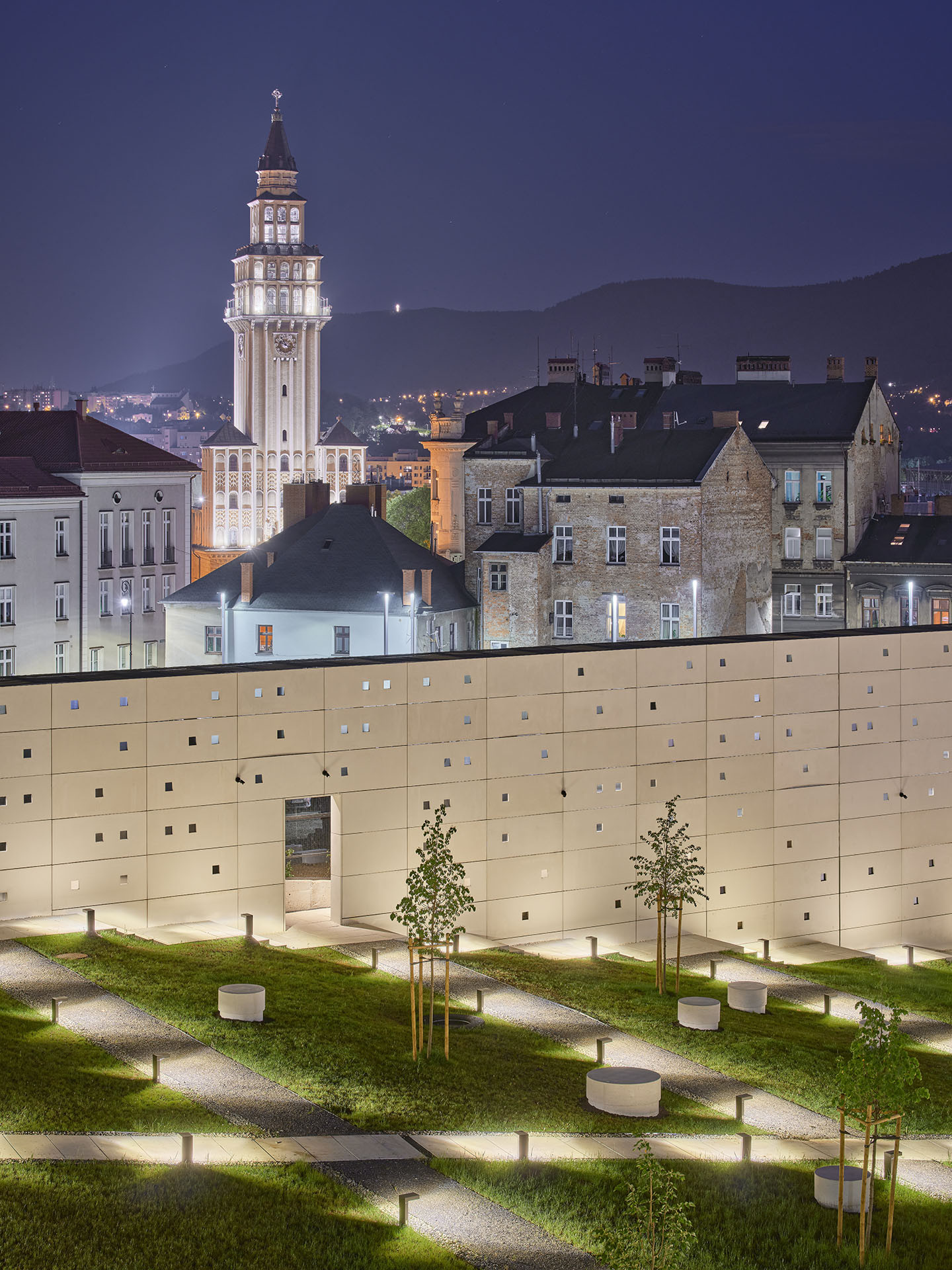 Zadní část pozemku dnes tvoří vydlážděné náměstíčko, které přechází do terasovité zatravněné zahrady. Tento prostor slouží pro venkovní akce i neformální pobyt a právě jeho urbanistické řešení patřilo k aspektům, které porota v soutěži pozitivně vyzdvihla. Bílsko-Bělá realizací Interaktivního centra pohádek a animace OKO získala vizuálně atraktivní architekturu, která se současně vstřícně staví ke svému okolí a uživatelům města.