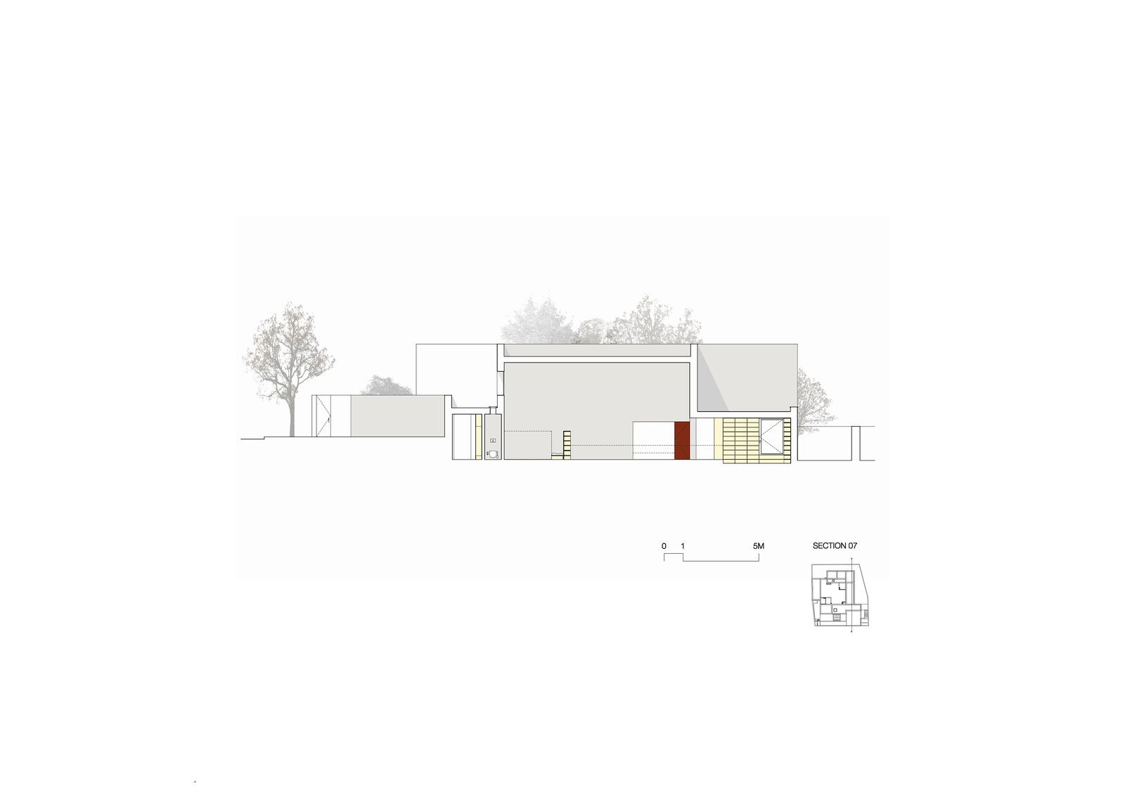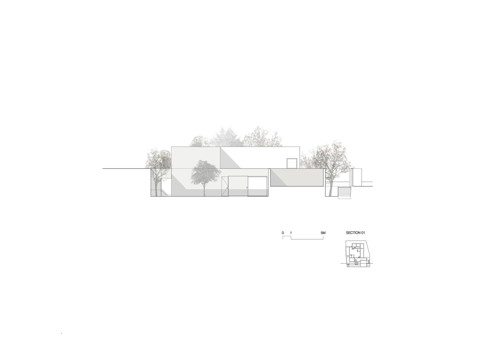 Provedení domu musí nutně reagovat na své nepříznivé okolí, definované přítomností kolejí a souborem nesourodých domů, které parcelu obklopují. Se dvorem stavba navazuje komunikaci prostřednictvím pomyslné stezky, jež spojuje společné prostory na jihu a východě s neveřejnými prostory na severu. Stezka sama potom sestává ze dvou 5 metrů vysokých místností, kuchyně, jídelny a knihovny. V severním koutu domu leží prostory ryze soukromého rázu, ložnice a koupelna