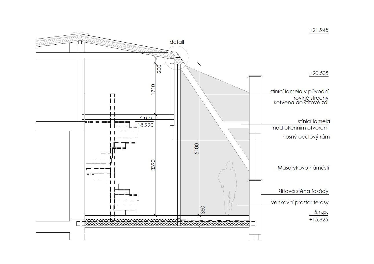 Druhým, neméně zásadním krokem je nové využití pátého a šestého podlaží, původně sloužících „jen“ jako ateliér a půda, na prostory k bydlení. Za tím účelem bylo nutné pozměnit formu střechy. Zkoumáním kontextu a kvalit samotného objektu bylo nalezeno řešení, které nepoškodilo historické hodnoty. Původní secesní fasáda, díky které byl dům prohlášen za kulturní památku, zůstala netknuta, stejně tak dominantní štít. Forma mansardové střechy byla rovněž dodržena, objem domu také zůstal zachován. Původní konstrukci ale nahradila celoprosklená stěna, kterou stíní lamely umístěné do stávající střešní roviny. Vzniklý loftový prostor je stejně jako kdysi přístupný z pátého podlaží, ve vlastním loftu jsou potom umístěny ještě vnitřní schody.