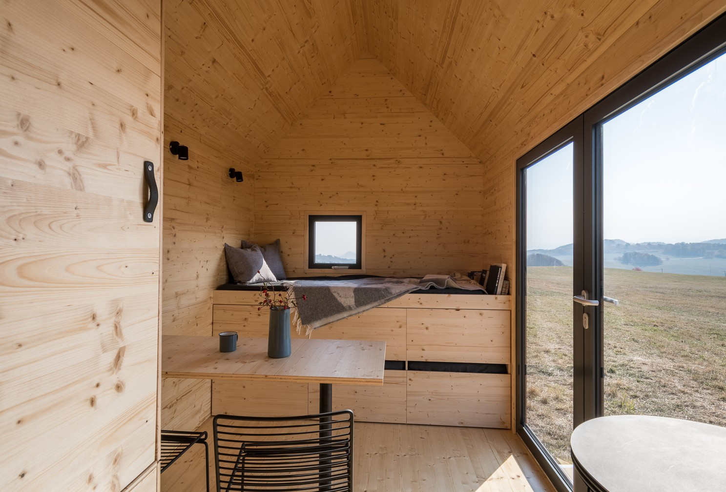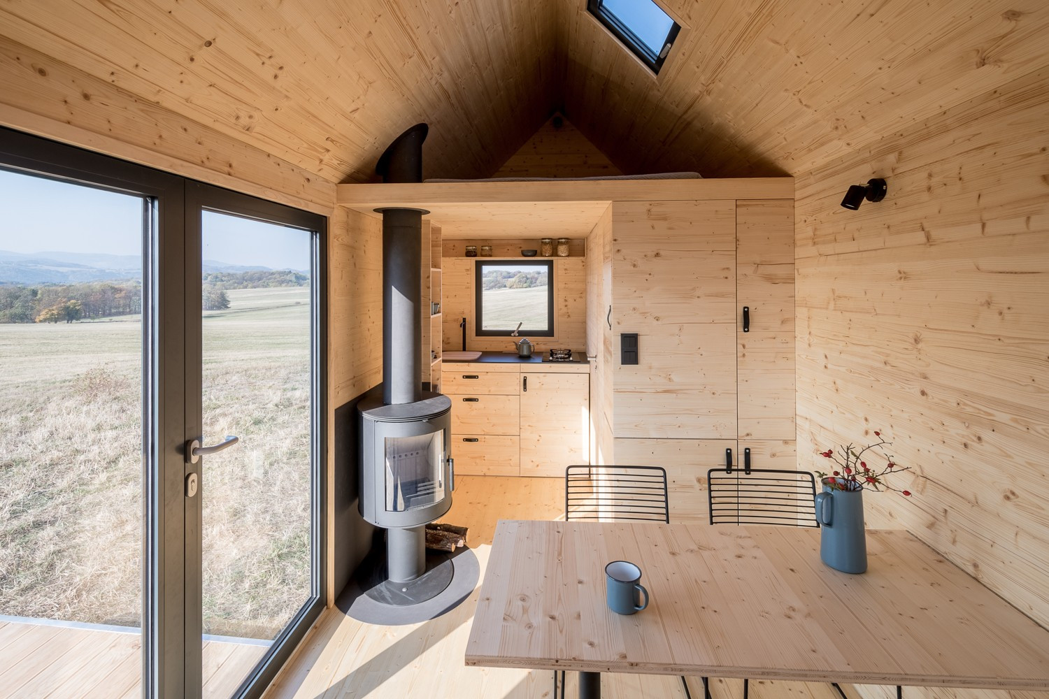 Dům je promyšlen do posledního nýtku. Každý milimetr prostoru je vyřešen tak účelně, že do něj sbalíte byt o velikosti 2+kk. Pomocí polohování vestavěného nábytku se může přizpůsobit dispozice různým funkcím, na vyvýšeném lůžku v přízemí s dvěma řadami výsuvných šuplíků se po rozložení vyspí dva lidé a nahoře v patře je ještě manželská postel. Plně vybavená kuchyň má dvě plynové plotýnky, nerezový dřez či vestavěné elektrické zásuvky pro další spotřebiče. Okna se vyklápějí ven, aby neubírala prostor uvnitř, plnohodnotná koupelna má sprchový kout, umyvadlo a chemickou toaletu. A srdcem domečku jsou krbová kamna na dřevo. Sklopná terasa přidá k užitné ploše interiéru (15 metrů čtverečních) další 4 metry.