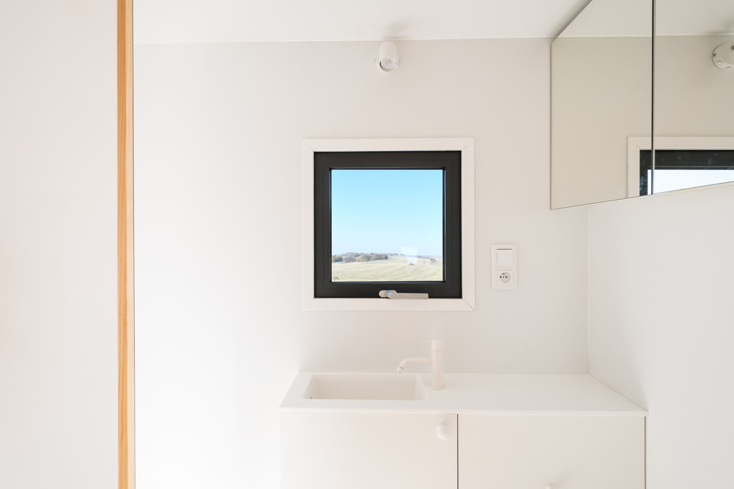 Do vodotěsného pláště z eloxovaného hliníku nešlo osadit nic jiného než hliníková okna a dveře. „To byl první důvod, proč jsme si vybrali Schüco. A druhý spočíval v tom, že Schüco nabízí jednoznačně největší škálu různých oken a konstrukcí, které jsme potřebovali do tohoto projektu, tzn. lehká okna, přitom izolačně s dobrými parametry, která se navíc otvírají ven a se stavební hloubkou rámů jen pět centimetrů. Žádný jiný výrobce nám nebyl schopen toto splnit,“ chválí Schüco Ing. arch. Jakub Vlček. Tepelně izolované hliníkové profily Schüco AWS 50 pro okna s pohledovou šířkou pouze 40 mm a Schüco ADS 50pro dveře s dvojitým bezpečnostním sklem dodávala na míru společnost A.R. OKENNÍ TECHNIKA. Rámy byly přímo ve výrobě vlepeny do sendvičových panelů, což zvýšilo odolnost konstrukce, a až když byl dům hotový, montovala se křídla.