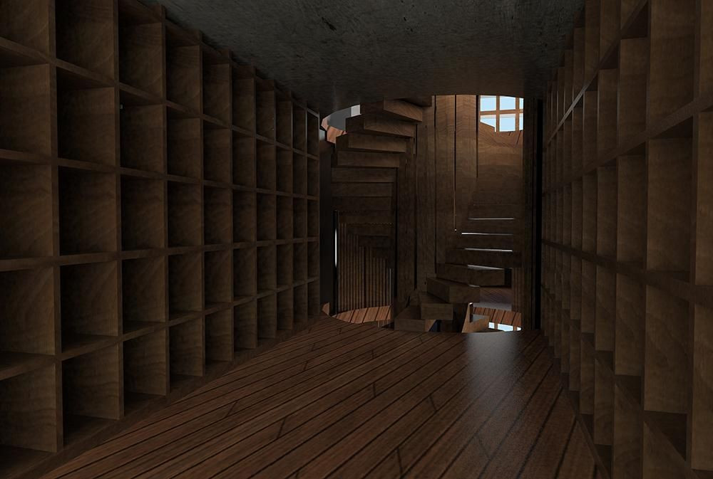 Úzkým domem střídavě prochází antikvariát společně s vlastním bytem majitele. Tyto dvě části jsou od sebe odděleny schodištěm, které zabírá celou šířku domu. Schody jsou vytvořeny na principu DNA dvoušroubovice. Uprostřed tak vzniká tubus o kruhovém průřezu, určený v přízemí k průchodu do kavárny a antikvariátu a ve vyšších patrech jsou umístěny malé plošiny ke čtení knih. V 2.NP a 4.NP plošiny náleží antikvariátníkům, ve 3.NP se schodiště rozšiřuje a vzniká tak elipsovitá plošina přístupná antikvariátníkům i majiteli - průchozí plošina. v 5.NP se se vrací do původního kruhového průřezu a tato malá čítarna je určena majiteli.