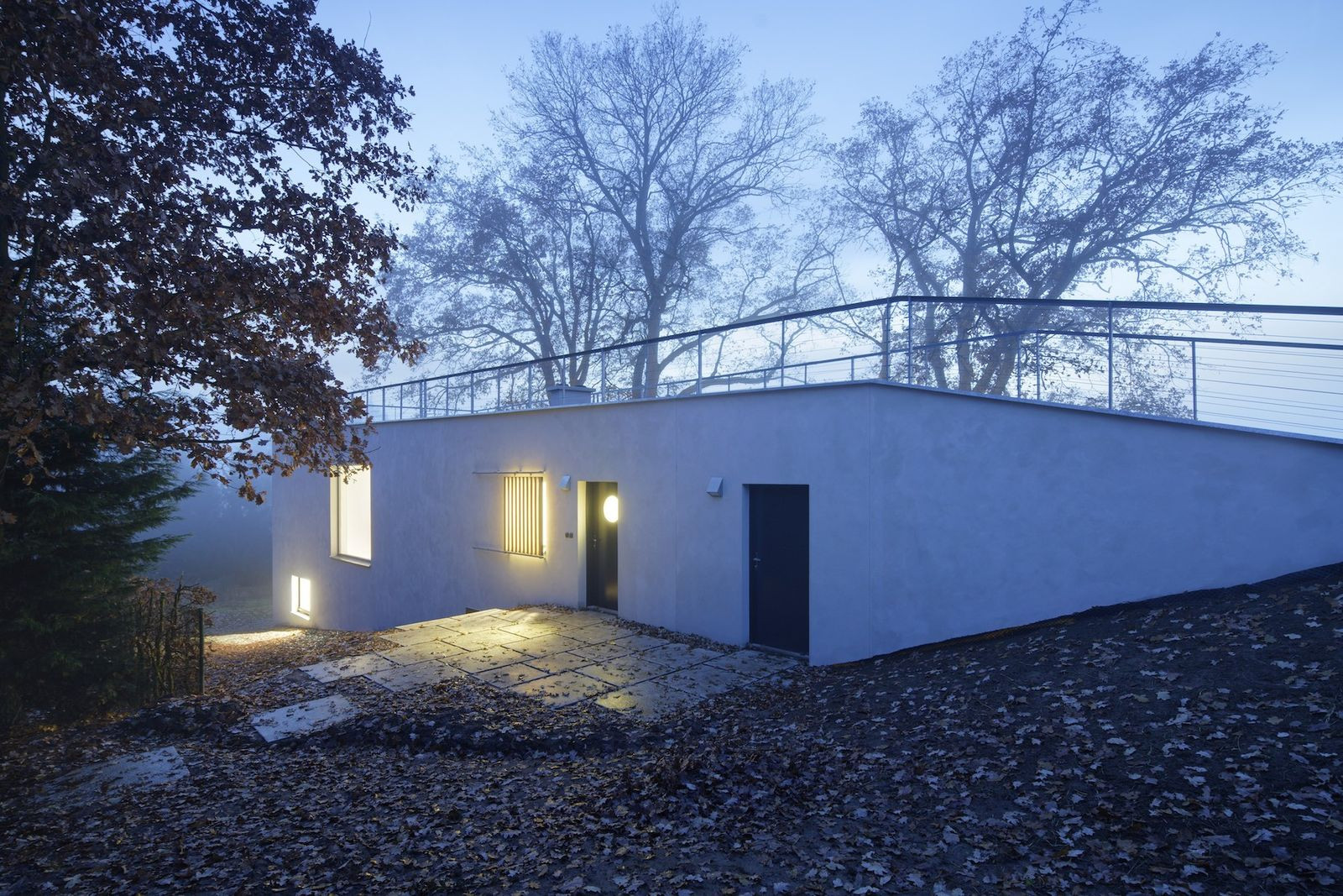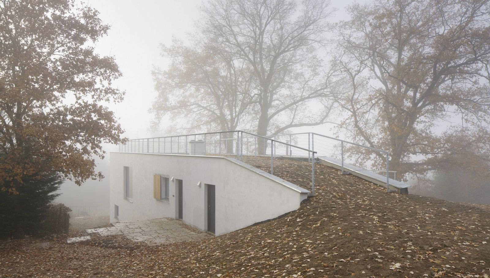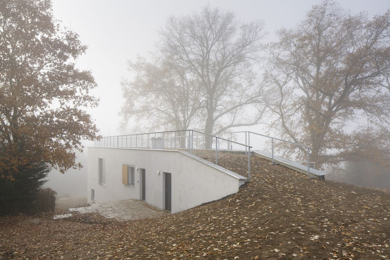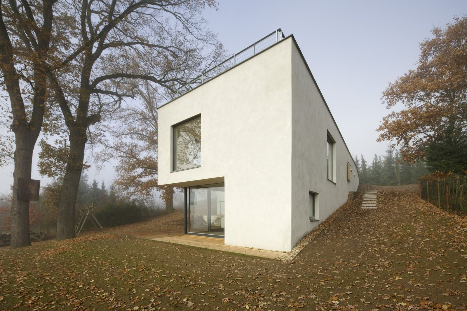 Architekti z pražské architektonické kanceláře Sporadical řešili návrh rodinného domu na svažitém pozemku v malé obci na Benešovsku, který obklopují vzrostlé duby. Zelená střecha domu je přístupná přímo z terénu na severní straně pozemku, kde vede silnice. Dům se skládá ze dvou hmot - větší dvoupodlažní a k ní přidružené přízemní. Velké prosklené části fasády propujují dům s přírodou v okolí.