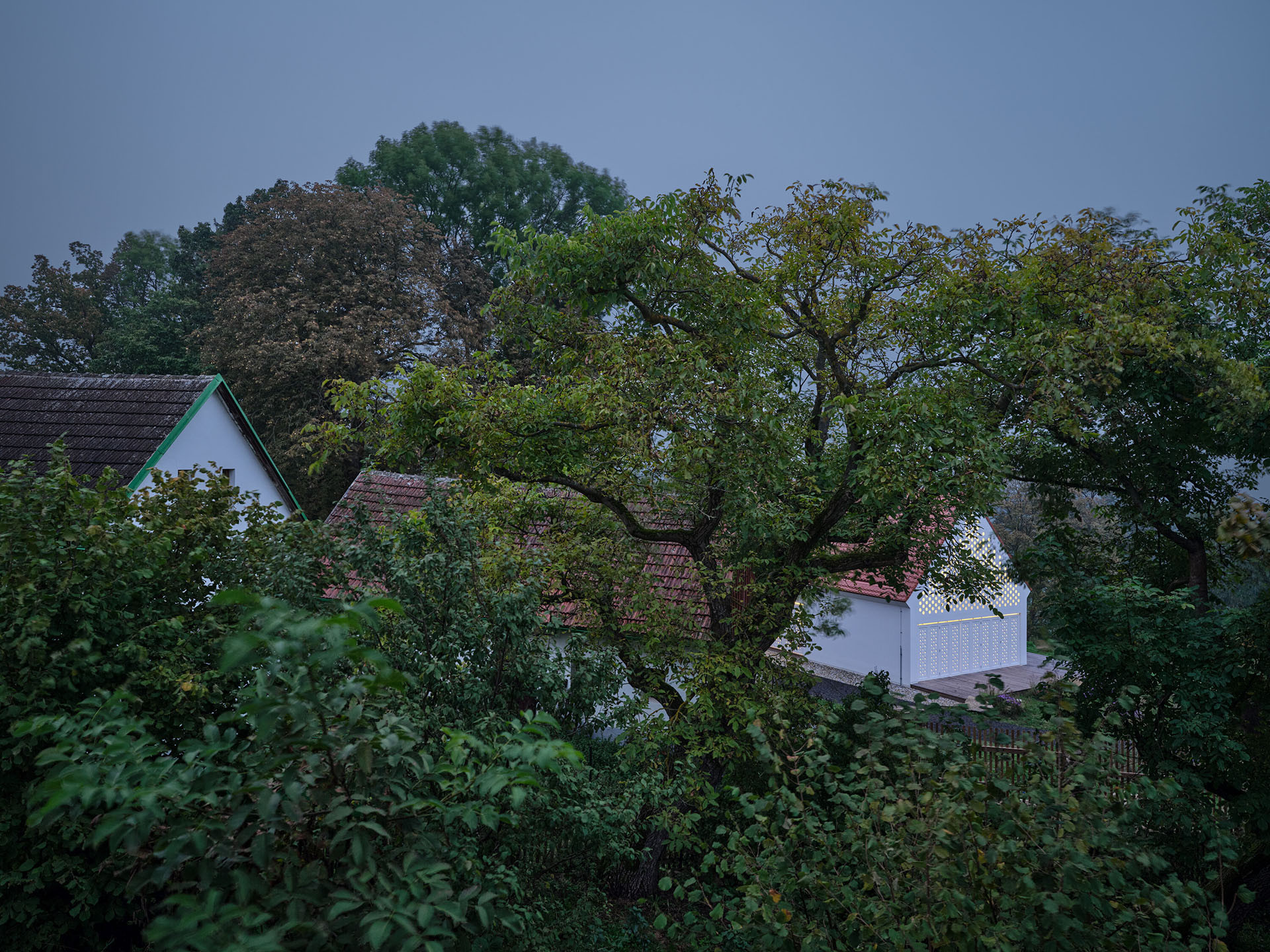 Atmosféra domu se v průběhu dne mění v závislosti na přírodních cyklech a pohybu slunce. Ložnice a hlavní obytný prostor se otevírají na východ. Výhled do ovocné zahrady tak ráno doplňuje východ slunce. Jižní fasáda s perforovaným zdivem a kruhovým oknem zprostředkovává kontakt se dvorem a ruinou stodoly. Do domu se vstupuje ze západu. Západní část domu se orientuje do vesnice. Architekt se ji rozhodl uzavřít a zajistit tak domu klid a soukromí. Zaklenutá nika v severním štítu odkazuje na zakřivené formy blízkého barokního zámku a propouští světlo do ložnice a koupelny.