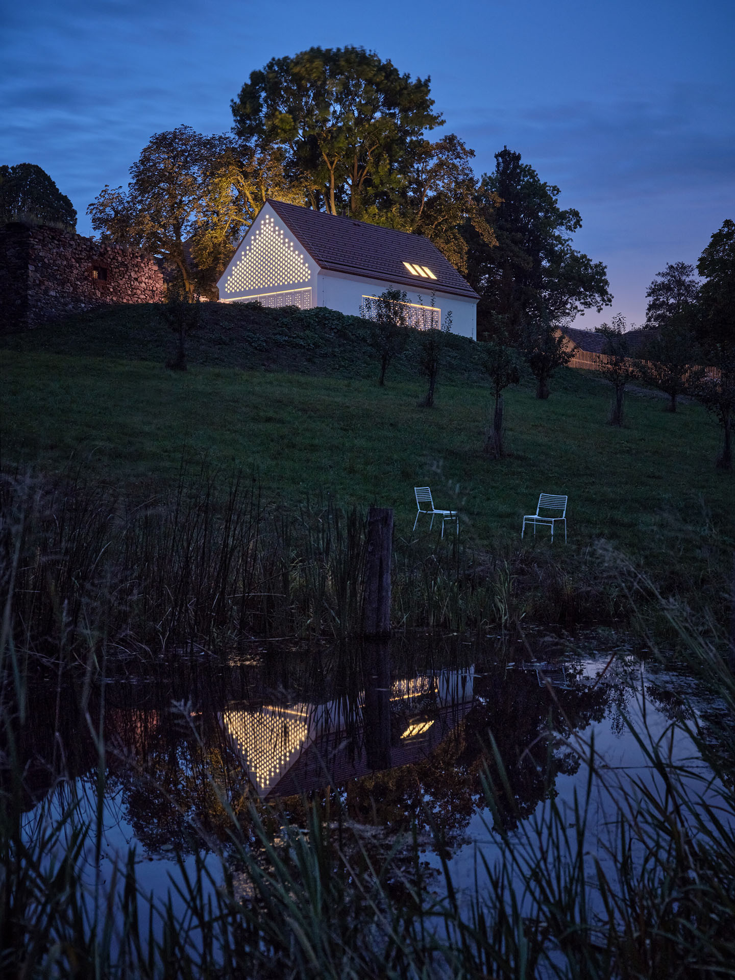 Množství slunečního světla proudícího do interiéru lze regulovat pomocí dřevěných stínících panelů z nabílené české jedle a smrku. Dům lze buď široce otevřít do krajiny, nebo uzavřít a podtrhnout tak jeho meditativní charakter, kde si hraje světlo a stín. V noci zase objekt díky perforovaným panelům a zdivu září do krajiny.