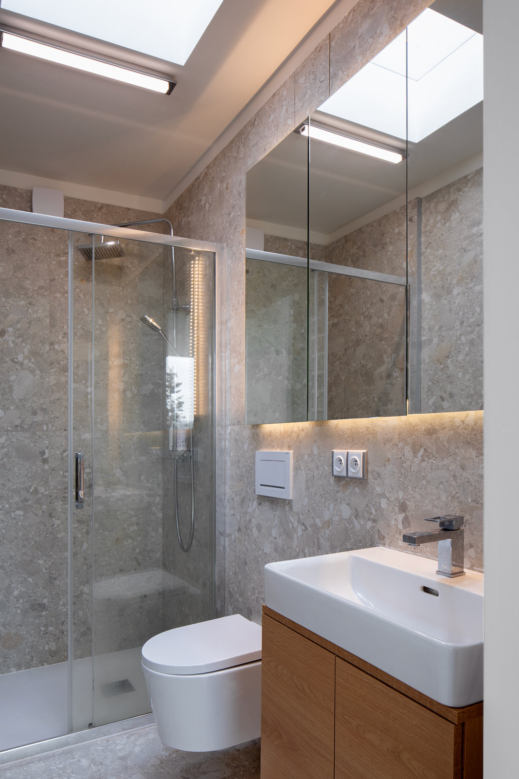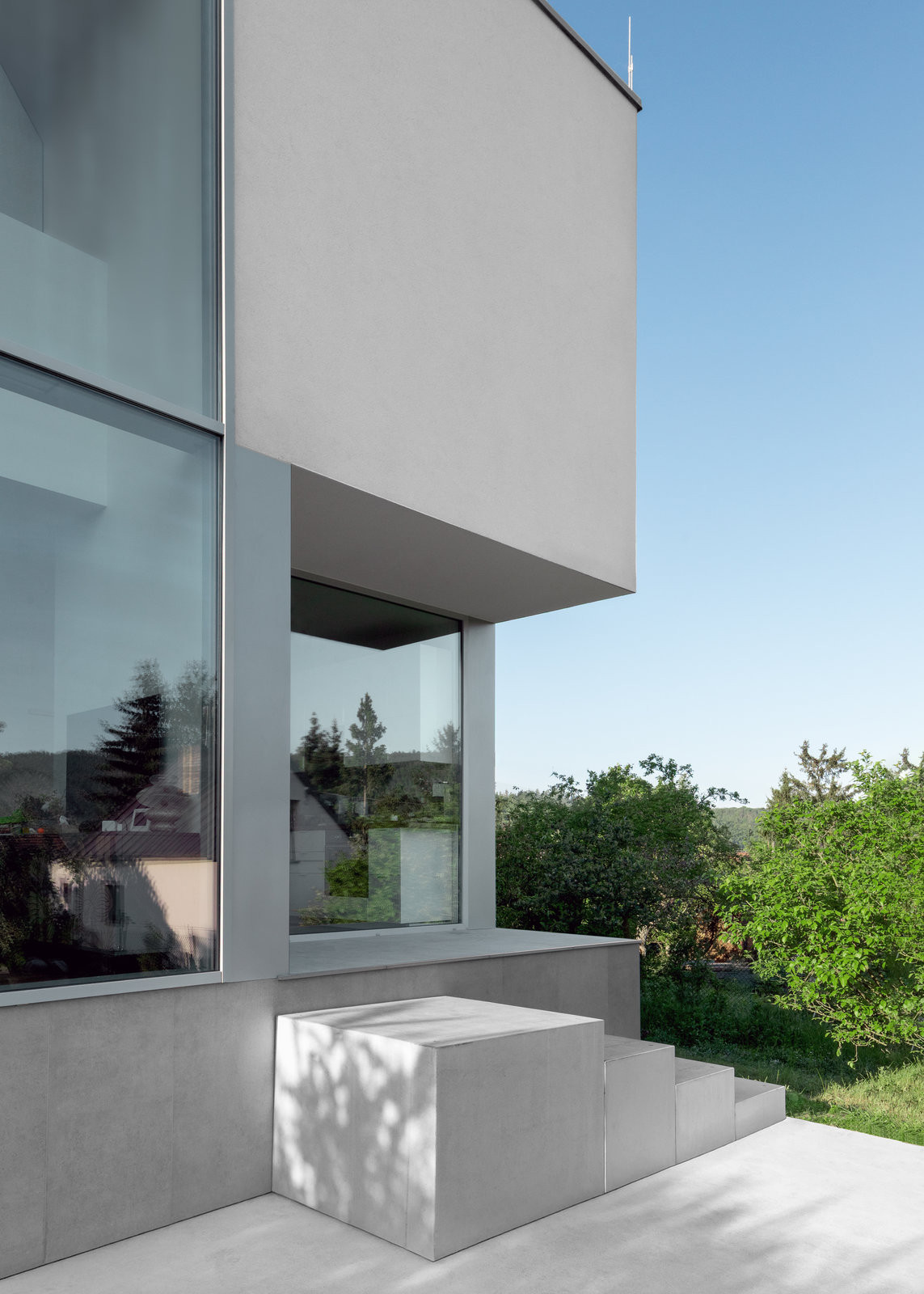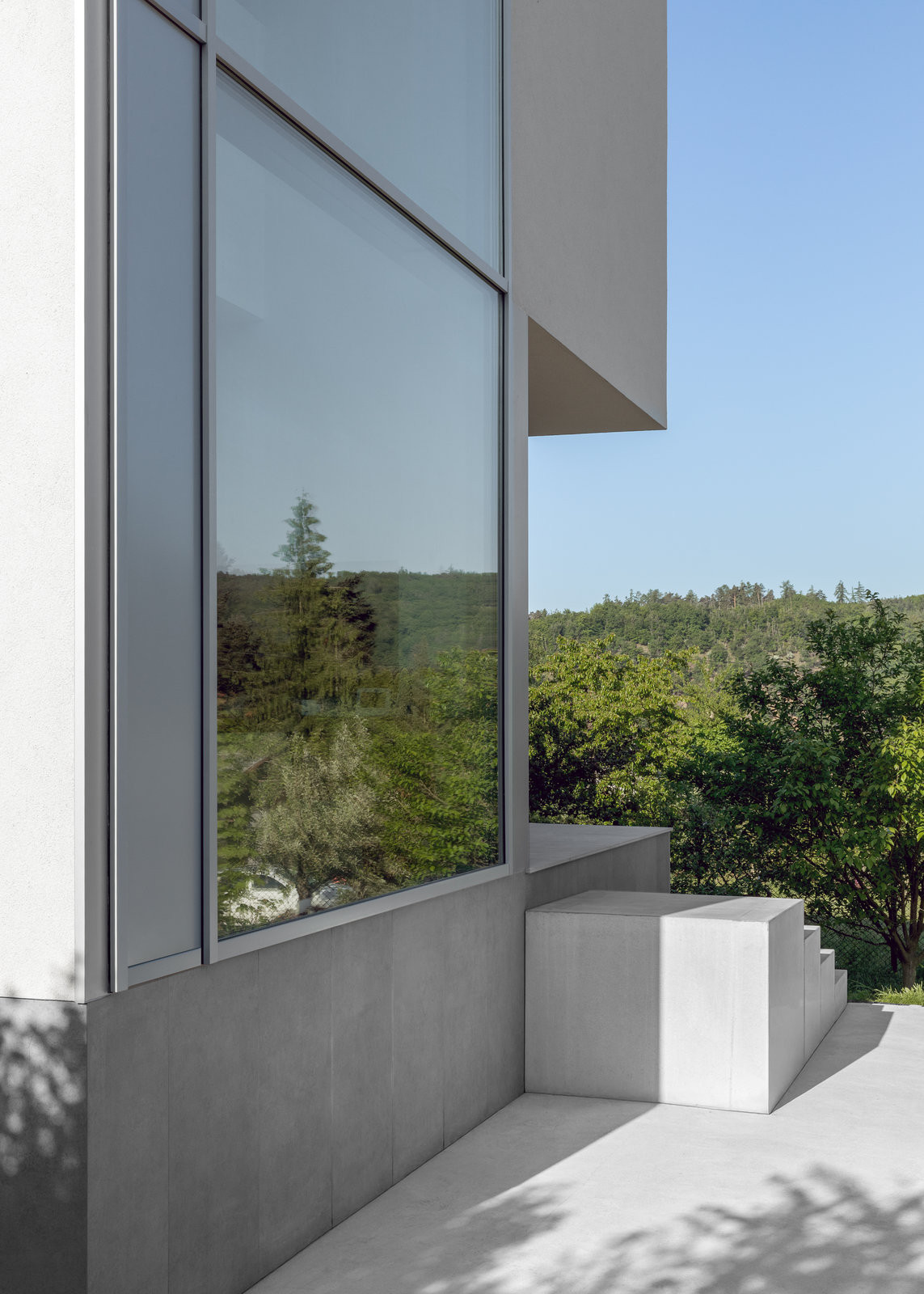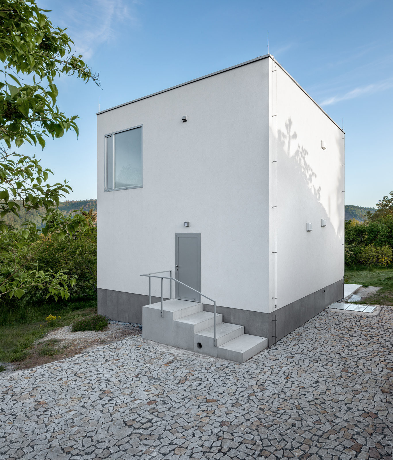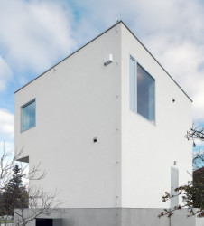 Dům je částečně podsklepený. To je pozůstatek původní chaty, která tu stála dříve. Kvůli špatnému technickému stavu bylo však nutné ji zbourat. Na místo ní vyrostla forma mnohem elegantnější, krychle. Čtverce stěn člení čtverce oken a doplňují je kvádry venkovního schodiště a terasy. „Těmito jednoduchými prostředky bylo docíleno maximálního výtvarného efektu,“ říká architekt Luka Križek; schválně se vyhnul i všem módním a trendovým záležitostem jako jsou třeba barevná okna. „Zvolil jsem tu úplně nejjednodušší formu,“ shrnuje.