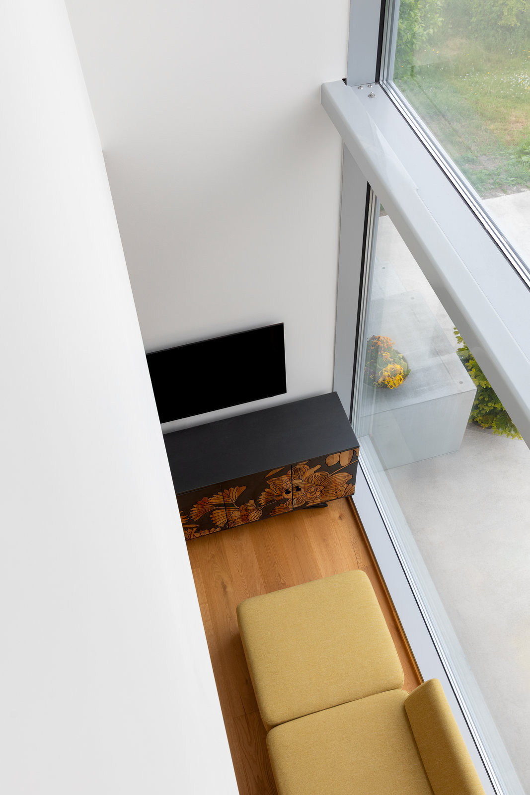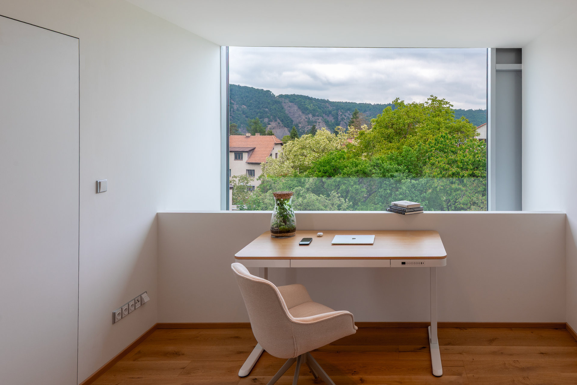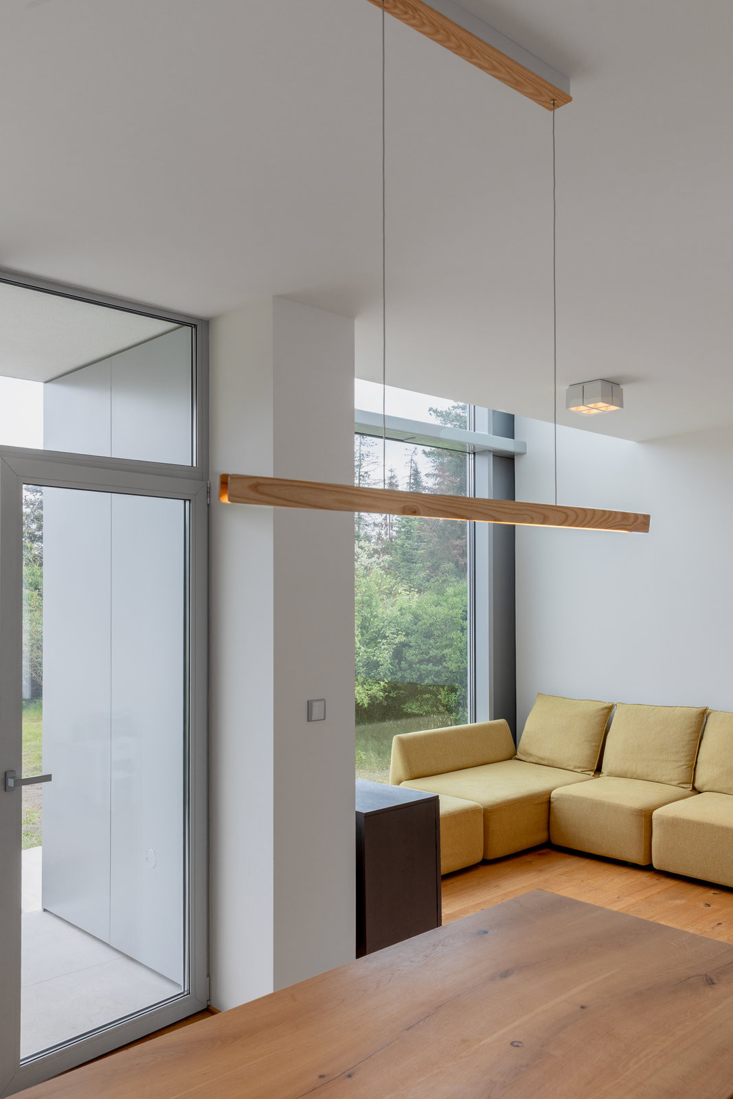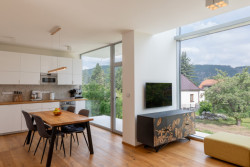 Jak dům funguje? V přízemí má rodina hlavní pobytovou místnost s kuchyní propojenou přes velkoplošné sklo se sadem, je tu také sklad a WC. V patře se nachází pracovna, a to na ochozu nad obývacím pokojem – odtud se dá dívat dolu do místnosti anebo přes velké okno na scenérii vltavského údolí. Najdeme tu také dětský pokoj a ložnici.