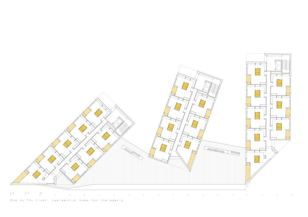 Na střeše soklu má každá budova víceúčelovou místnost přímo napojenou na vnější terasu, nacházející se akorát na úrovni korun stromů. Tři solitéry integruje do širší komunity sousedů. Protože rezidenty domu mají být senioři, předpokládá se, že obyvatelé budou většinu času trávit ve svých bytech či v budově. Společné prostory tak slouží obohacení místního života.