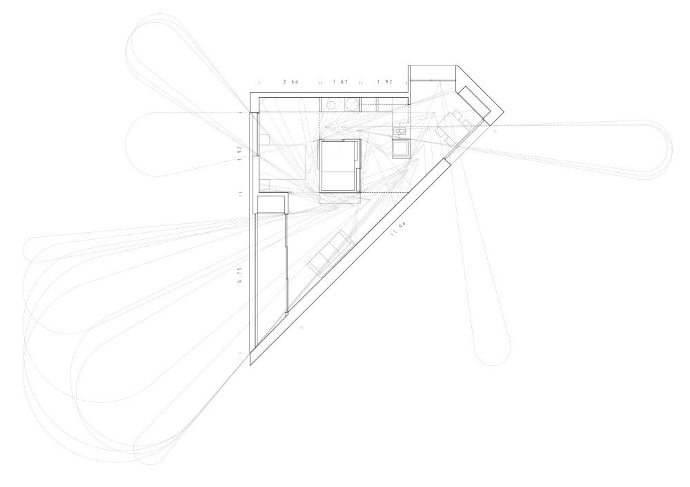 Příbytky samotné jsou organizovány kolem vnitřního jádra servisních prostorů, obklopeného ložnicí a obývákem. Obě místnosti jsou pojaty jako kontinuální a flexibilní prostory ústící do balkónu. Takový rozvrh umožňuje vnímat prostor jako svého druhu neomezený – neuzavřený, ale propojený. Koupelna byt psychicky rozděluje na soukromější a otevřenější část.