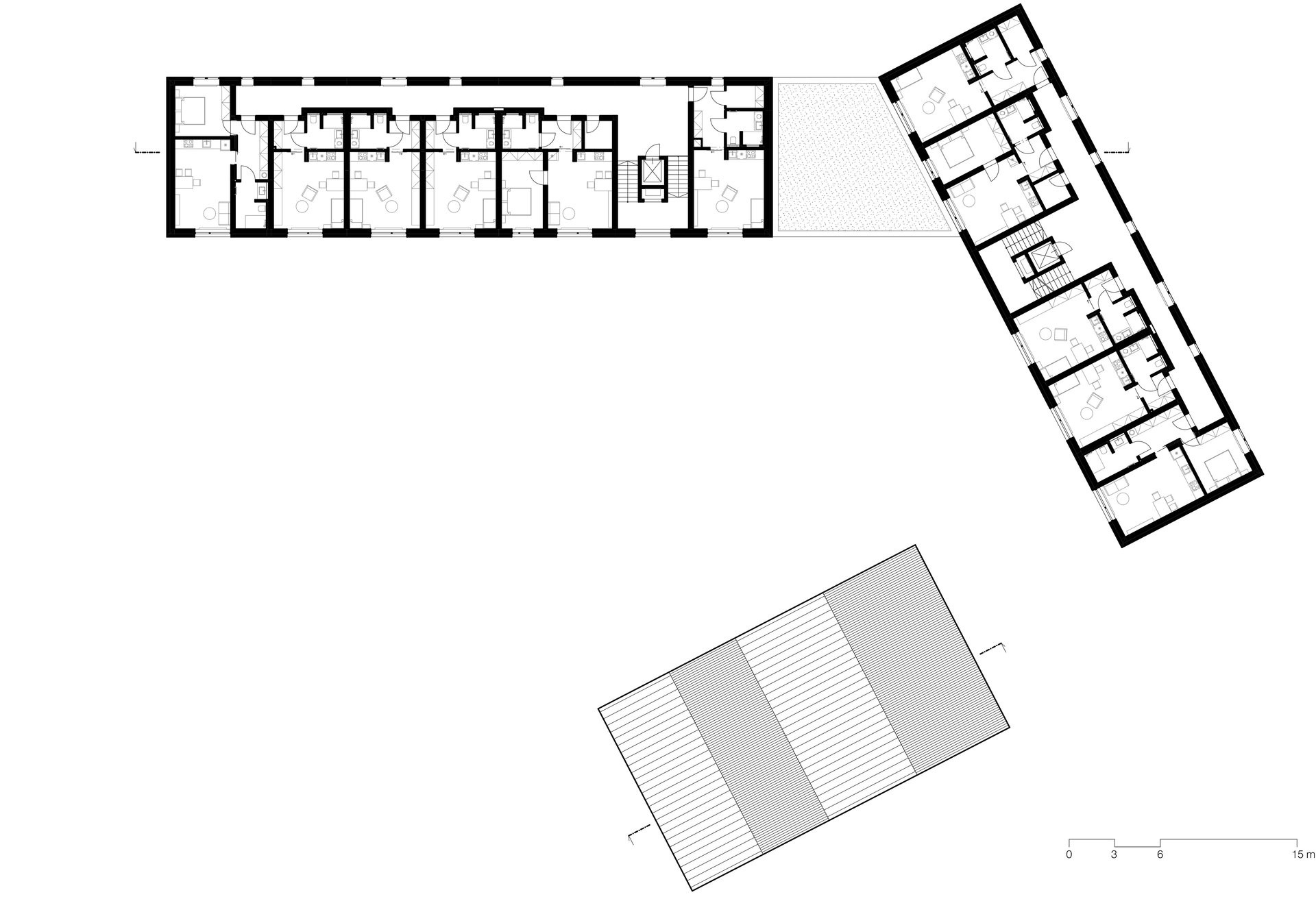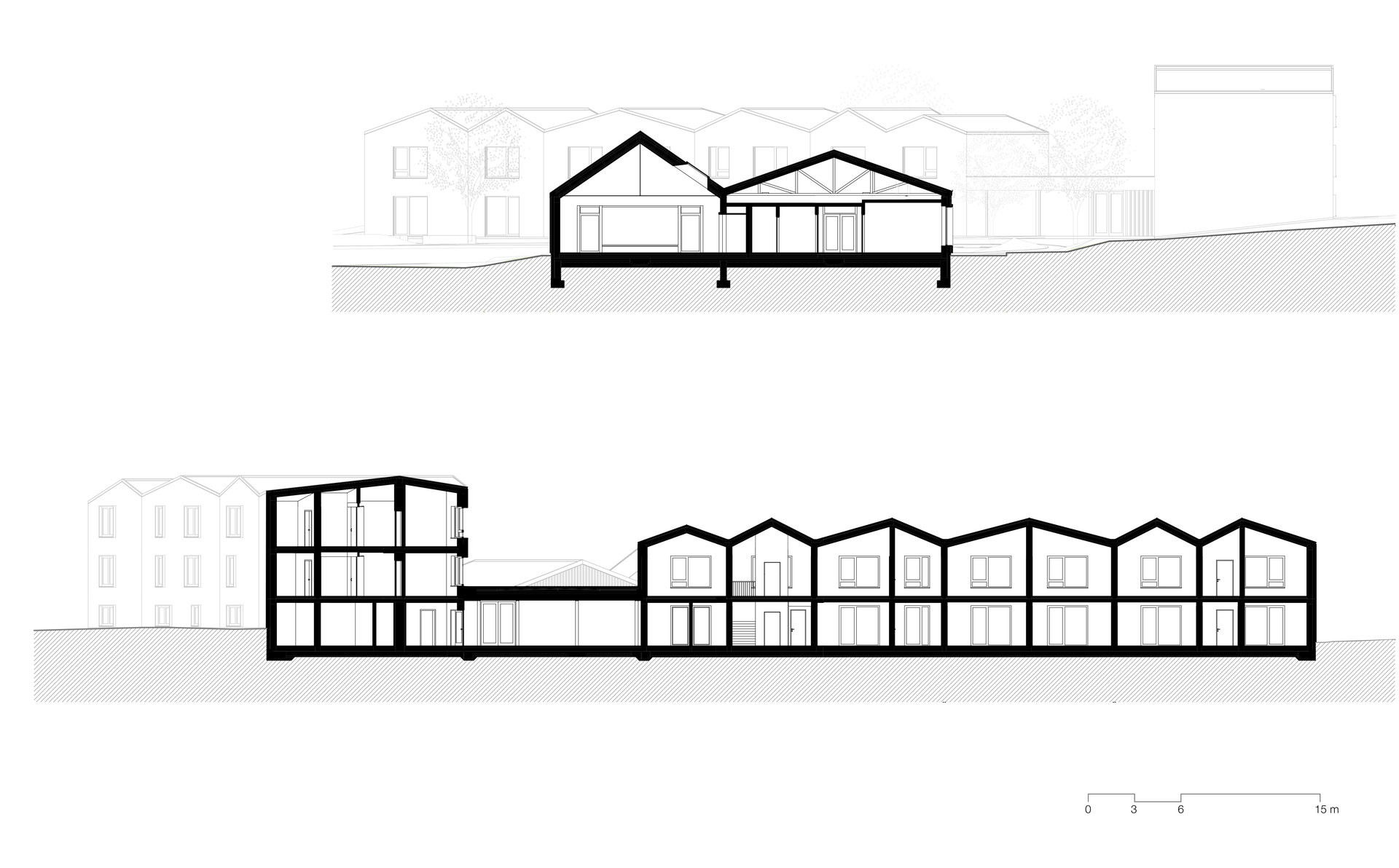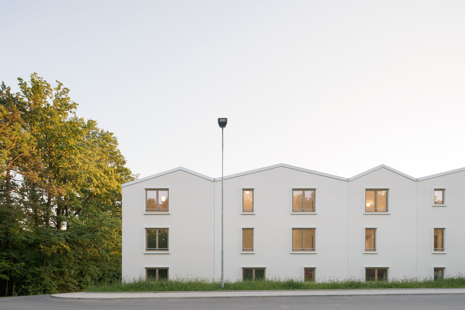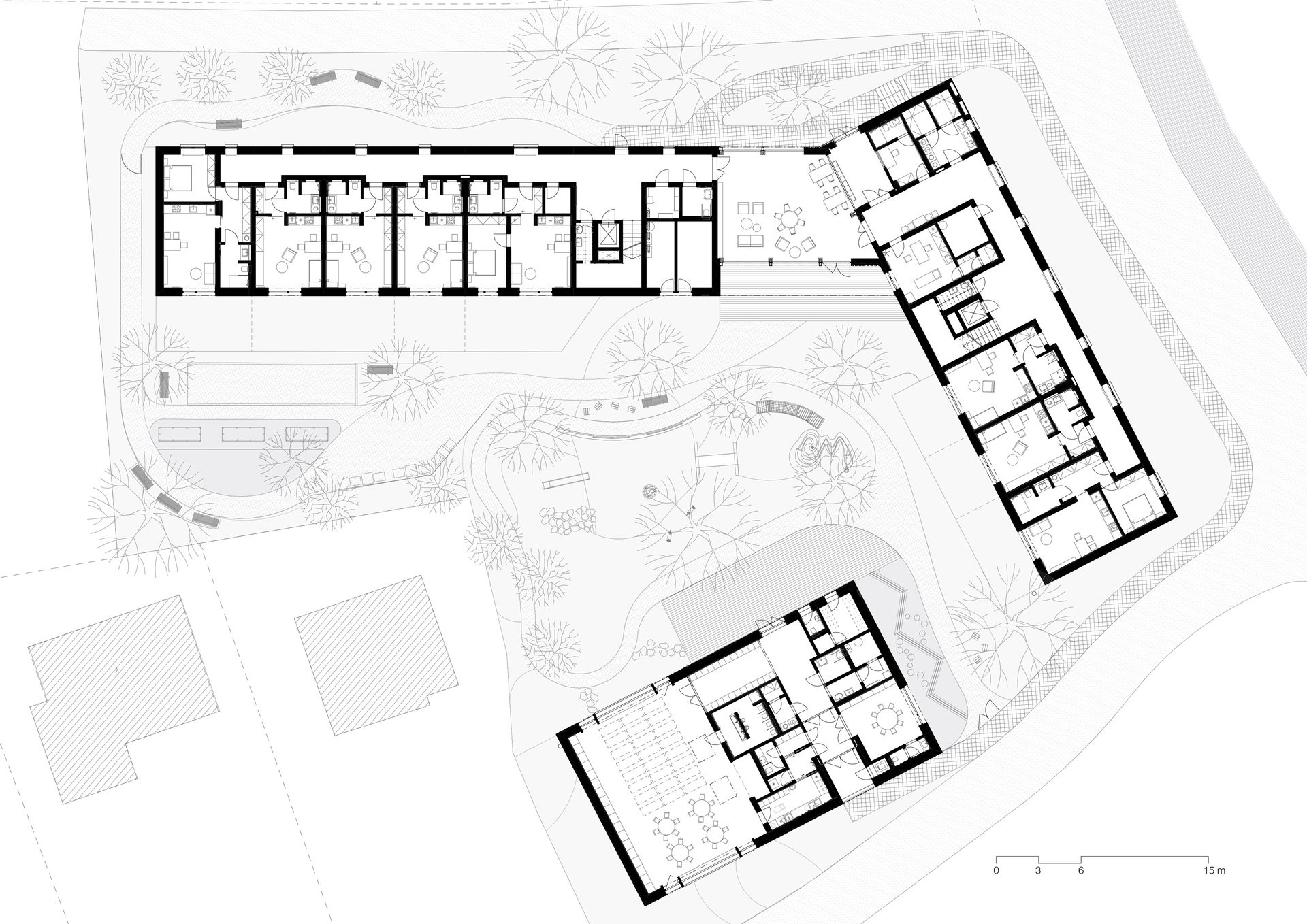 Domy pro seniory, navržené jako menší objemy s jemně odlišenými fasádami, si zachovávají lidské měřítko. „Budovy slouží jako hluková bariéra vnitřní pobytové zahradě, společné pro oba provozy,“ popisují architekti z ateliéru ti architekti.