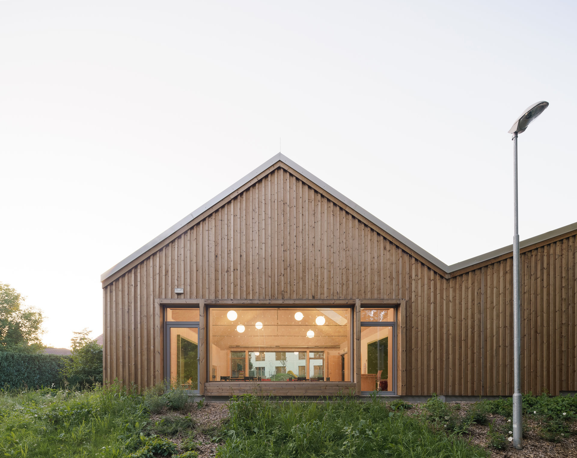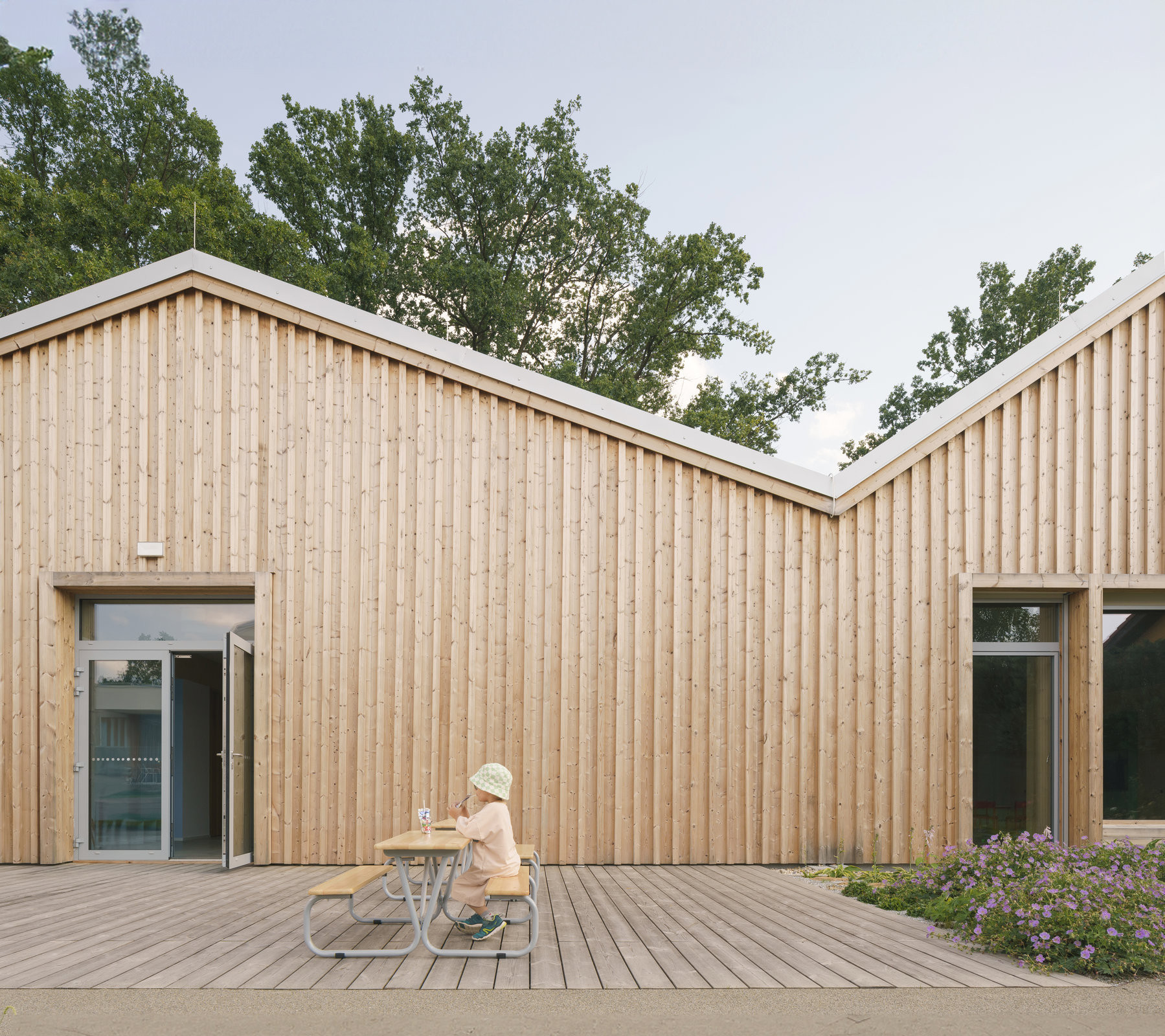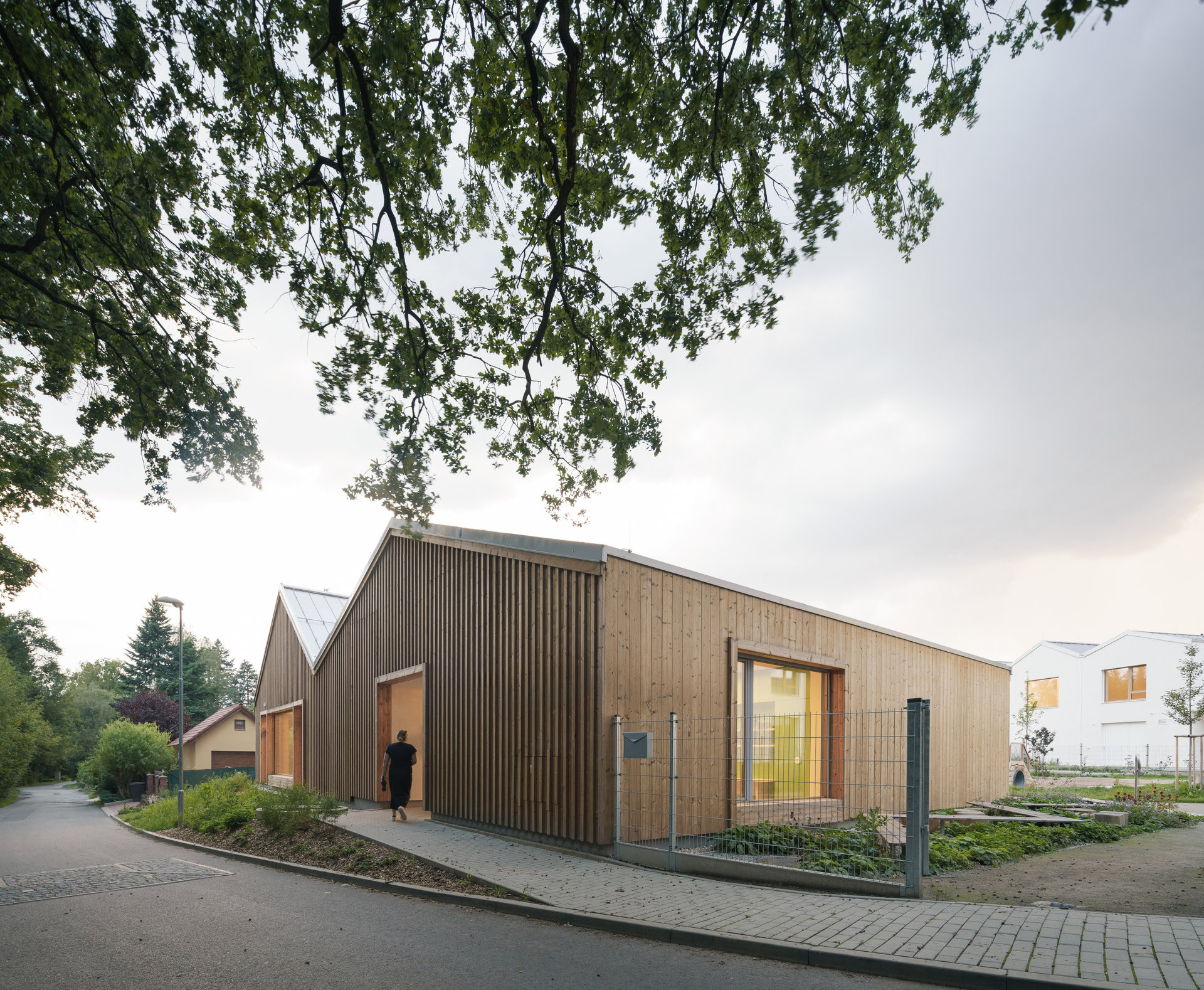 Mateřská škola s jednou třídou a komunitní učebnou navazuje svým tvarem na sousední dům pro seniory, a přesto si zachovává vlastní charakter. „Na první pohled lze poznat, že k sobě patří, přesto díky odlišnému zpracování fasády vytváří výrazný kontrast,“ dodávají architekti. Školka se nachází na okraji pozemku u lesa a umožňuje dětem přímý vstup na zahradu plnou přírodních herních prvků.