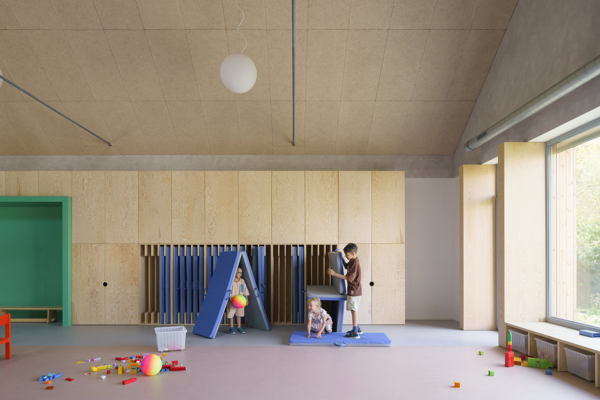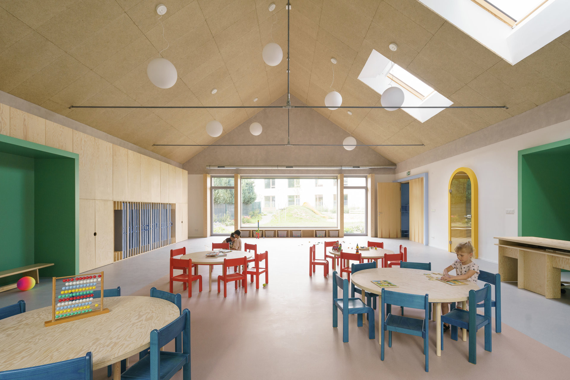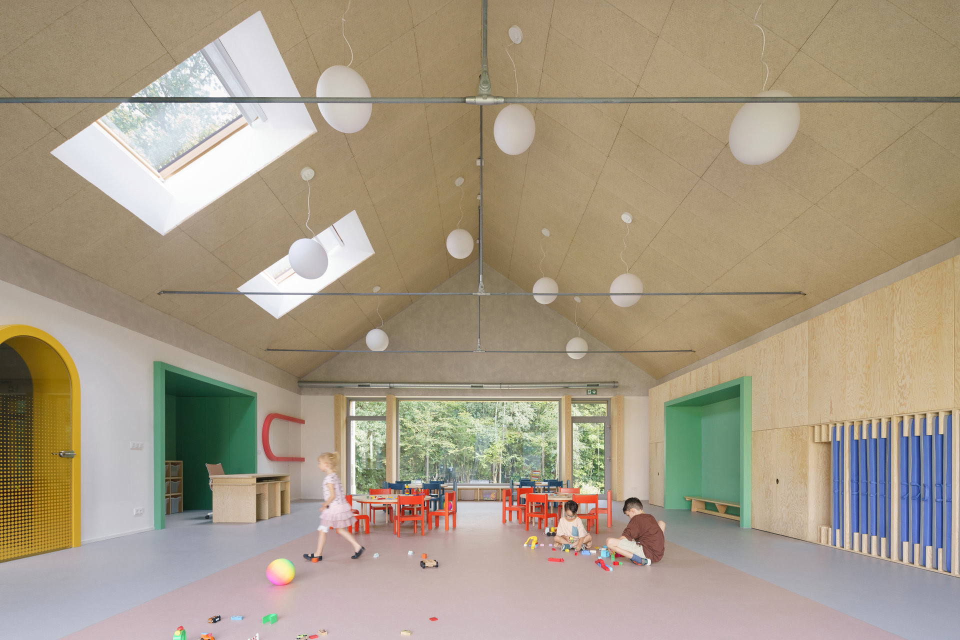 Mateřská škola s jednou třídou a komunitní učebnou navazuje svým tvarem na sousední dům pro seniory, a přesto si zachovává vlastní charakter. „Na první pohled lze poznat, že k sobě patří, přesto díky odlišnému zpracování fasády vytváří výrazný kontrast,“ dodávají architekti. Školka se nachází na okraji pozemku u lesa a umožňuje dětem přímý vstup na zahradu plnou přírodních herních prvků.