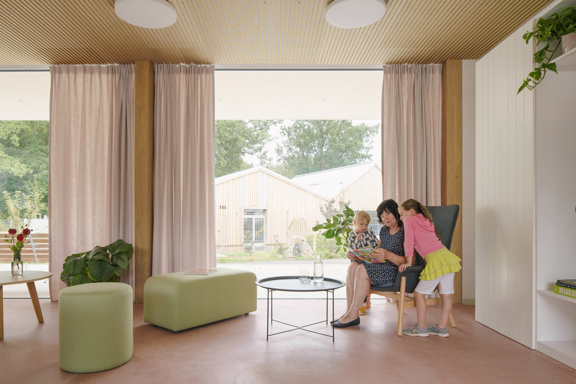 Zahrada hraje v celém konceptu klíčovou roli. Dřevěné lávky mezi bylinkami, travnaté valy, vodní koryto s hrázkami a stín pod vzrostlými stromy podporují spontánní setkávání dětí a seniorů. Právě tady dochází k tomu nejcennějšímu – ke vzájemnému sdílení času, úsměvů i zkušeností. Je to odvážná kombinace věkových skupin, ale zdá se, že funguje.