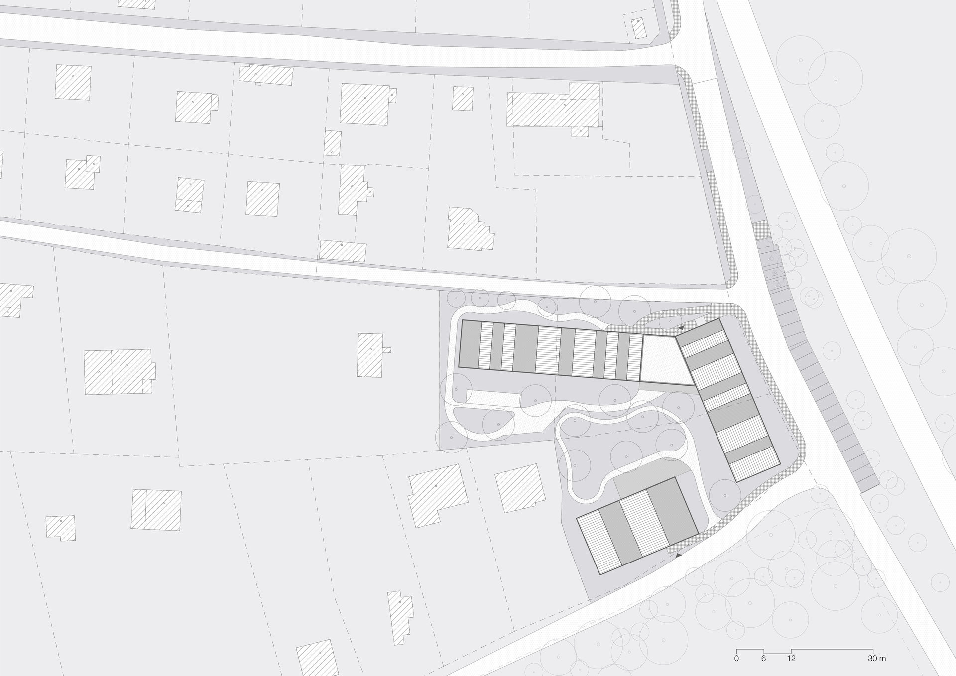 Bývalá chatová oblast, frekventovaná silnice a blízkost lesa – v tomto prostředí vyrostl neobvyklý soubor staveb, který propojuje domov pro seniory s mateřskou školou. Setkávají se tu dvě generace, které se vzájemně obohacují.