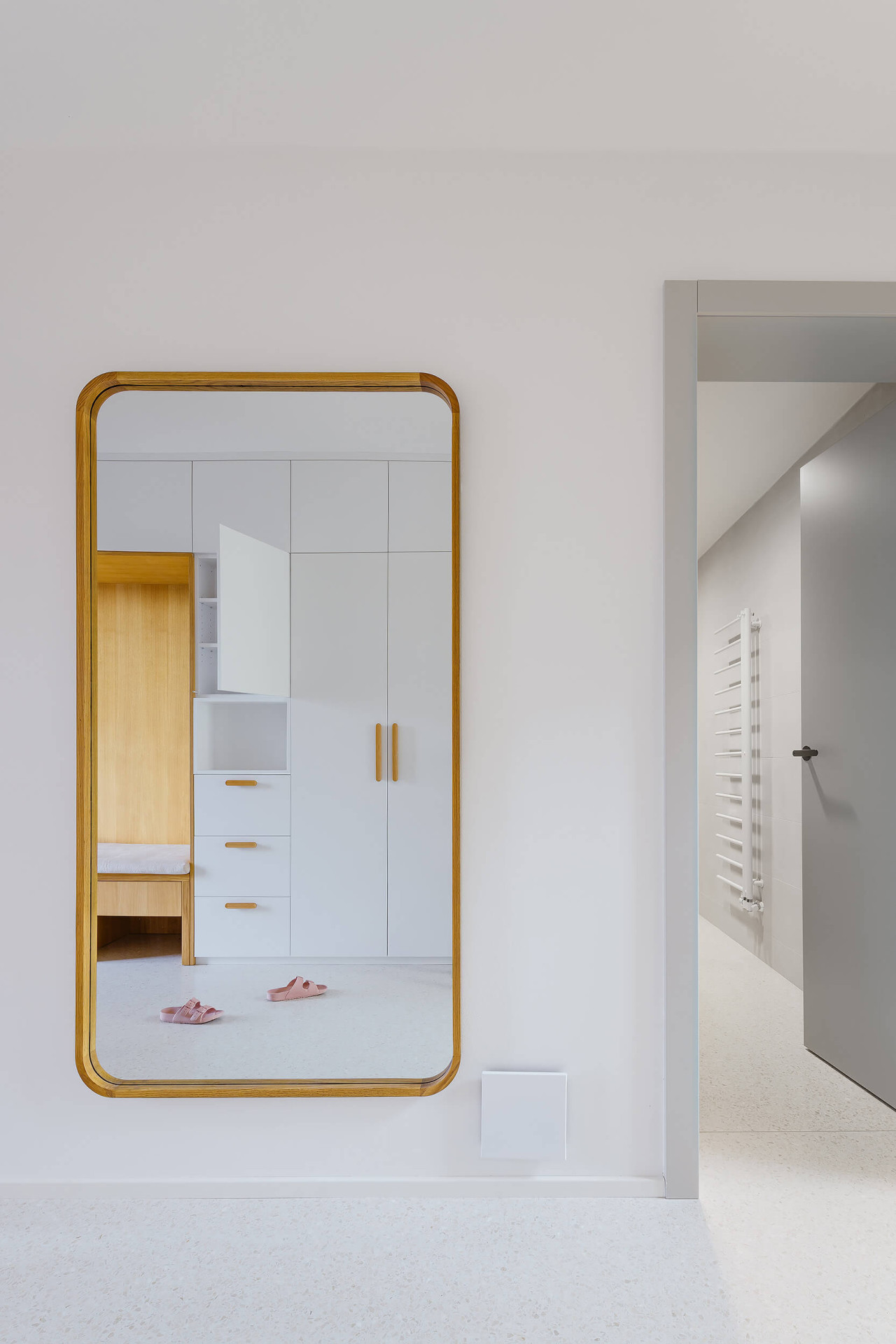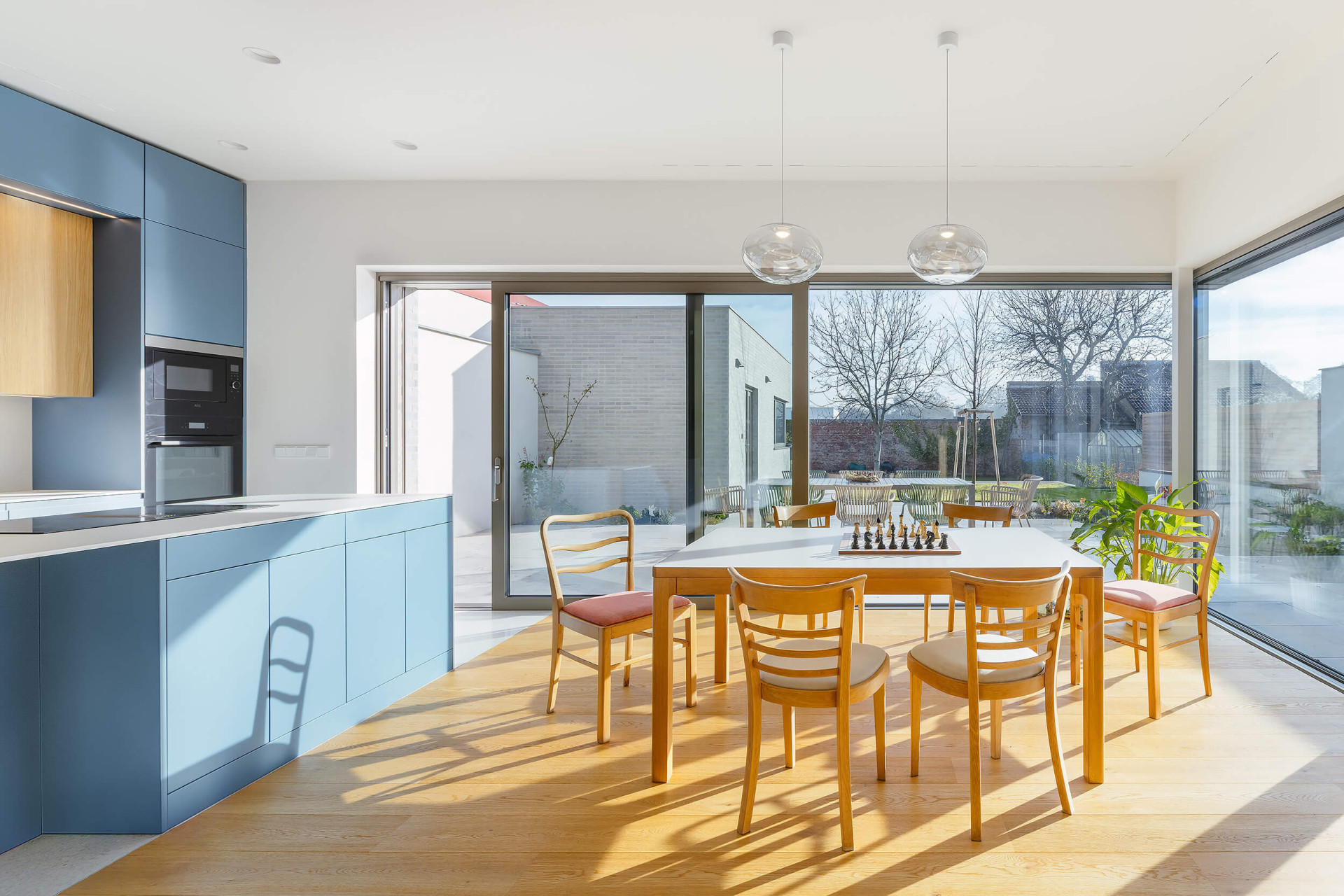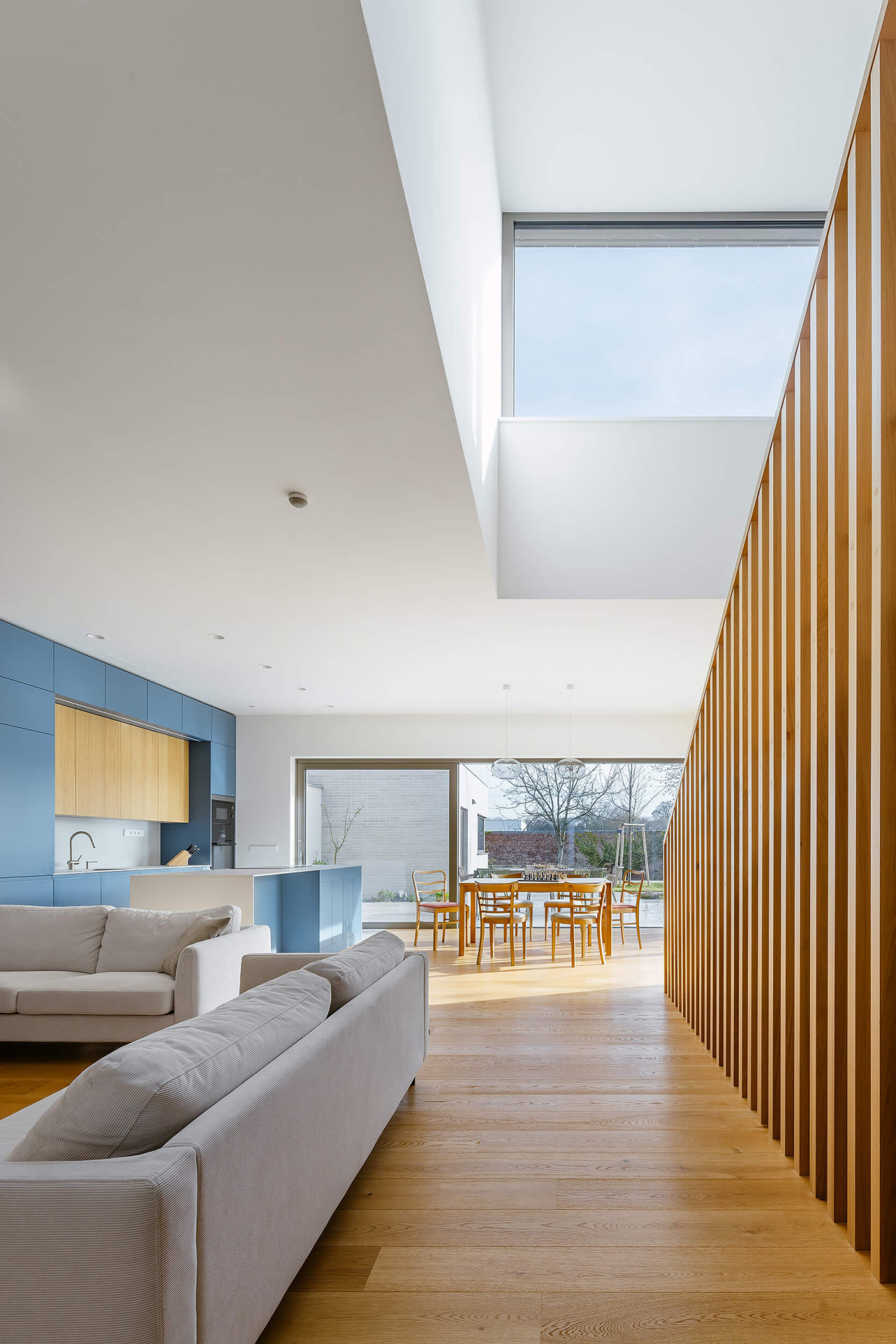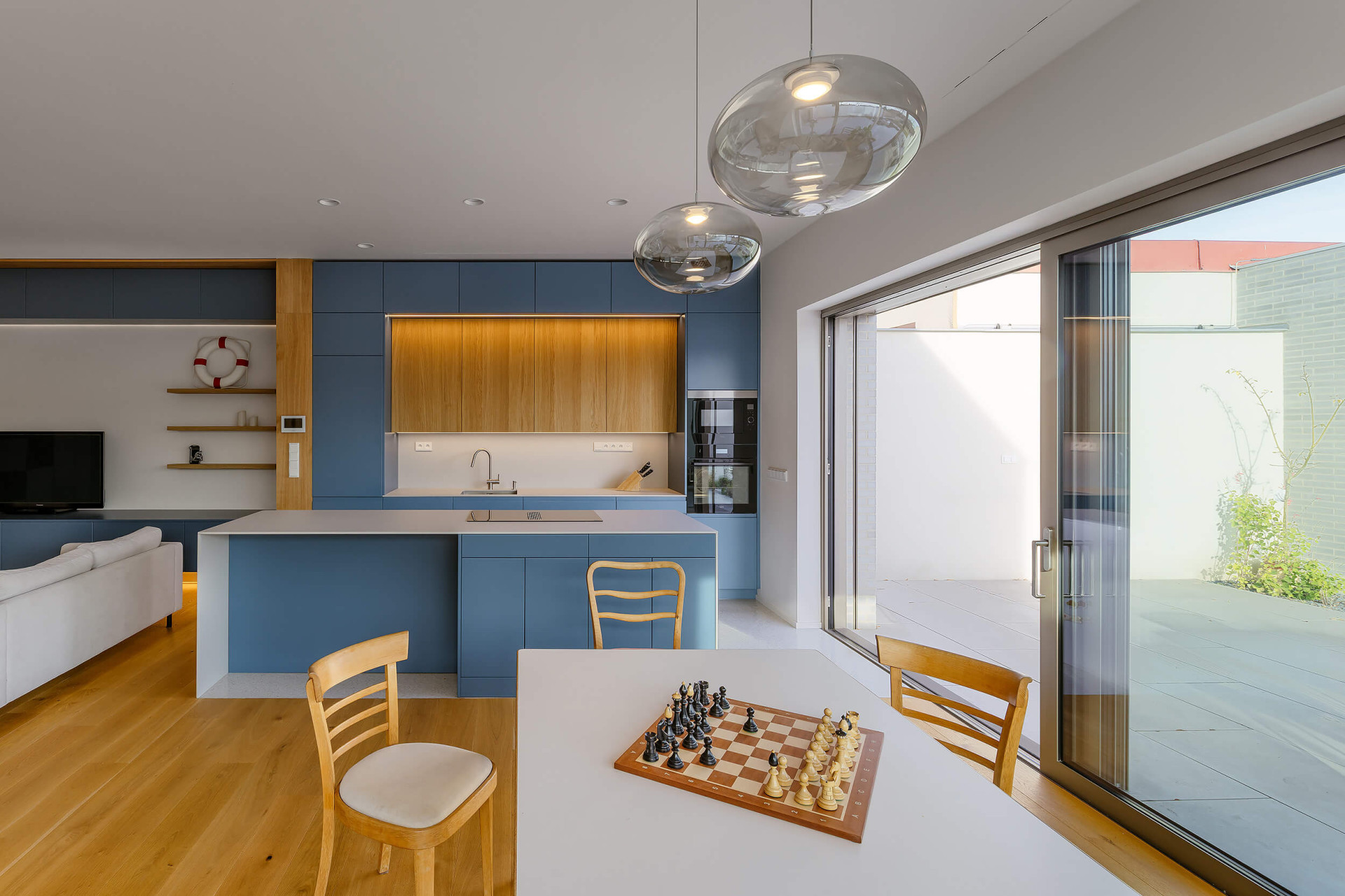 V místnostech jinak dominuje bílá barva a dřevo, oživené barevnými detaily jako je modrošedá kuchyňská linka – je to nevtíravé, ale harmonické pozadí k rodinnému životu.