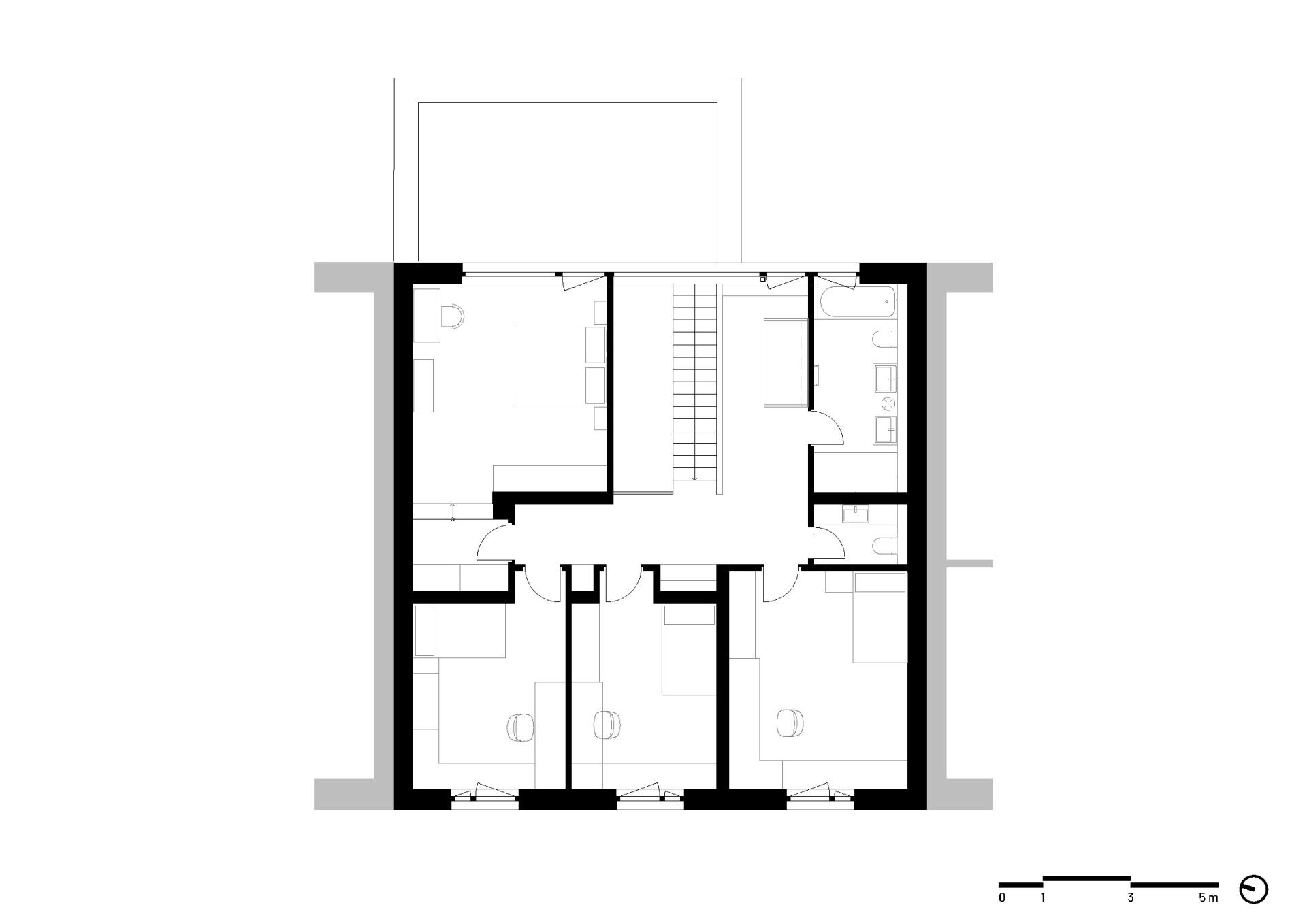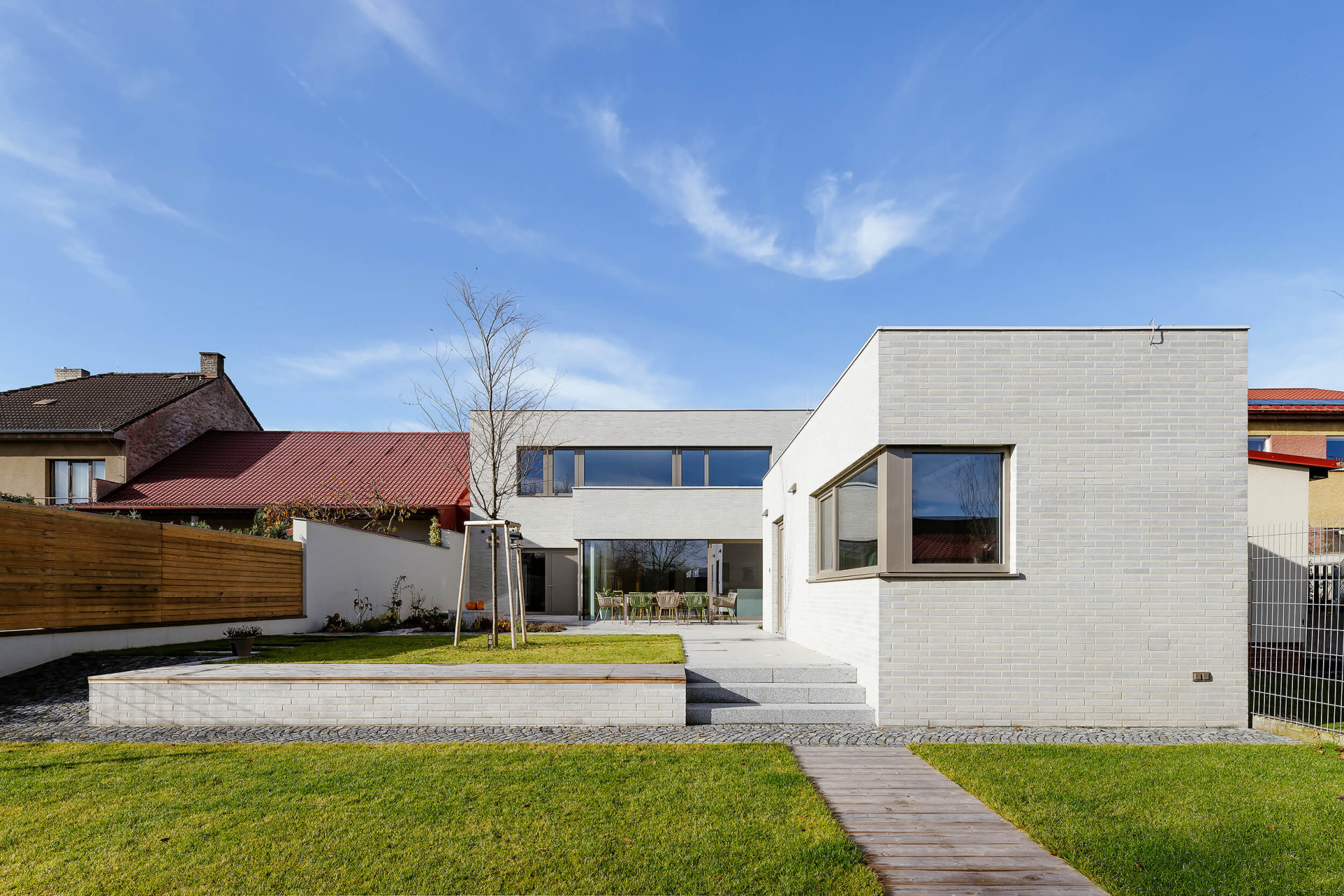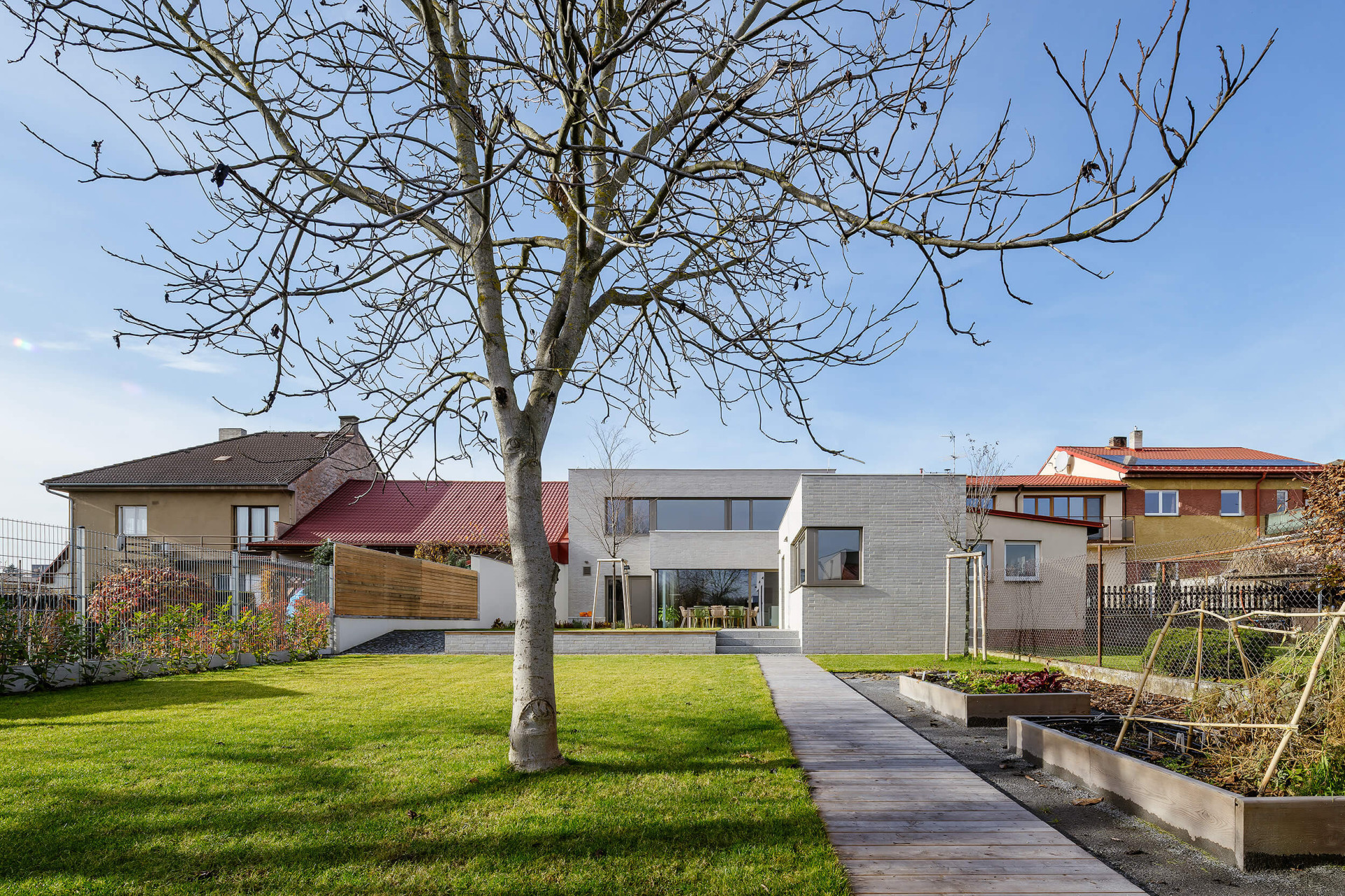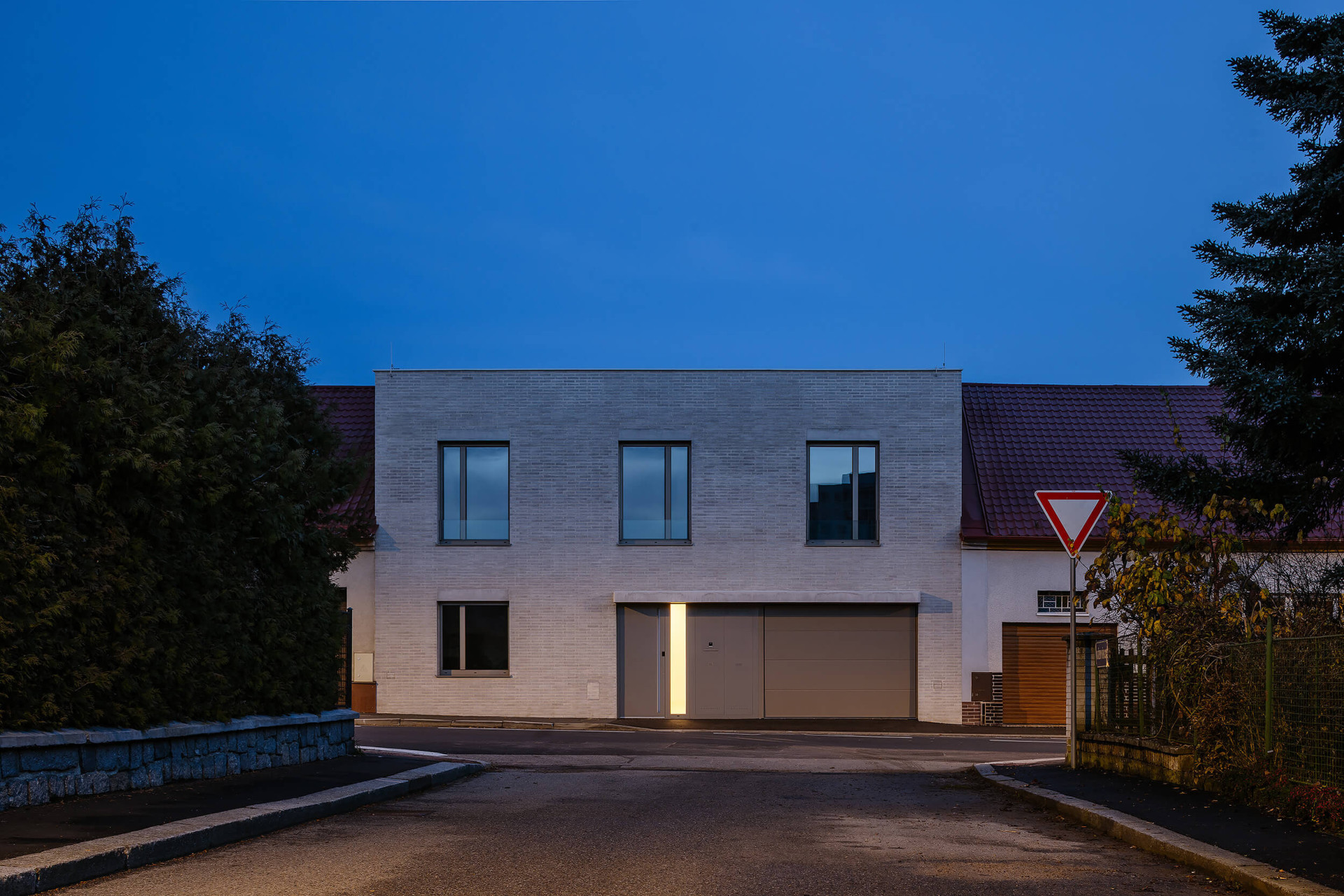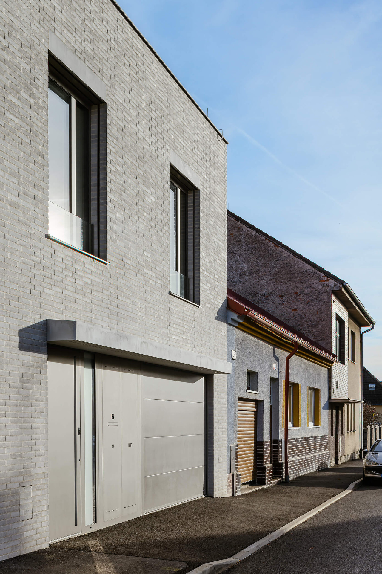 Pro rodinný dům, omezený ještě navíc sousedními parcelami, bylo potřeba hlavně efektivně využít prostor a správně ho uspořádat. Do ulice je dům dvoupodlažní, stejně jako jeho soused. Má ovšem rovnou střechu, aby se horní patro dalo plnohodnotně využít.