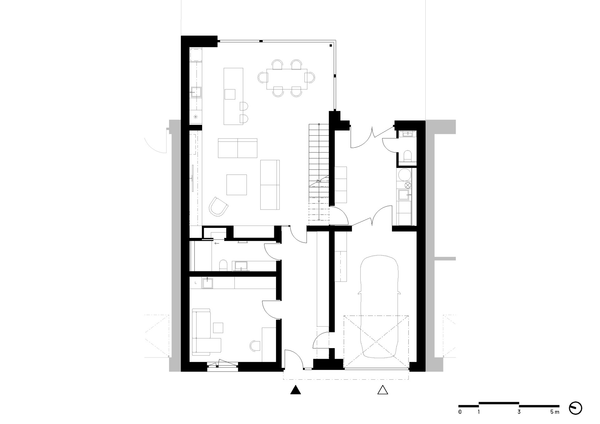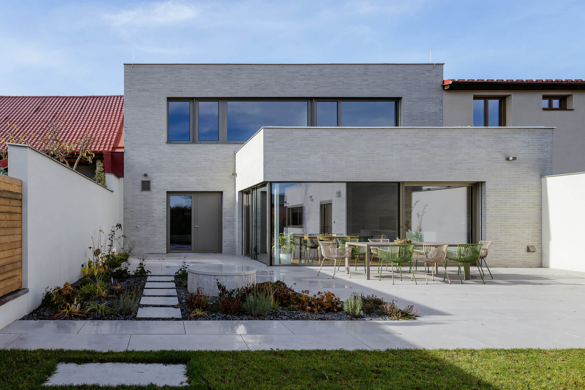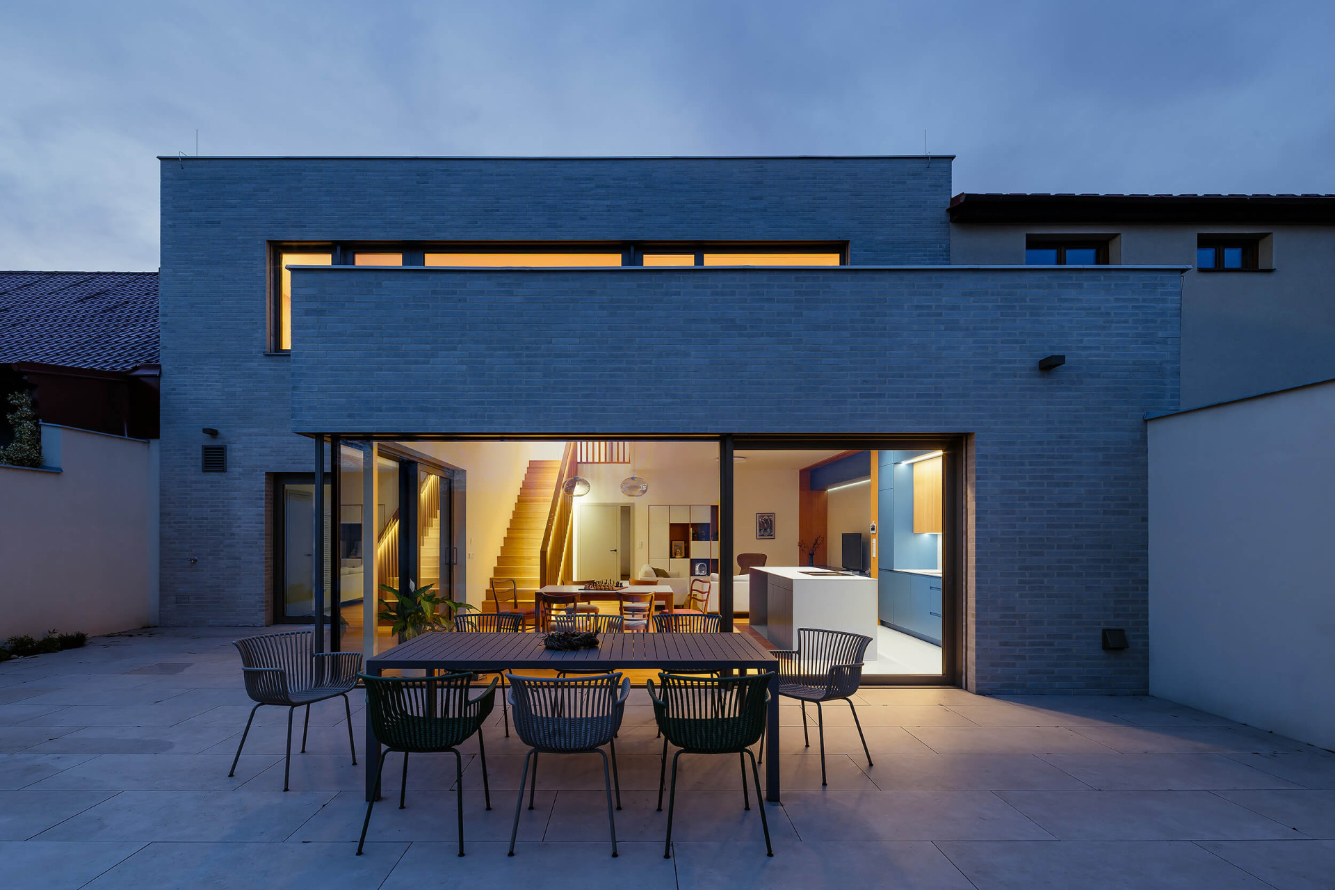 Přízemí má větší plochu a je rozšířené směrem do zahrady, s níž je propojené velkoplošným prosklením. „Po vstupu do domu se obytná část otevírá v celé své hloubce a v průhledu směřuje až do zahrady, která se tak stává přirozenou součástí každodenního života i atmosféry interiéru,“ popisuje architekt Vaněček a architektka Míšková. Na obývací pokoj navazuje terasa, z ní lze vyjít na zahradu – ačkoliv se jedná o úzký pruh mezi sousedními pozemky, mají tu majitelé dostatek soukromí.