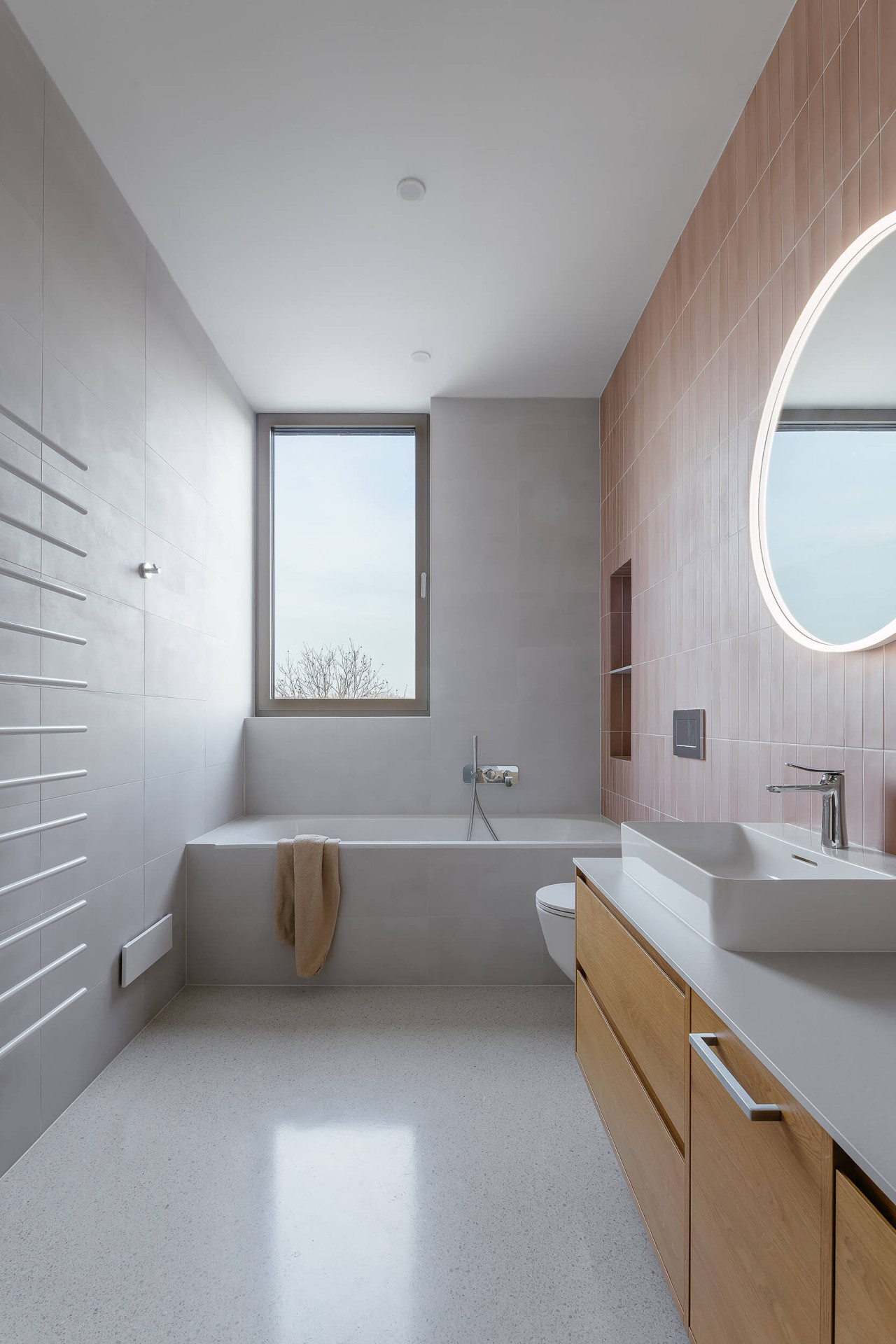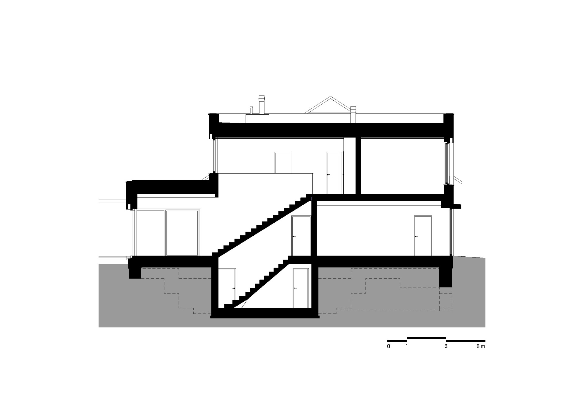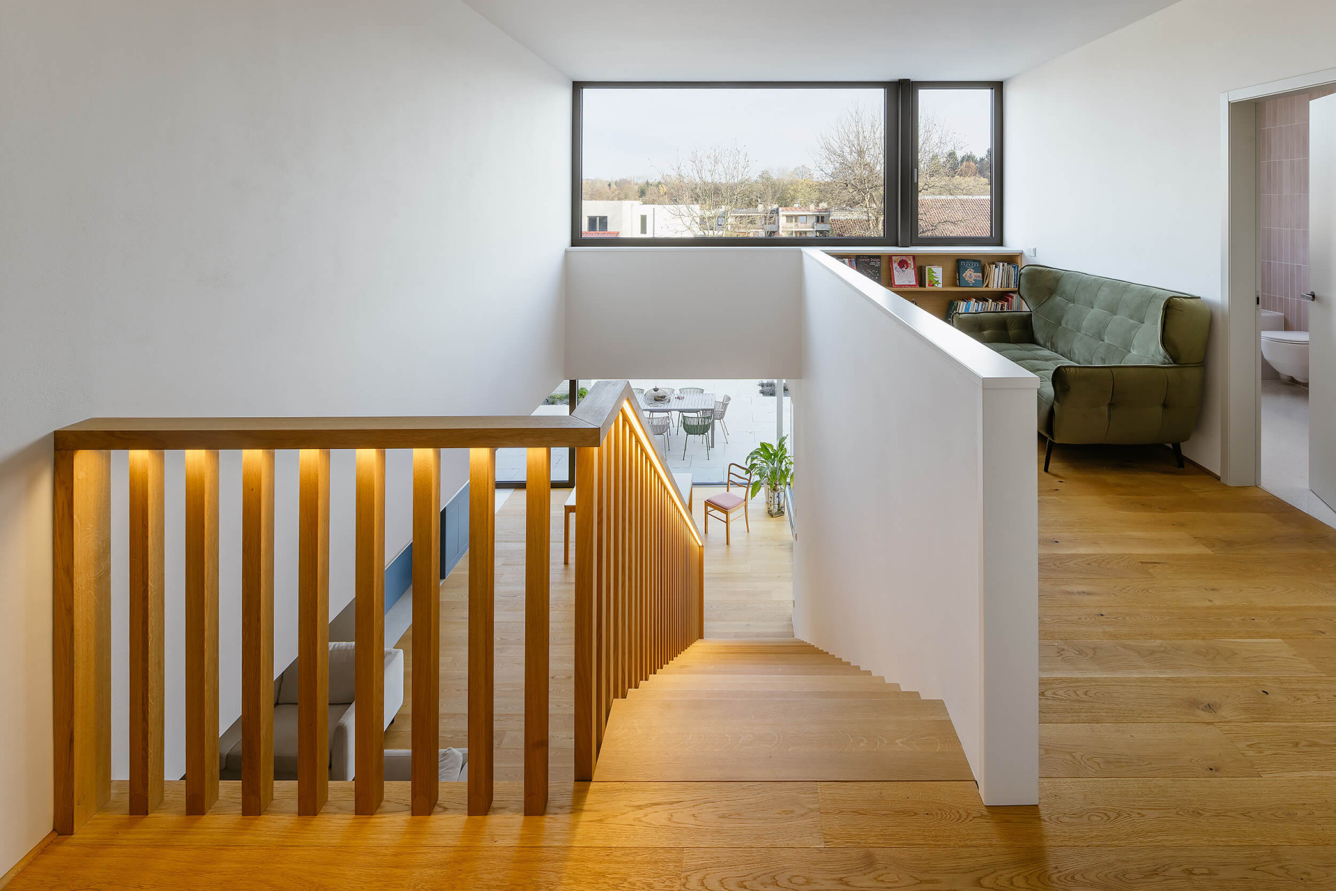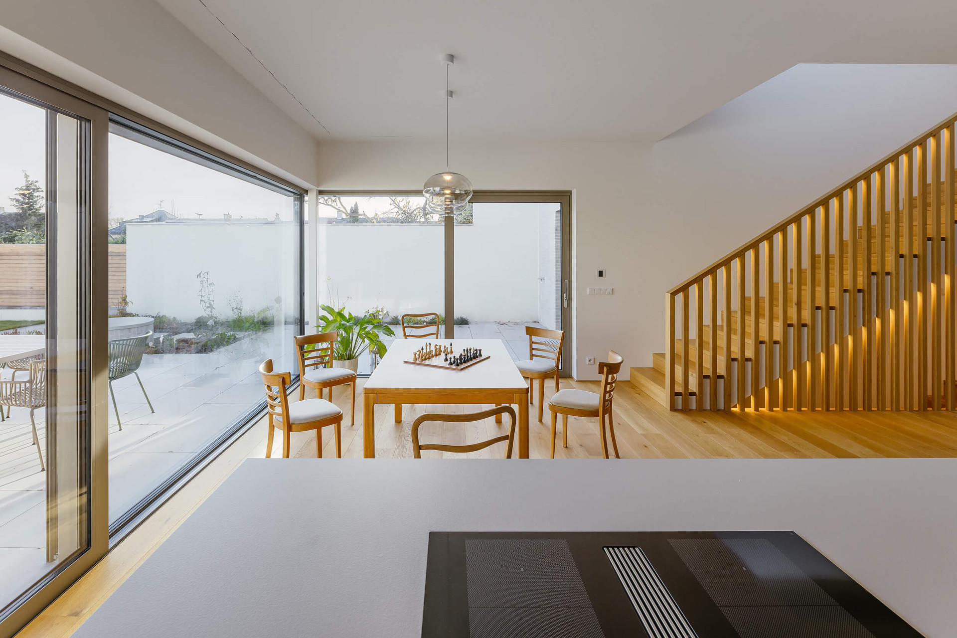 Přízemí má větší plochu a je rozšířené směrem do zahrady, s níž je propojené velkoplošným prosklením. „Po vstupu do domu se obytná část otevírá v celé své hloubce a v průhledu směřuje až do zahrady, která se tak stává přirozenou součástí každodenního života i atmosféry interiéru,“ popisuje architekt Vaněček a architektka Míšková. Na obývací pokoj navazuje terasa, z ní lze vyjít na zahradu – ačkoliv se jedná o úzký pruh mezi sousedními pozemky, mají tu majitelé dostatek soukromí.