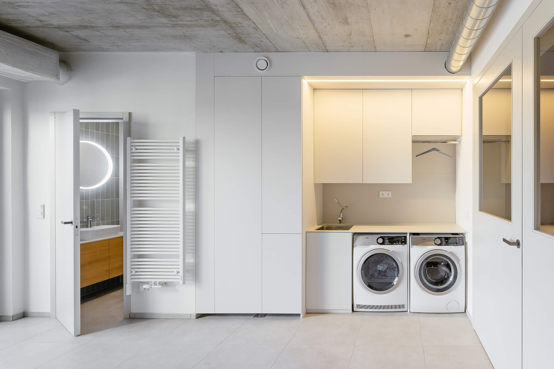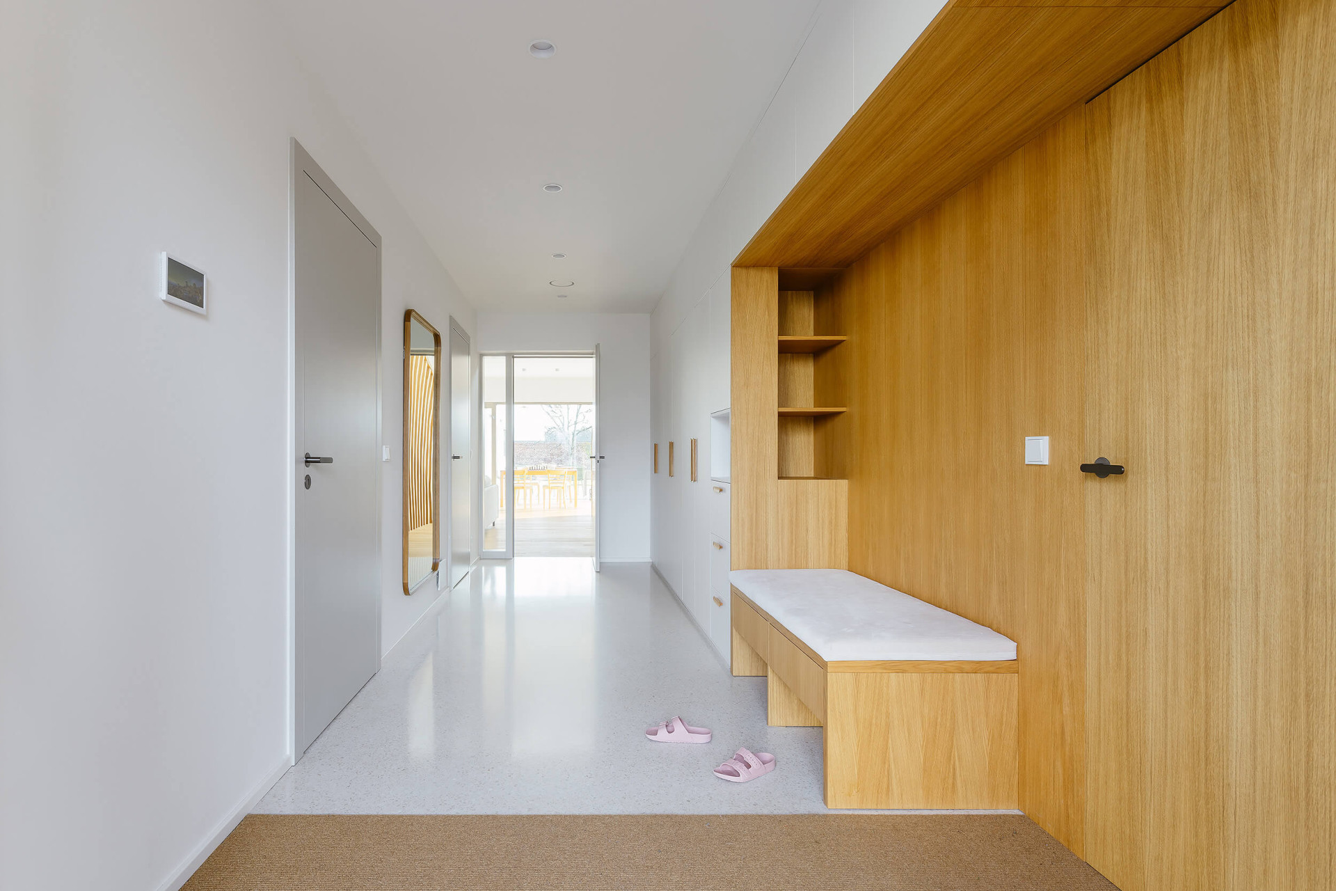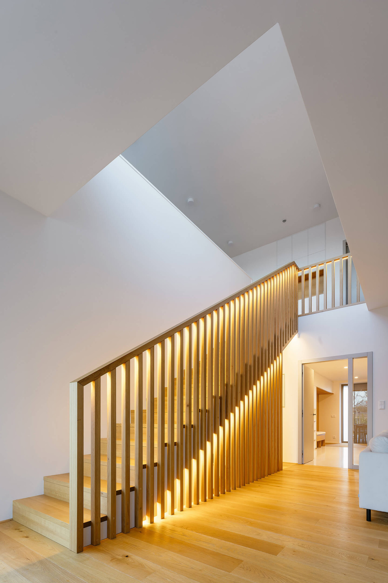 V přízemí je také pracovna a WC. Navazuje na ně garáž a technická místnost, z nichž se dá projít přímo do domu anebo na zahradu. V patře se nacházejí tři dětské pokoje, ložnice rodičů, koupelna a druhá toaleta. Našlo se místo i na „čtenářský koutek“ u okna nad schody. Schodiště má zábradlí z dřevěných latí. Ve dne ho nasvěcuje horní okno, večer je podsvíceno umělým světlem. Tento detail z něj dělá ozdobu a těžiště interiéru.