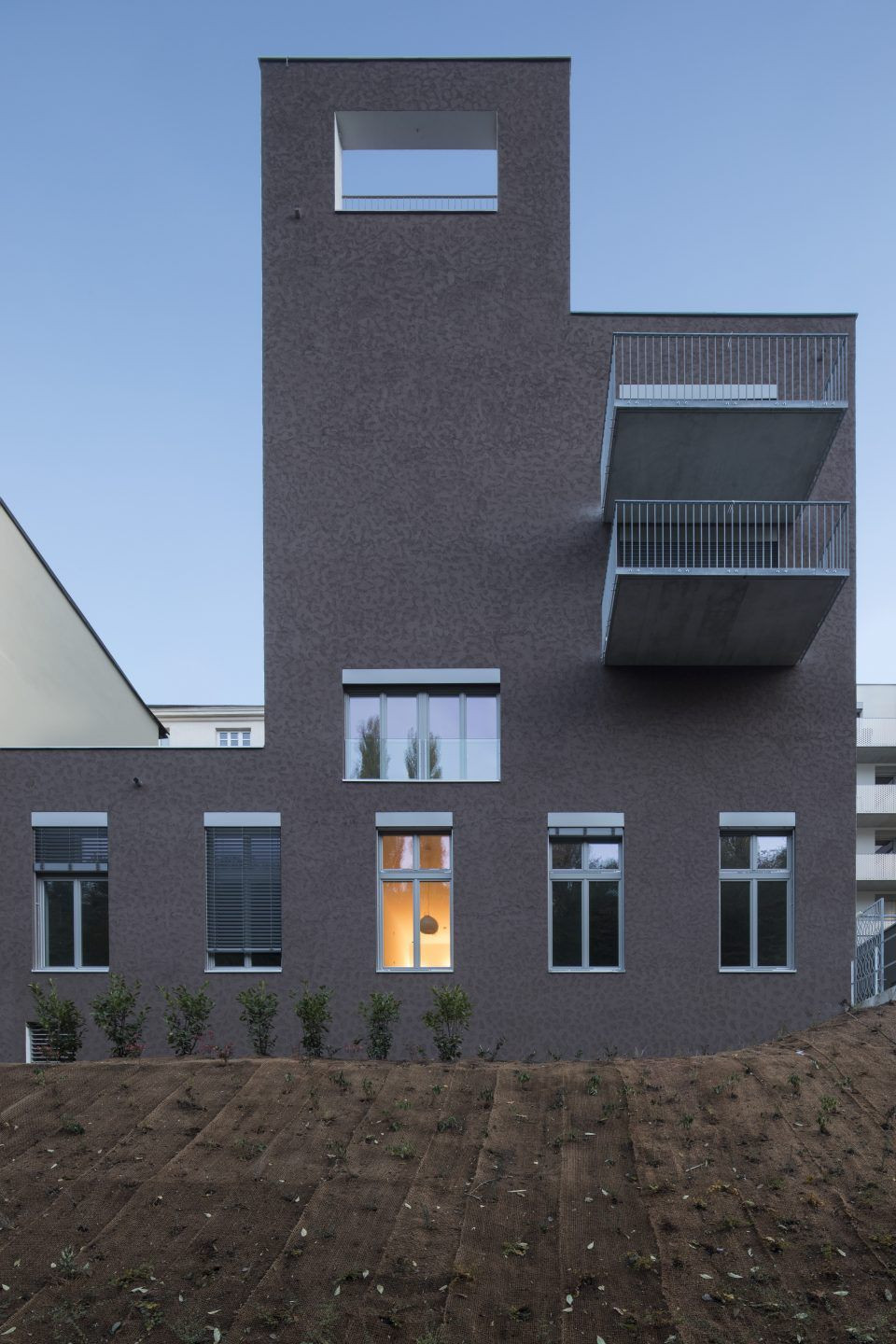 Je trochu retro, ale přesto chce být současný. Velikost zastavované parcely odpovídá dvěma až třem typickým žižkovským domům. Návrh proto rozděluje nový objem na 2 domy, které jsou téměř identické. Opticky se liší v použití barevného odstínu. Hlavní jižní a zadní severní fasáda je pojednána v tmavších odstínech. Vnitřní fasády jsou s ohledem na značně omezenou prosvětlenost bytů bílé. Hlavní fasáda domů je členěna rastrem, který je odrazem vnitřní dispozice.