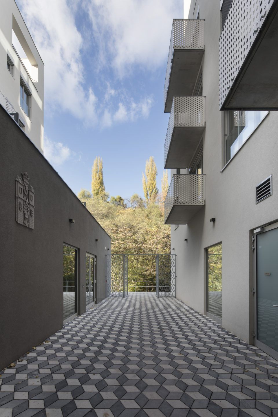 Místo objektu je na poměrně frekventované městské ulici. Kvalita místa spočívá v těsné blízkosti parku Vítkov na severní straně objektu, spolu s atraktivní, nově zbudovanou cyklostezkou, která nahradila bývalou trať ČD. Návrh proto vkládá do přízemí domu nový průchod, jako jasné gesto propojení s touto hodnotou. Průchod zároveň plní funkci prostorného vstupu (jakéhosi předpolí) do obou částí domu a cloní tak vstupní pasáže domu od frekventované ulice. Je rozšířením společných prostorů rezidentů.
