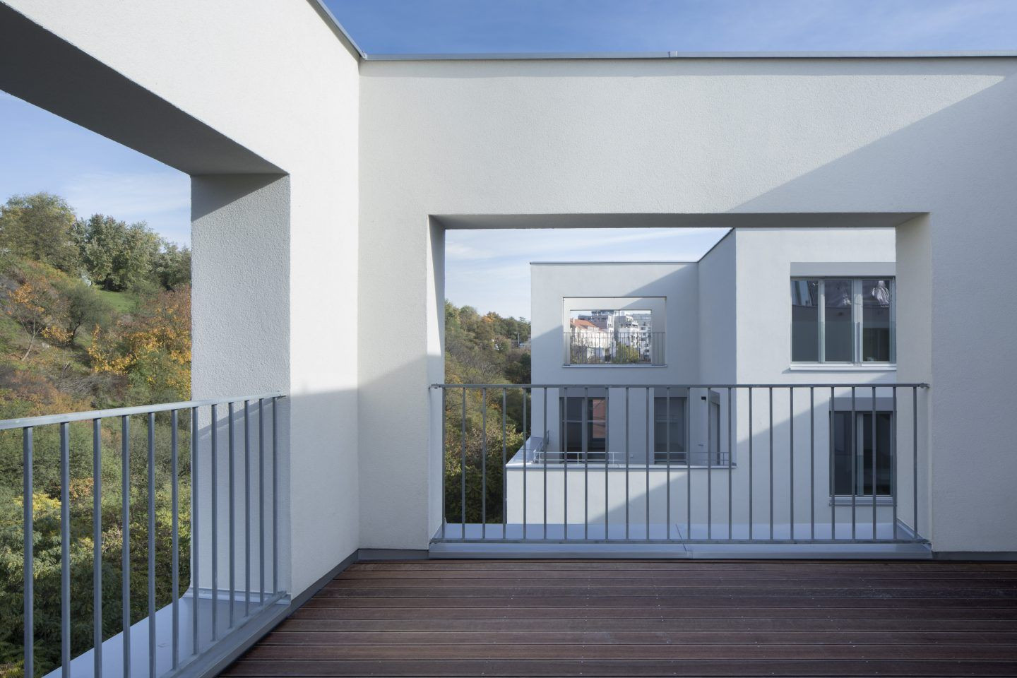 Proporce oken se přizpůsobují tradičním rozměrům oken, které jsou typické pro původní zástavbu v okolí. Vodorovné členění fasády naznačují horizontální subtilní římsy z plechu vloženého do zateplovacího systému fasády. Výrazným prvkem na čelní fasádě je dlouhý, vysunutý balkon v 5.np se zábradlím. Navozuje dojem horizontální římsy. Vzor zábradlí má ambici evokovat tradiční motivy inspirované ručně kovanými prvky pražského stavitelství přelomu 19. a 20. století.