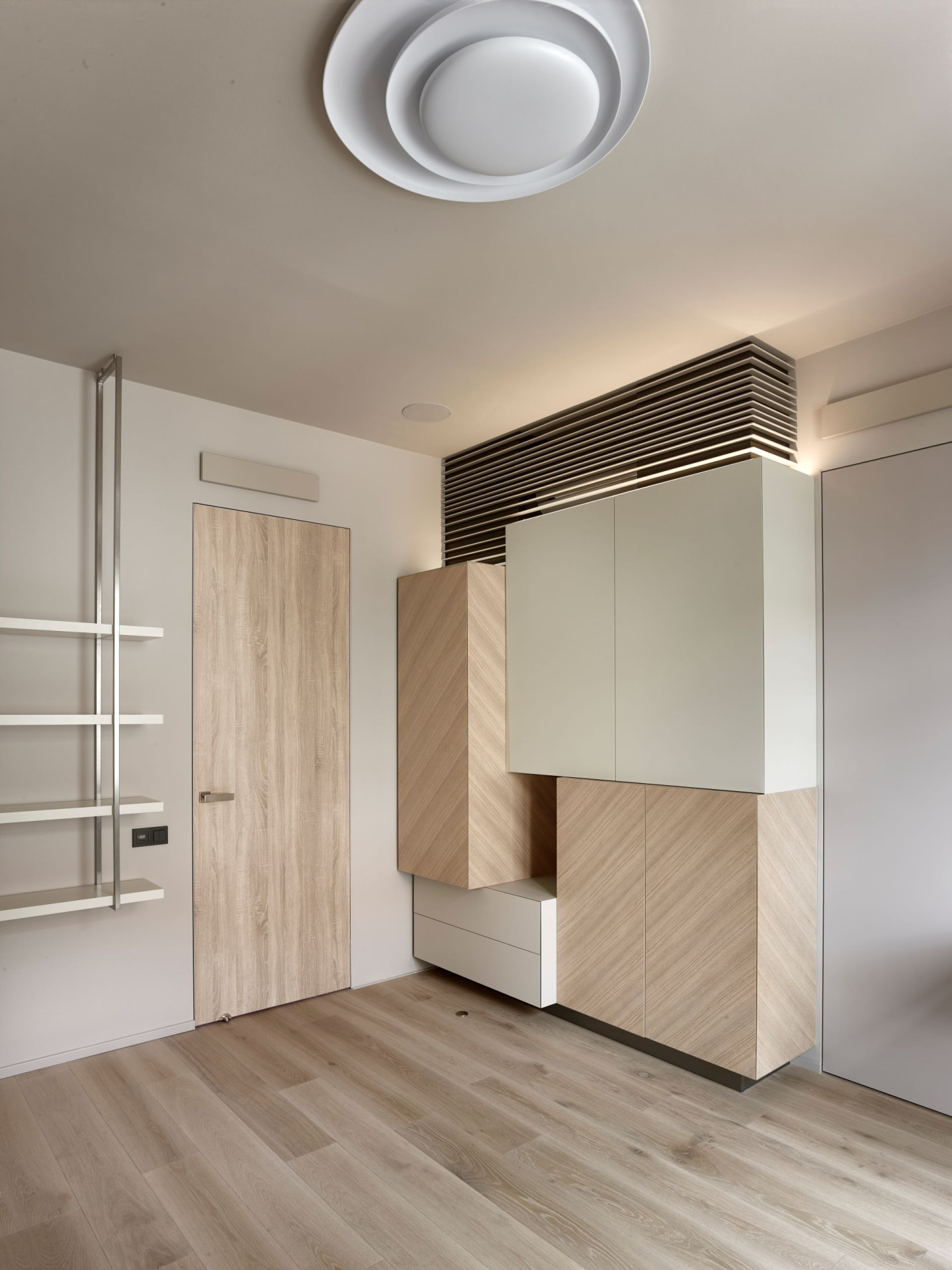 Základem jsou skryté zárubně, ty používám rád. Dali jsme jim jistou hierarchii: v obytných místnostech typu ložnice, obývák a pokoje jsme volili laminát, který imituje dřevo podlahy, u techničtějších místností jsme pak nechali dveře v podstatě splynout se stěnou, mají se v tom prostoru ztrácet. V některých bytech jsme na ně dokonce od podlahy po strop nalepili zrcadlo - staly se tak součástí celoskleněné stěny. Vyhráli jsme si i se zdánlivě malými detaily jako obklady v nerezovém plechu.