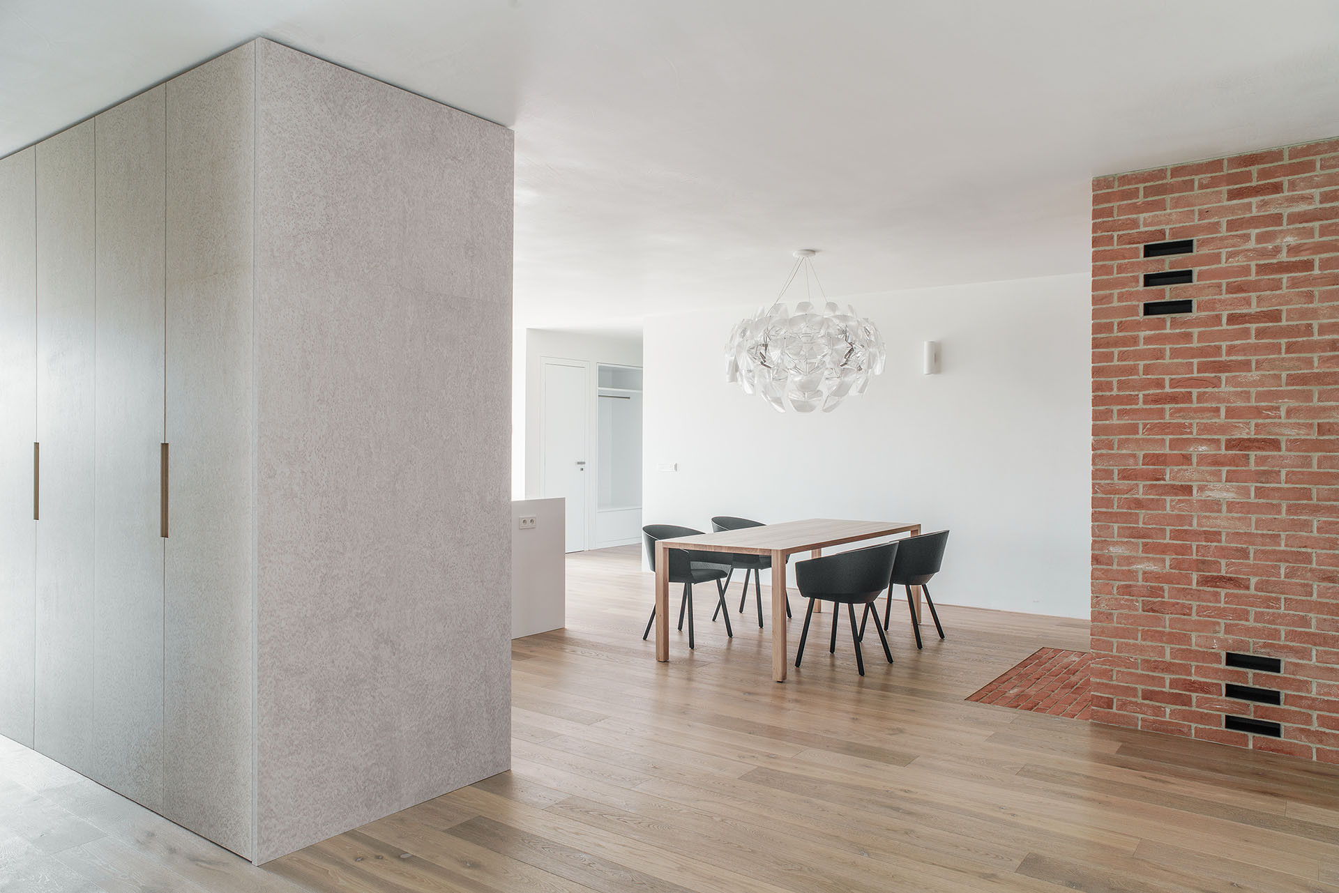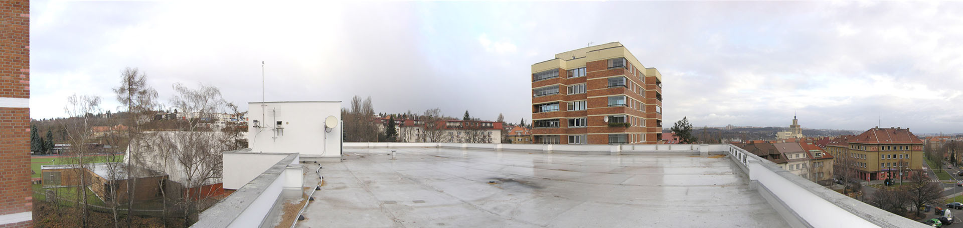 Samotná nástavba má užitnou plochu přes 200 m², pro čtyřčlennou rodinu je to tedy pohodlný byt, kam se vešlo vše podstatné: dva dětské pokoje, ložnice pro rodiče, dvě koupelny a šatna. To vše je „naskládané“ kolem hlavního obytného prostoru s kuchyní. „Hmota domu je tvořena pavilony soukromých místností (ložnice, šatny, koupelny) a zastřešeným prostorem mezi pavilony, který slouží jako obytná společenská část domu (kuchyně, obývací pokoj, pracovna, vstup) a velkými prosklenými plochami volně přechází do zahrady,“ popisuje koncept autorská zpráva. Společné prostory nabízejí výhledy na město.