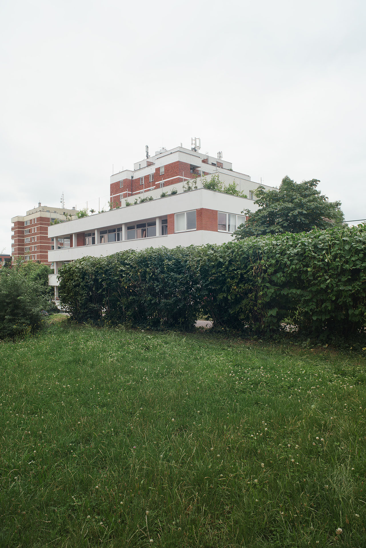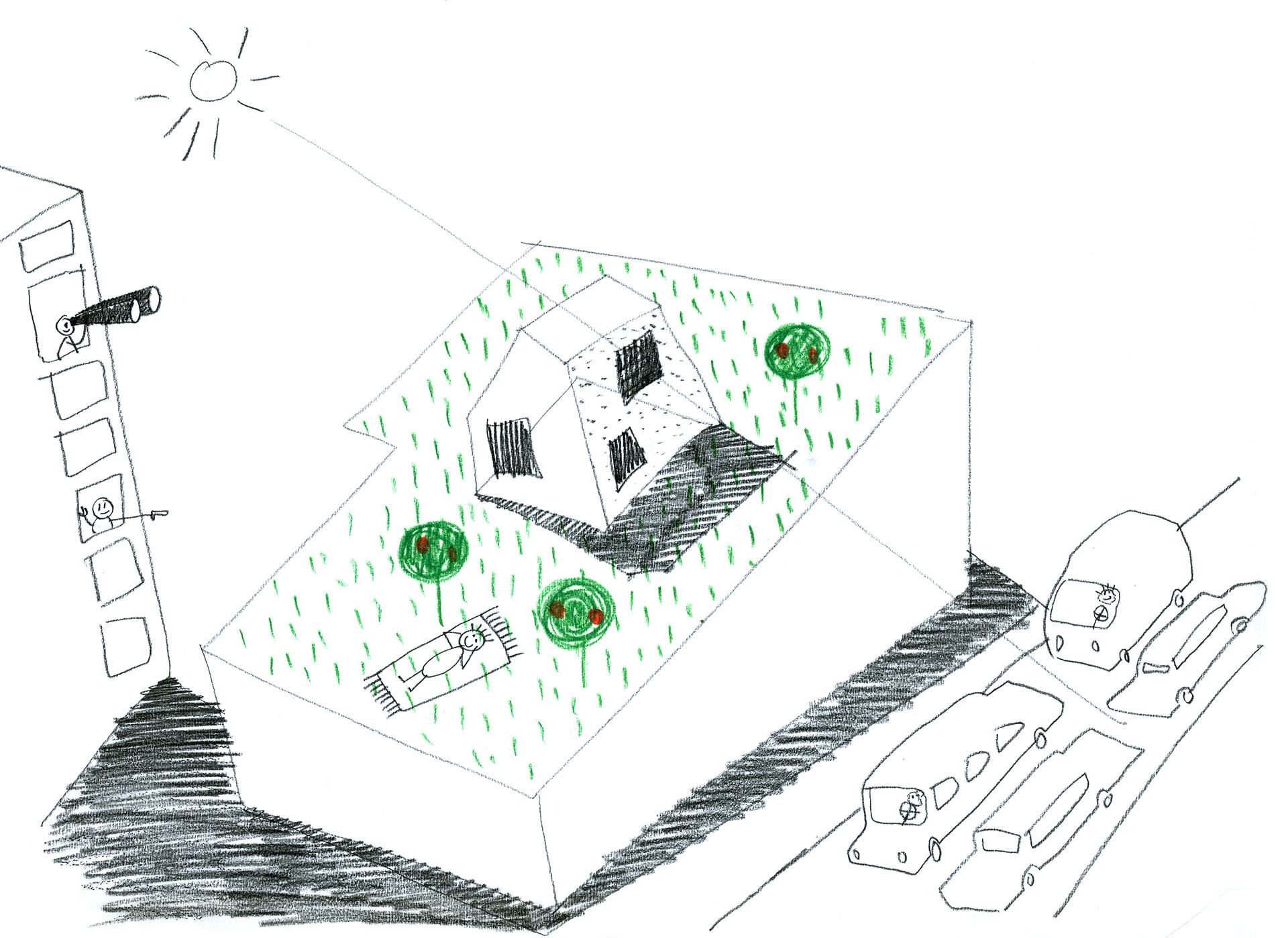 „Náš hlavní vklad byl asi právě tohle – přesvědčili jsme klienty, ať místo posledního patra udělají menší objem a zelenou střechu,“ říká Petr Nacházel. Důvodů bylo víc. Zaprvé je byt se zahrádkou příjemnější než bez. Zadruhé bylo potřeba dodržet odstupové vzdálenosti od sousedních domů, aby jim nová přístavba neubírala oslunění ani soukromí. „Vypočítali jsme optimální objem a vzniklý kvádr umístili na střechu,“ popisují architekti. Tak vznikl základní tvar domu, kolem pak zahrada se živým plotem po obvodu.