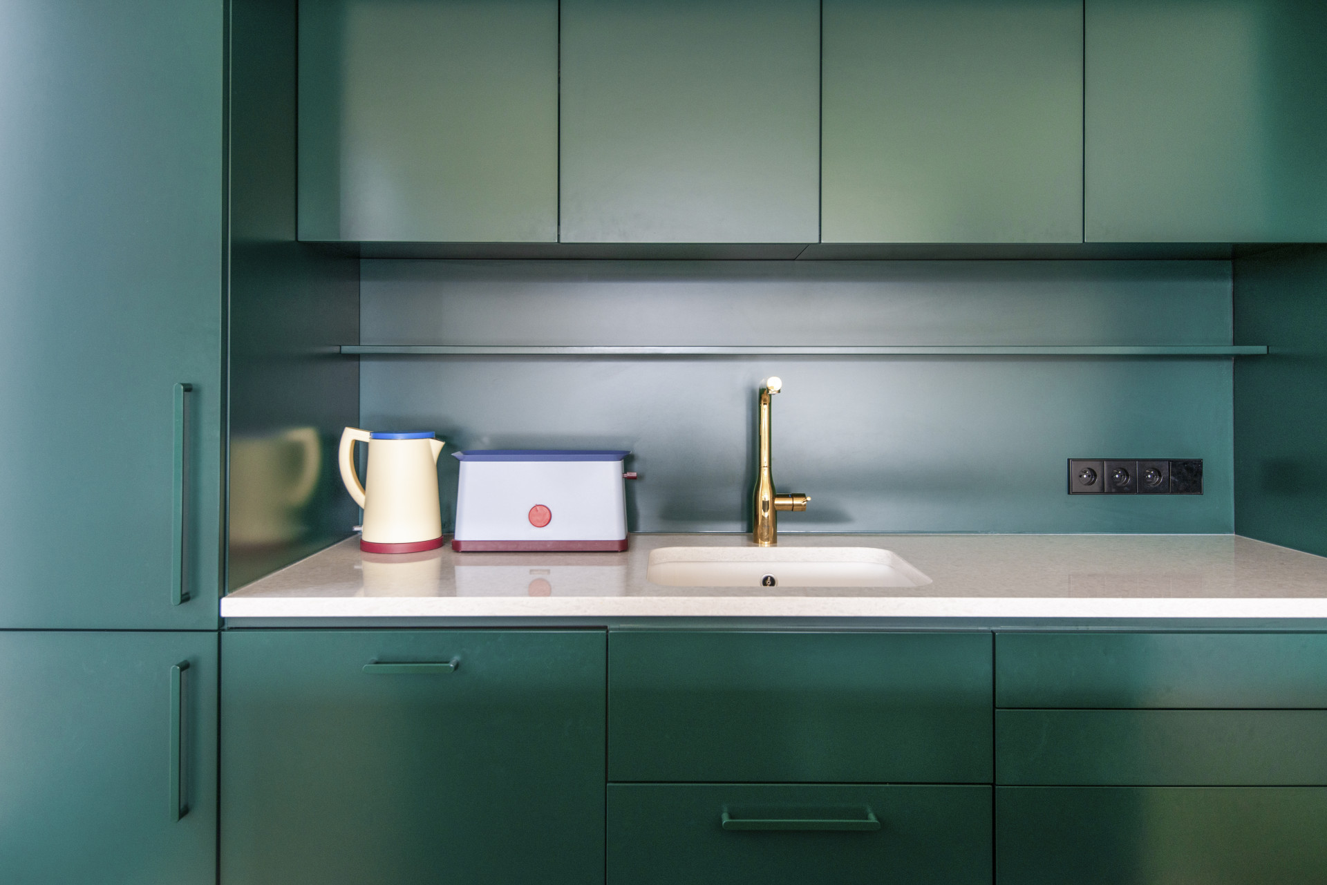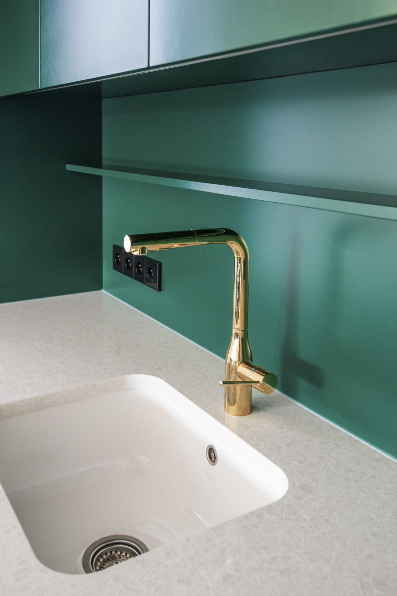 Kuchyňská linka podle návrhu BY architects má tmavě zelenou barvu, provedení je ale minimalistické, nemá téměř žádné úchytky, povrchy jsou hladké. „Kvalitní kuchyň je ta, která se dobře užívá. Musí být správně vysoká a nesmí jí chybět třeba ustoupený sokl,“ vysvětlují. Mezi jejich další praktické rady patří třeba nepoužívat dřevěné pracovní desky tam, kde se pracuje s vodou nebo využít externího motoru digestoře, aby v místnosti nevznikal hluk.
