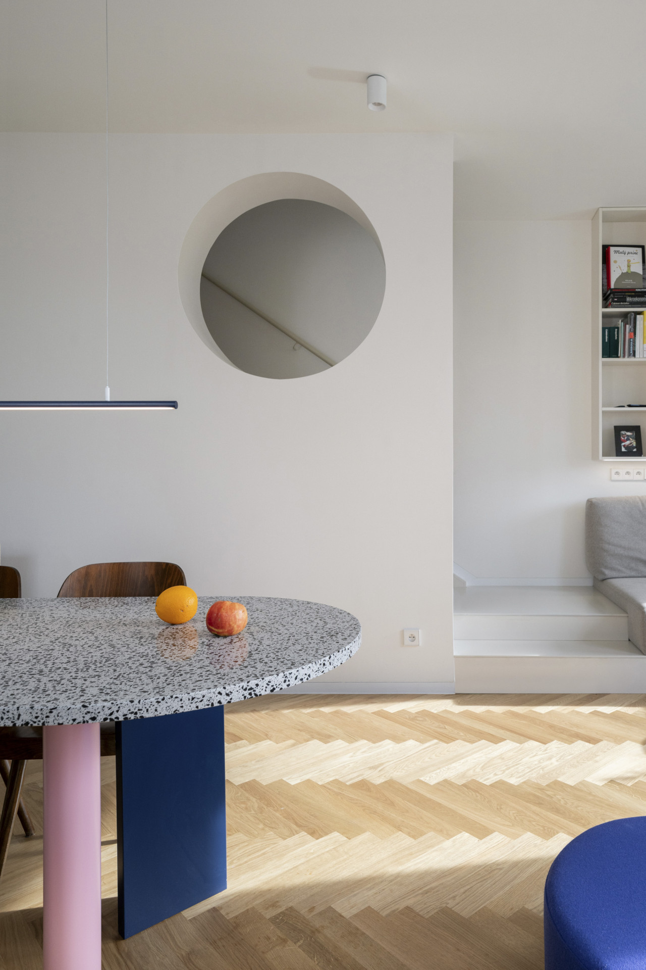 Markéta Zdebská a Marek Žáček navrhovali rekonstrukci stavby včetně nových interiérů. K těm Zuzana Záhorová říká, že chtěli být odvážní, ale zároveň dojít výsledku, který budou mít (možná) na celý život. Vsadili proto na kvalitní řešení i materiály. „Náročnost klientů pak vedla k tomu, že jsme interiér navrhli včetně atypického stolu s barevnými nohami a deskou z tvrzeného kamene TechniStone,“ dodávají architekti. Stůl slouží jako jídelní a nachází se v obývacím pokoji propojeném s kuchyní. Jeho konstrukce má výraznou barevnost, deska zase texturu – v tomto duchu se ostatně nesou všechny interiéry v domě. Bylo však třeba docílit harmonie, a právě proto klienti tak úzce spolupracovali s architekty.