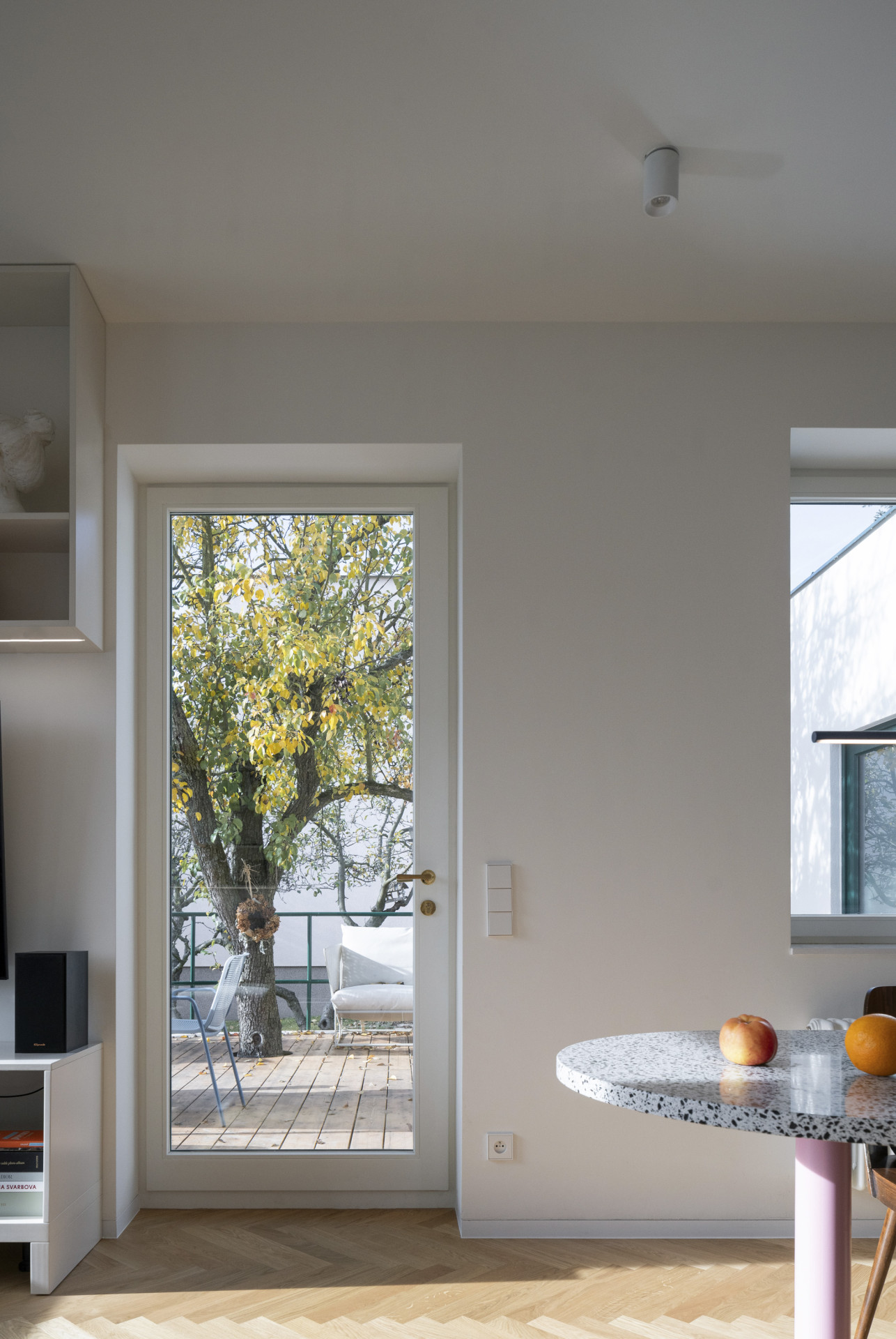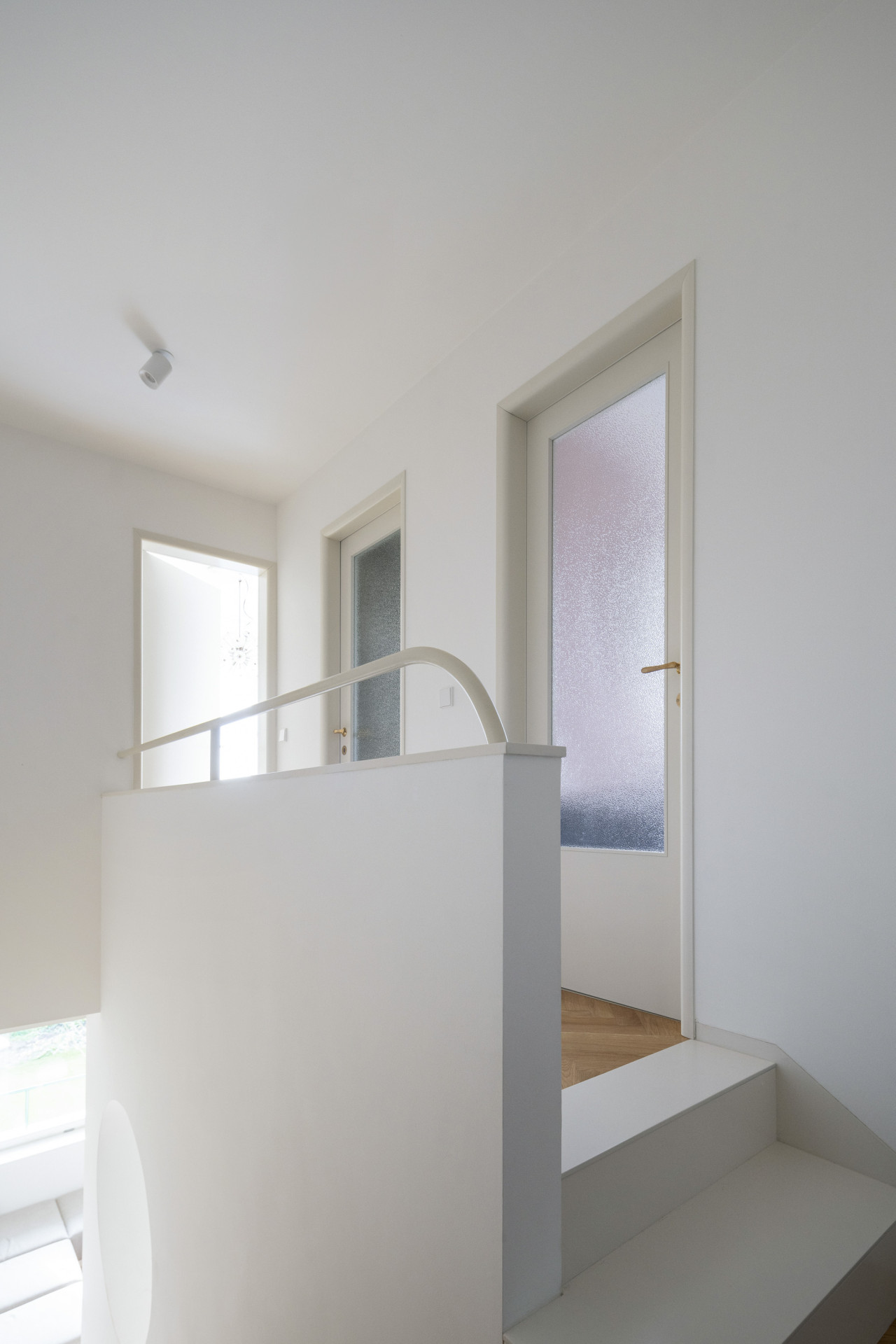 Kancelář BY architects navrhla rekonstrukci domu, jejímž výsledkem měla být „oáza míru“ – aspoň tak to popsala klientka Zuzana Záhorová. S výsledkem, který byl jí a její rodině navržen na míru, je spokojená. „Velmi se mi líbí detaily jako například zábradlí, jsou replikami těch původních a dokonale odkazují ke stylu, ve kterém byl dům v 50. letech navržen,“ říká. Na mysli má petrolejově zelená exteriérová zábradlí, která kontrastují s bílou fasádou domu. Ta je dokonce zateplená, každopádně tak, aby to nebylo poznat – minimální vrstvou nadstandardně účinné izolace, díky které se podařilo domu zachovat jeho elegantní proporce.