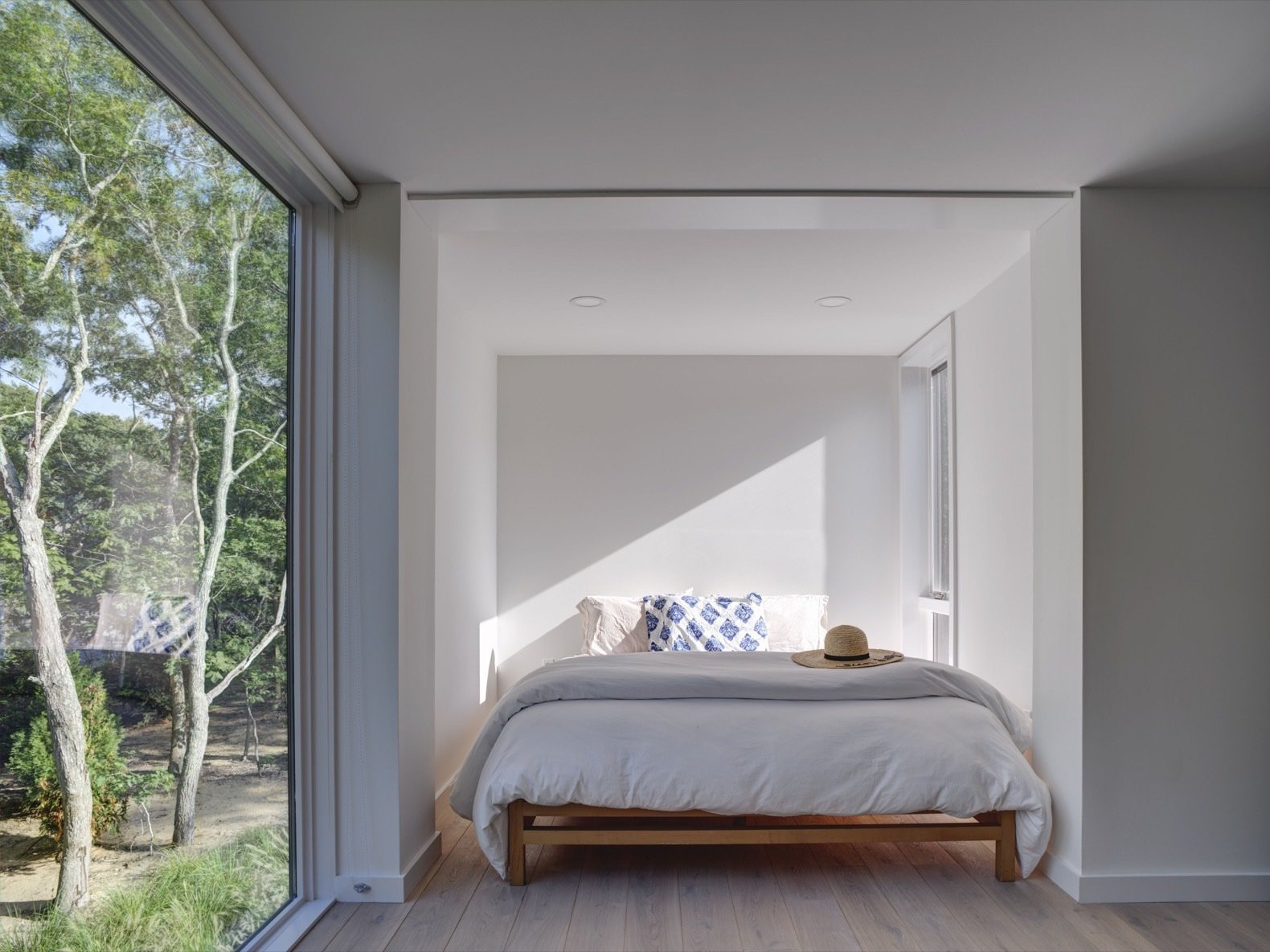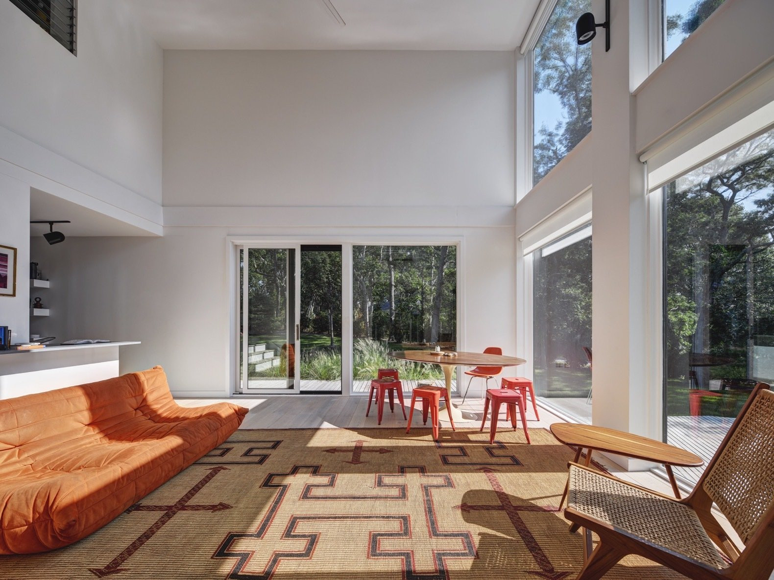 Dům pro pětičlennou rodinu sestavili architekti celkem ze 6 lodních kontejnerů – majitelé si přáli 4 samostatné ložnice se třemi koupelnami. Nechybí tu ani převýšený obývací prostor s kuchyní, jehož celoprosklené průčelí doslova propojuje interiér s velkou zalesněnou zahradou.