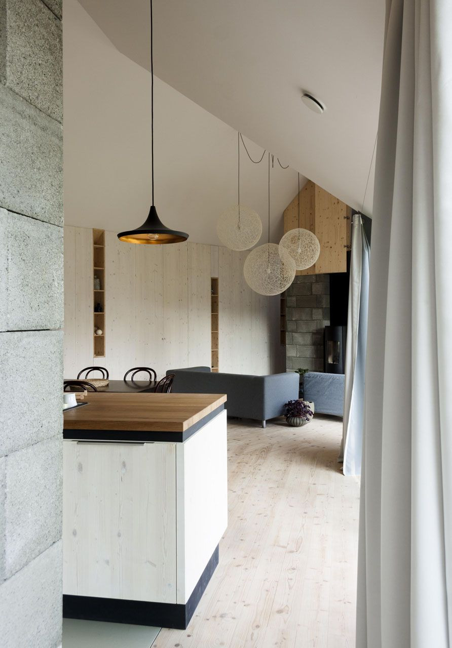 Samotný dom je koncipovaný ako plynúci a otvorený jednopodlažný priestor, do ktorého sú zasadené technické a obslužné priestory v dvoch nosných jadrách nazvaných "kockami". Centrom domu je jedálenský stôl okolo ktorého sa po stranách nachádza kuchynská a obývacia časť s kozubovými kachľami. Pozdĺž severnej steny až do rodičovskej spálne prebieha 14 metrov dlhá šatníková skriňa. Izby nad „kockami“, presvetlené strešnými oknami, slúžia ako flexibilné priestory, využívané ako napr. pracovňa, hosťovská izba, relaxačný priestor alebo skrýša a herňa pre deti. Ľahkú drevenú obvodovú konštrukciu domu dopĺňajú a stužujú centrálne umiestnené nosné betónové steny a oceľové stĺpiky, ktoré sú súčasťou fasády. Exteriér domu je obložený neošetreným smrekovcom. Komfort v interiéri bol dosiahnutý použitím výhradne masívnych drevených konštrukcií, povrchov a doplnkov zo smrekového dreva.