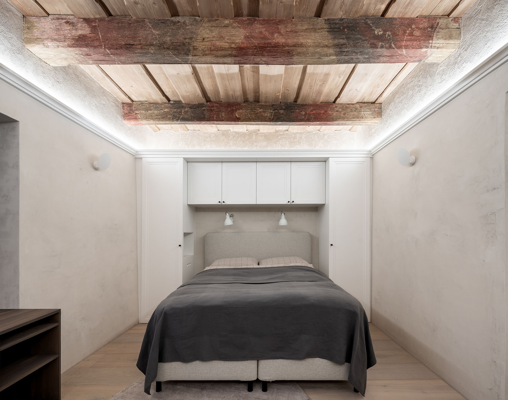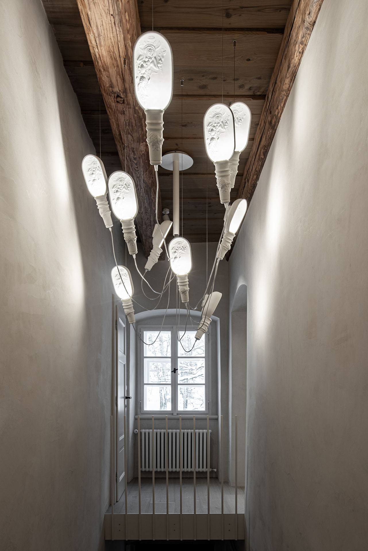 Horní patro je zcela jiné. Jsou tady dřevěné konstrukce, na podlaze původní prkna ručně vykartáčovaná a naolejovaná do šedého tónu. V tomto patře jsou také zrestaurovaná kachlová kamna. Podlaha před kamny byla doplněna půdovkami (cihelná dlažba) z bazaru. Na stropě jsou trámové stropy s malbami. „Z nich byl odstraněn bílý nátěr a původní malby byly restaurovány pomocí reaktivních mořidel. Všechny tyto malované stropy jsme nepřímo osvětlili a v ložnicích tak vznikl velmi příjemný světelný efekt,“ vysvětlují architekti.