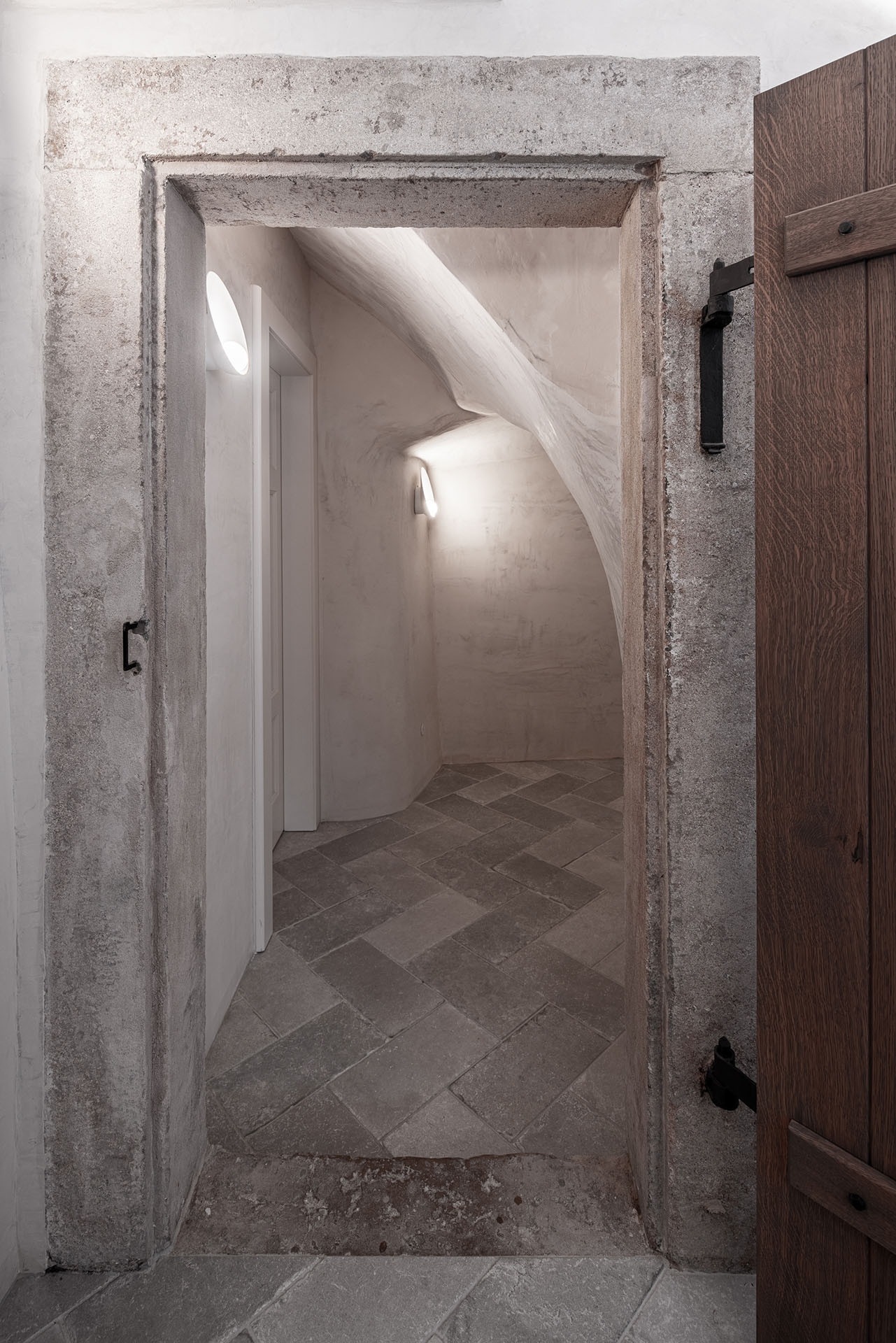 Spodní patro je nejstarší a je součástí středověkých hradeb - kamenné zdi jsou tu silné skoro metr. Jak to u takových objektů bývá, bylo tu ale velmi vlhko. Proto architekti navrhli zdi osekat, aby mohly konstrukce dýchat. Obnažené zdivo zkombinovali se sanačními omítkami a také s omítkami gletovanými a leštěnými. Průchody mocnými zdmi jsou orámovány voskovanou ocelí. Dohromady to tvoří hru povrchů a struktur.