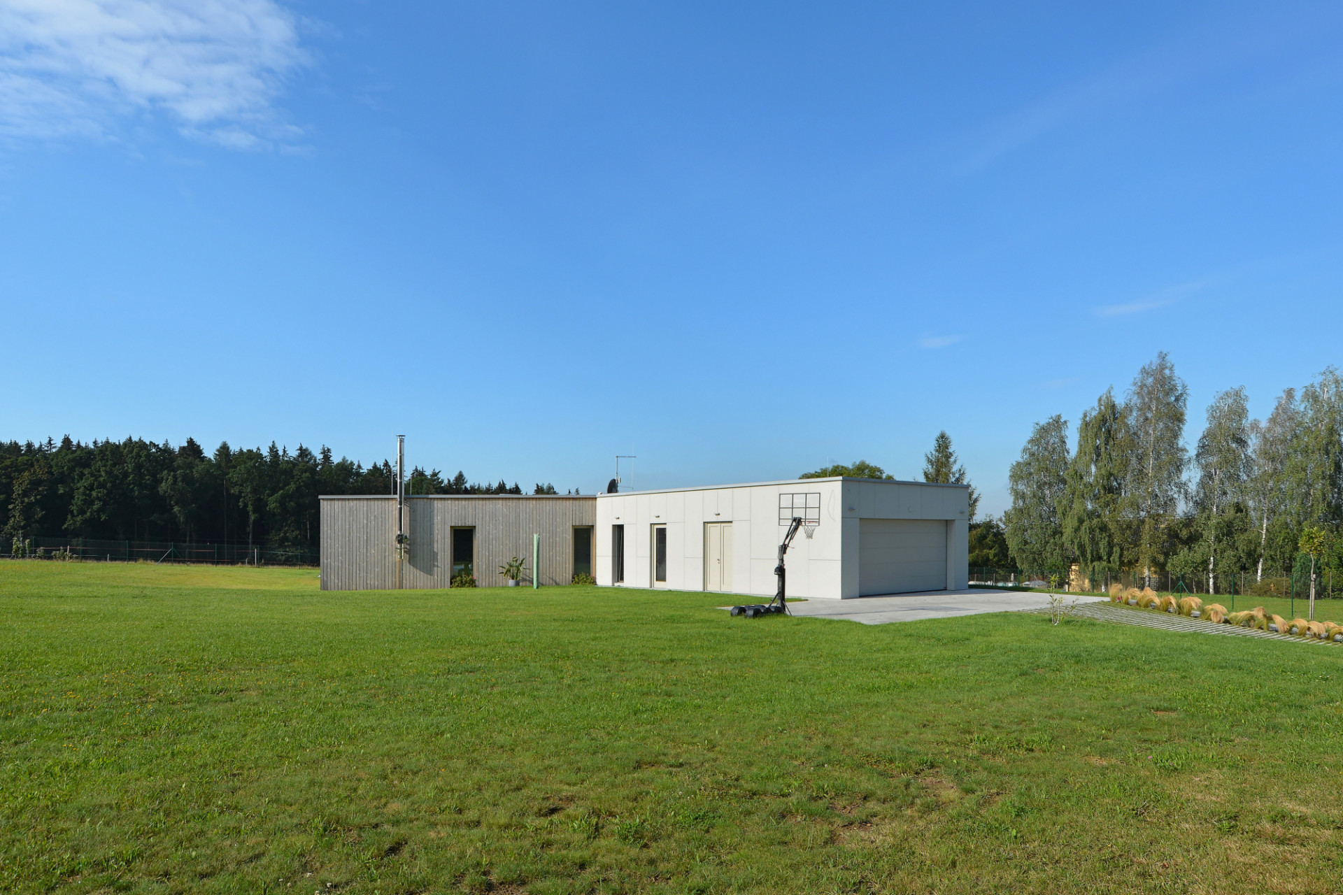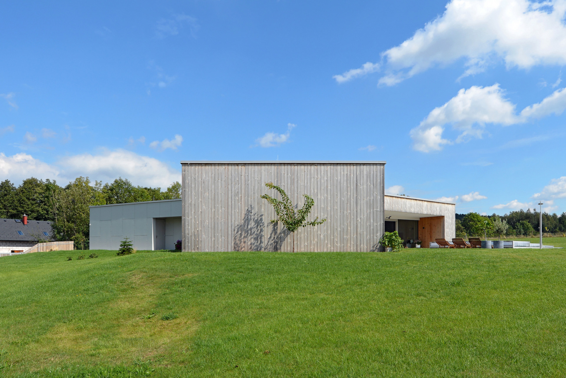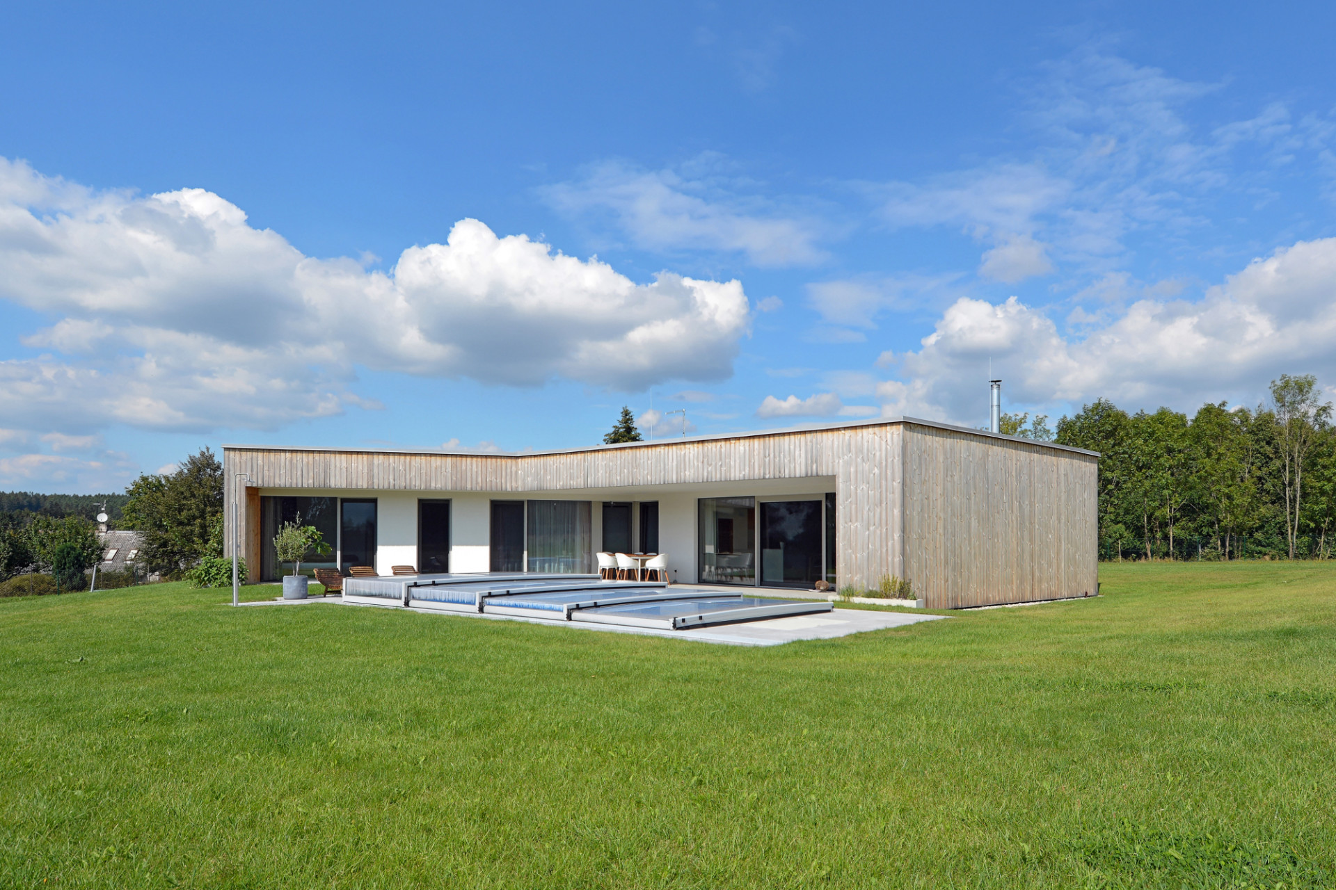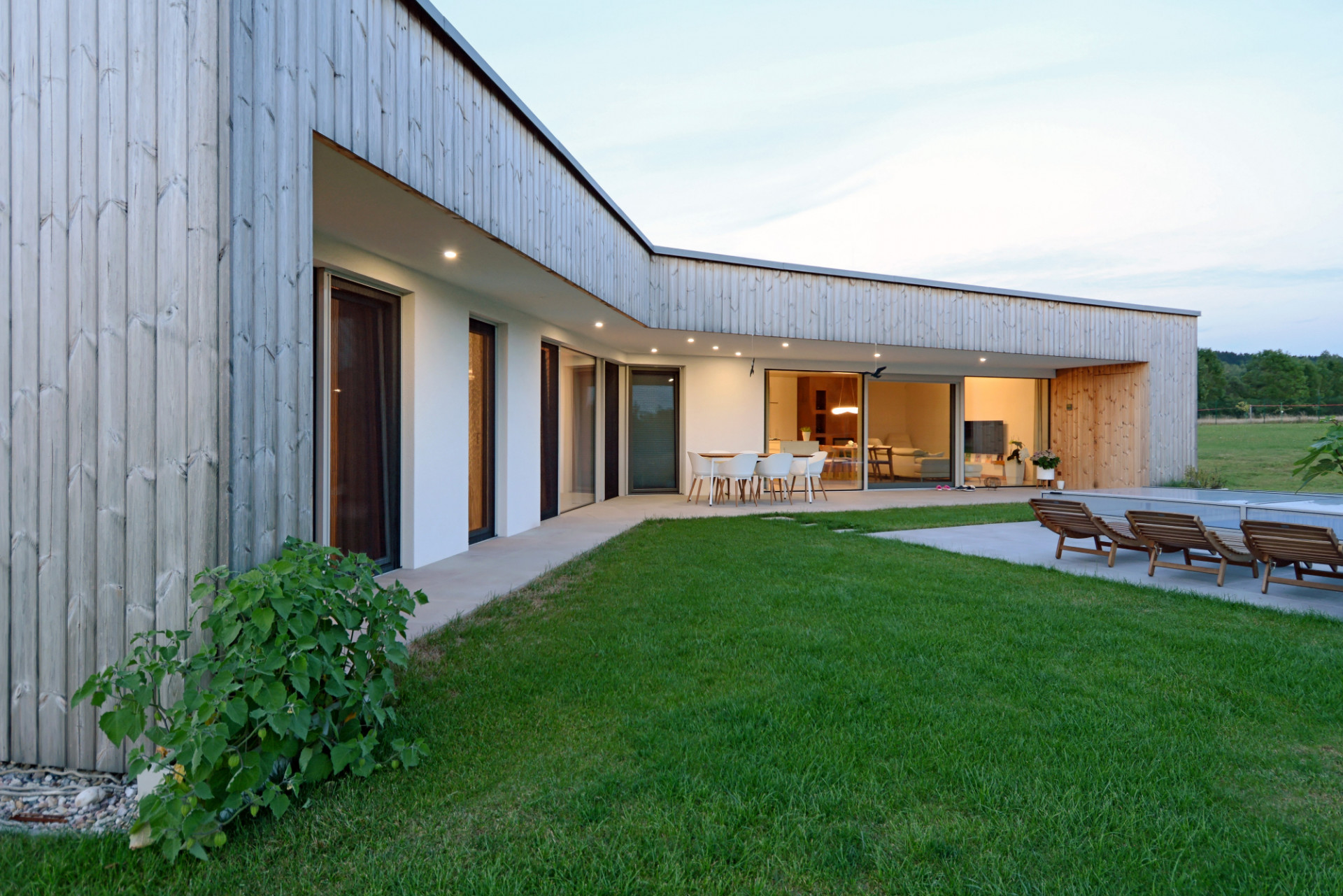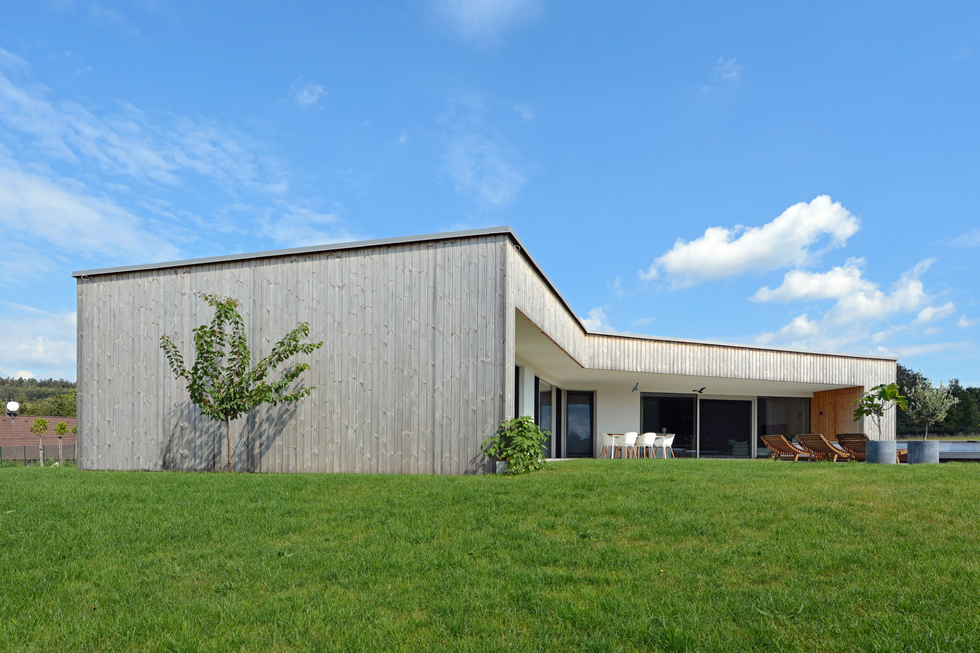 Jednopodlažní rodinný dům na rovinatém pozemku na Náchodsku uspořádal architekt Viktor Vlach do tvaru symetrické trojcípé hvězdy, čímž vznikly jednotlivé funkčně oddělené zóny v interiéru i zahradě. Dům zahalený zčásti do dřevěného pláště nabízí majitelům také prostornou krytou terasu s výhledy do krajiny.