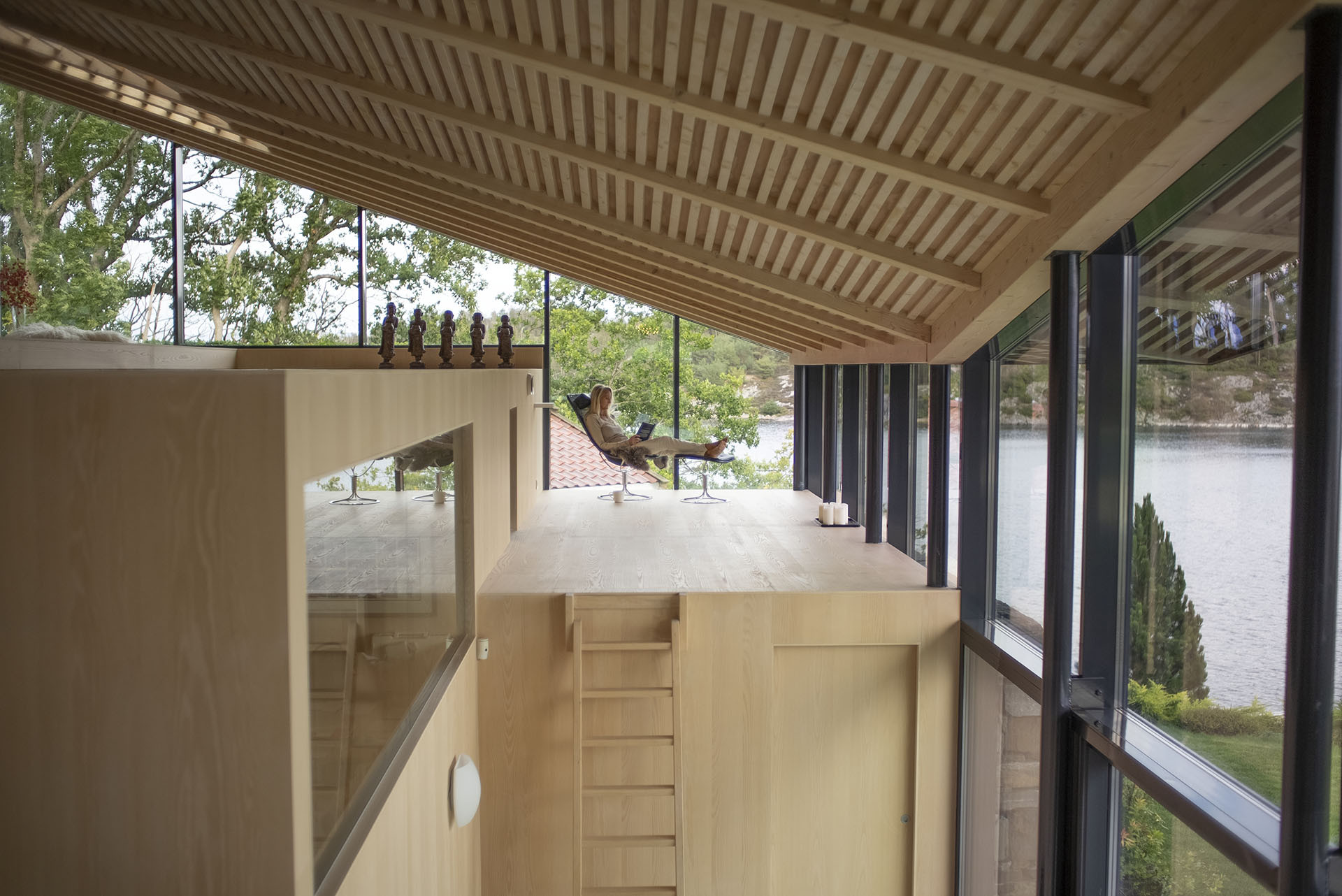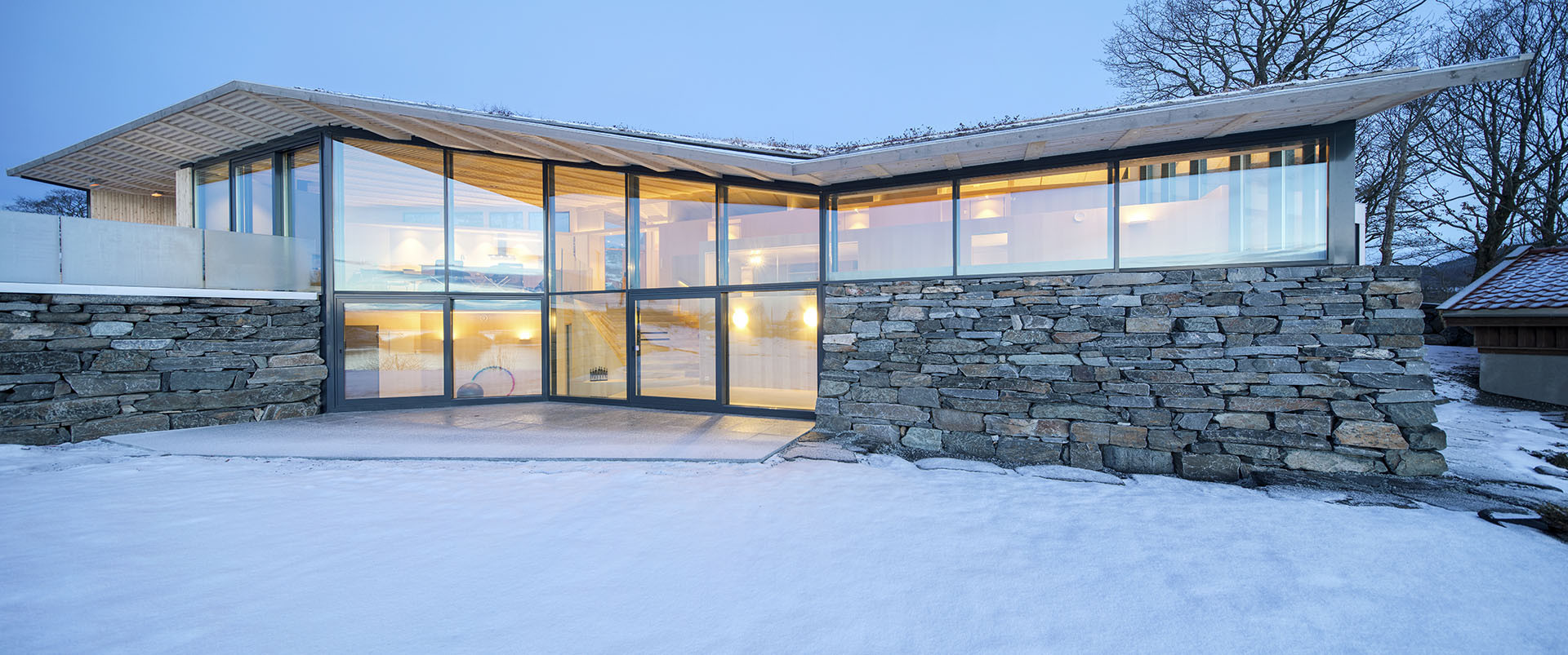 Přání klienta navrhnout dům jako přirozené pokračování jeho okolí zohlednila architektonická kancelář Helen & Hard i při navrhování vnitřních prostor a interiér pojala jako krajinu v krajině. Tato koncepce vás osloví, jakmile vstoupíte do domu. Od vchodu v nejvyšším podlaží se před vámi rozvětvuje úchvatná schodišťová konstrukce, která prostupuje čtyřmi patry domu jako vějíř. Schody vyrobené převážně z jasanového dřeva a skla dominují otevřenému interiéru a vytvářejí jeho strukturu. S mnoha výstupky a výklenky jsou jakousi ozvěnou skalních útvarů. V pravé části domu se nachází kuchyň a jídelna s terasou, levé křídlo s ložnicemi a koupelnami je určeno pro hosty. O tři schody níže se otvírá obývací část, kde vás obejme úchvatný panoramatický výhled. Prostory až do tohoto bodu jsou koncipovány jako společné. O další patro níže je situován hlavní soukromý obytný prostor s ložnicemi, koupelnami, kanceláří a samostatným vchodem. Prostory pro relaxaci, jako je televizní místnost, posilovna či sauna, se nacházejí u paty schodiště.