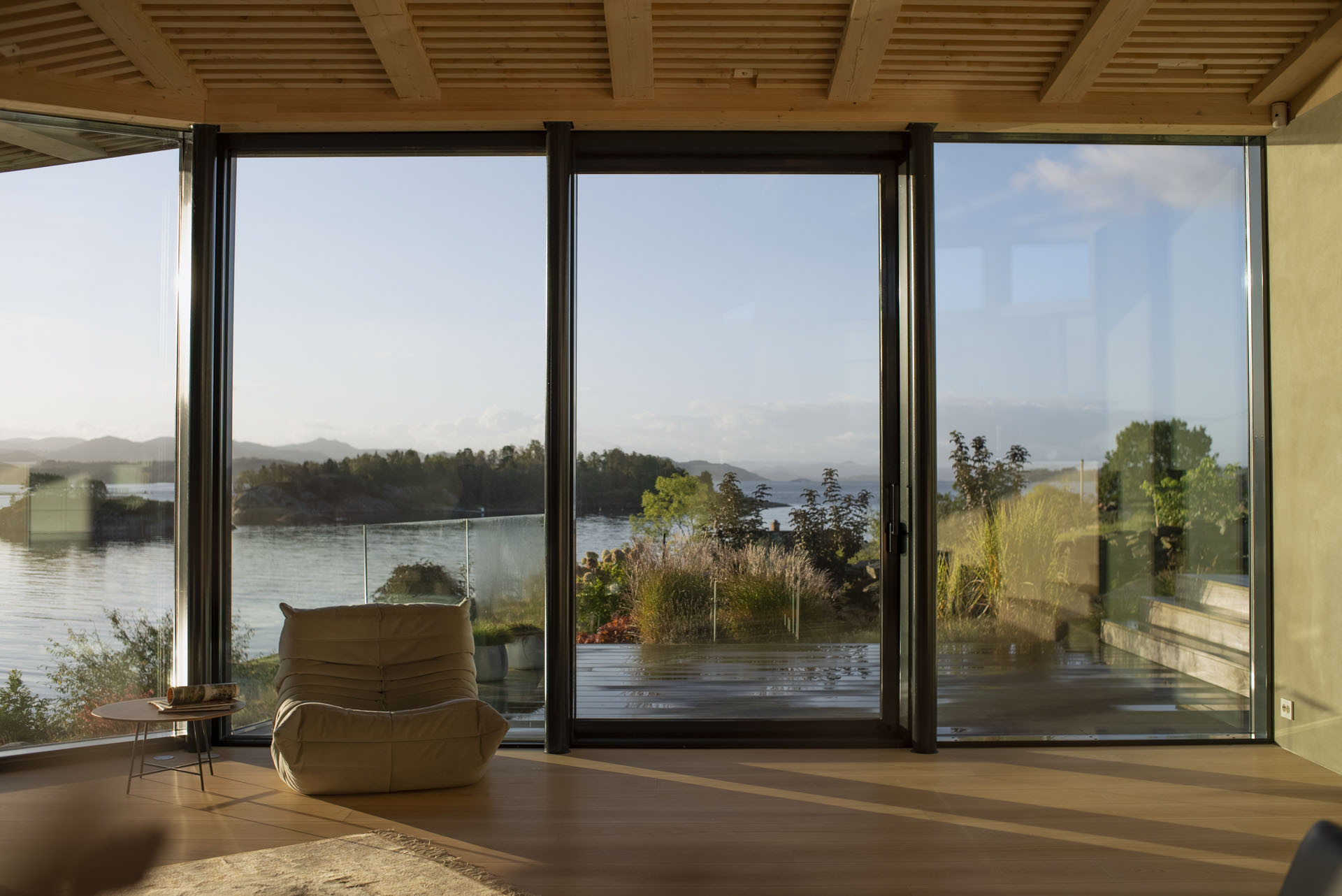 Exponované umístění domu ve svahu u moře znamenalo, že skleněné prvky musely odolat extrémnímu větru a dešti. Architekti proto zvolili stabilní a vůči venkovním povětrnostním vlivům odolné hliníkové okenní a posuvné systémy Schüco AWS 70.HI (High Insulated). Ke stabilitě domu přispívá i fasádní systém Schüco FWS 50.HI. Tato fasáda, která harmonicky ladí se zdvižně posuvným systémem Schüco ASS 70.HI, umožňuje výstavbu velkoplošných skleněných konstrukcí s vysokou odolností proti větru a vodotěsností. Některá skla dosahují až k okapu střechy, což v kombinaci se strmým pozemkem představovalo skutečnou výzvu pro realizační firmu. Ale výsledná elegance a transparentnost domu znamená, že robustnost okenních systémů je sotva patrná. Se svými štíhlými profily zasklení ustupují do pozadí a umožňují přírodě – obloze, skalám a vodě – stát se středem pozornosti.