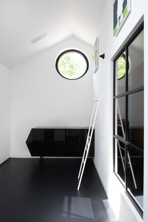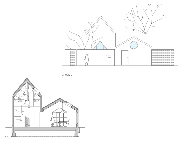 Jeden z objektů je nižší a druhý vyšší. Do domu se vchází tím nižším, původně to měla být garáž, ale slouží jako velká šatna a sklad. V křížení obou hmot je hlavní obývací prostor s pohovkou, jídelním stolem a kuchyní. V druhém, vyšším „stavení“, je ložnice a v podkroví ještě pracovna.